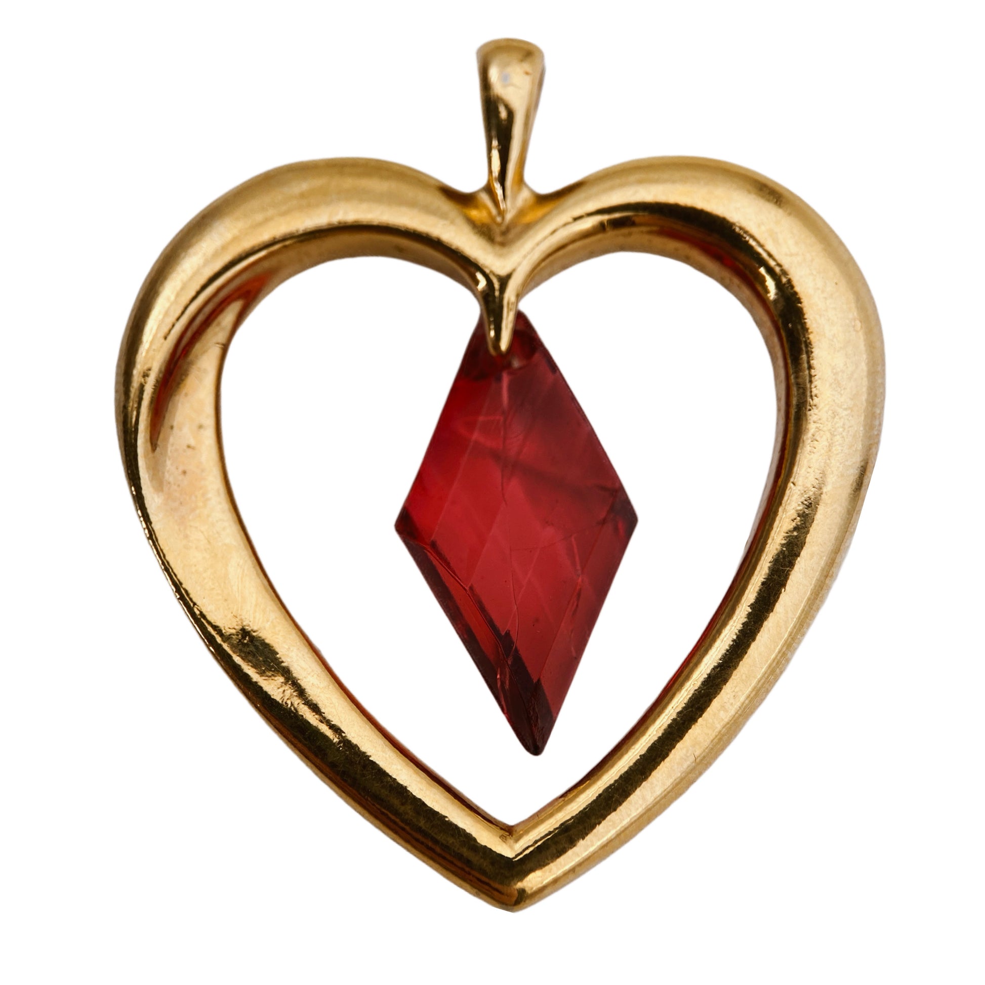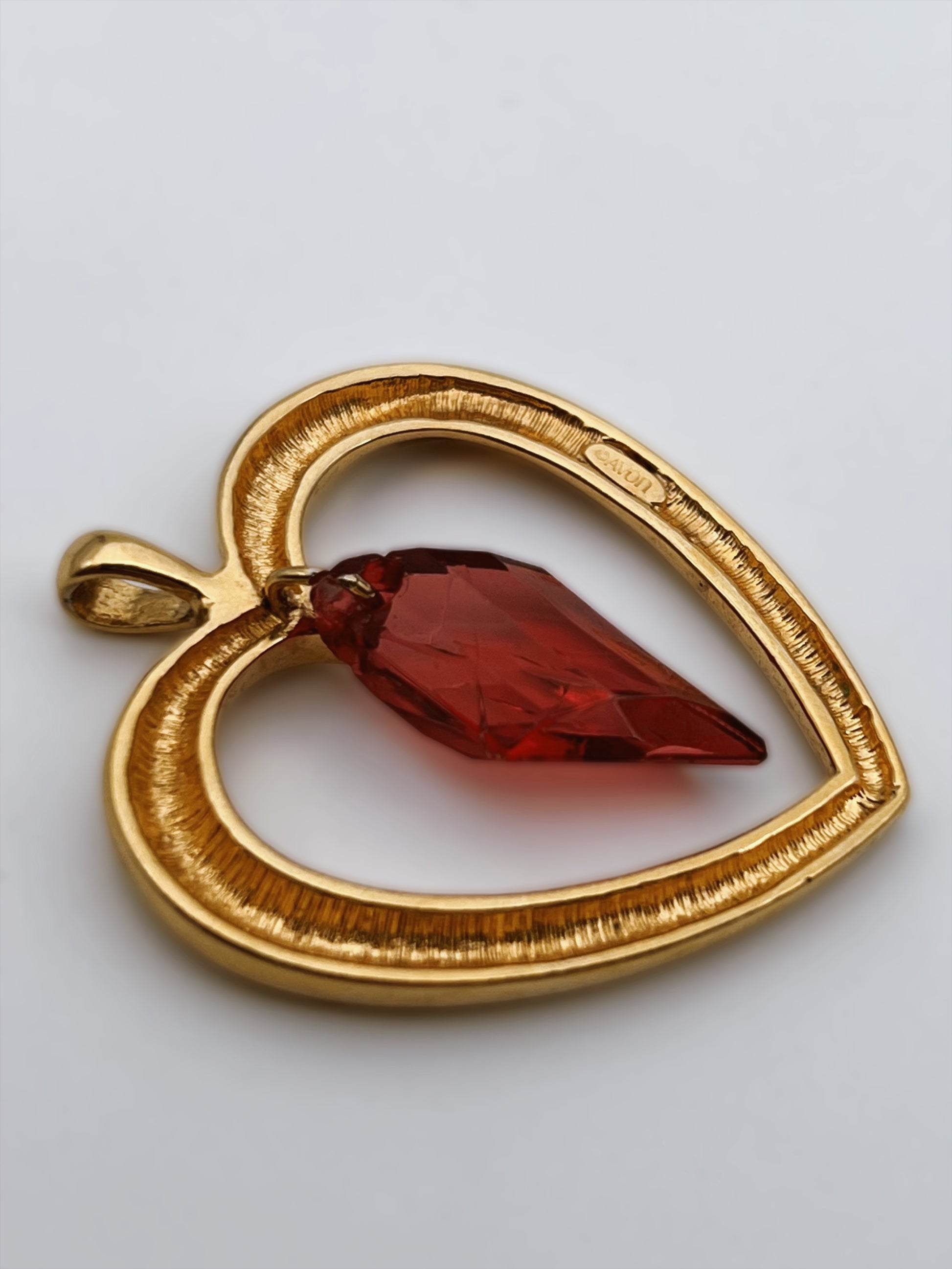 Tai “Avon” širdelės formos pakabukas su pakabintu raudonu, rombo formos akrilo akmenuku. Šis papuošalas greičiausiai datuojamas 1980–1990 m., kai “Avon” siūlė sentimentalius ir dovanoms pritaikytus dizainus, dažnai su širdžių, gėlių ar simbolinių formų motyvais.