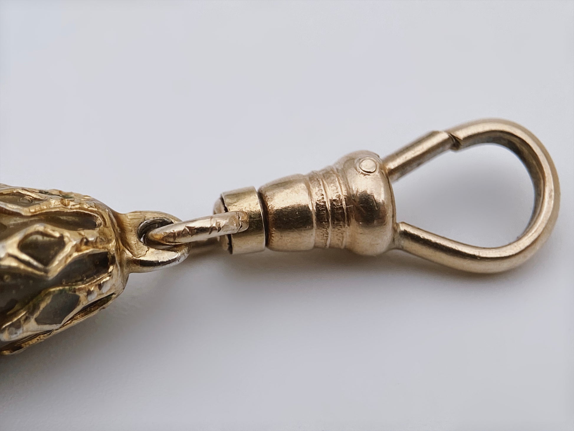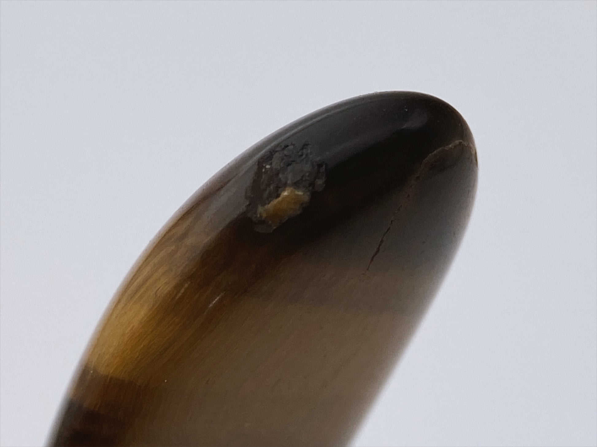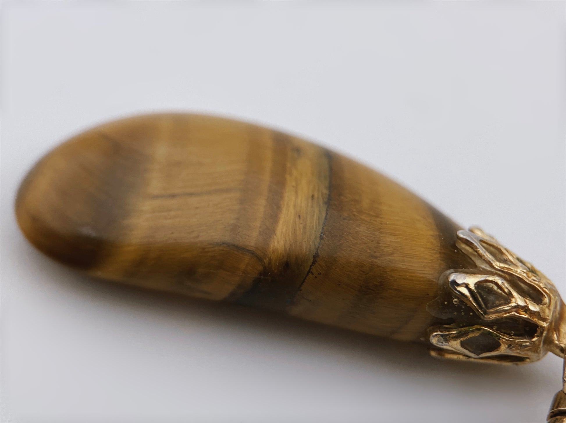 Stilingas vintažinis pakabukas iš natūralaus tigro akies mineralo. Akmuo šlifuotas organiška lašo / rago forma, išryškinanti jo auksines–rudas juostas ir būdingą šilkinį „katės akies“ efektą. Viršutinė akmens dalis dekoruota ažūriniu auksu užpildyto metalo laikikliu, kuris užtikrina spalvos sodrumą ir patvarumą. Sukamas karabino tipo užsegimas leidžia lengvai prisegti prie grandinėlės, apyrankės ar raktų pakabuko.