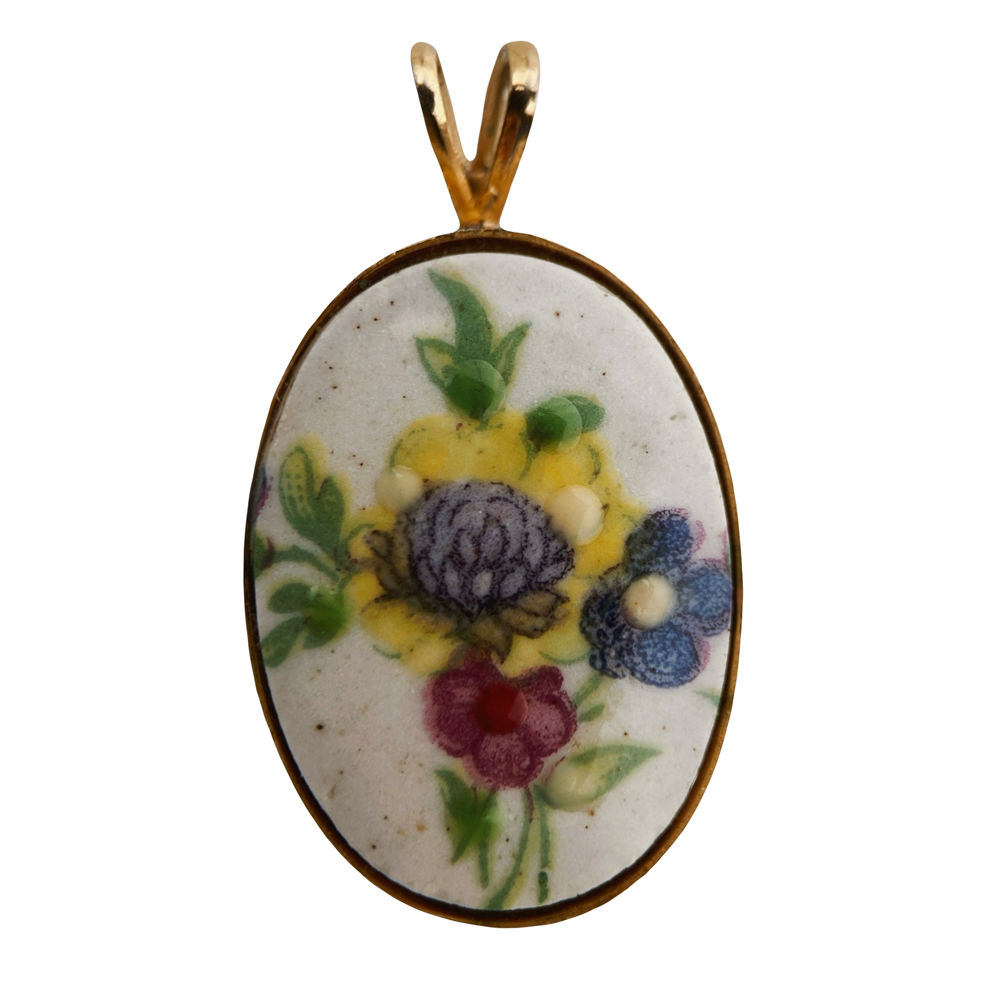 Šis pakabukas yra dekoruotas porceliano intarpu su gėlių motyvu, įrėmintas aukso spalvos rėmelyje.
