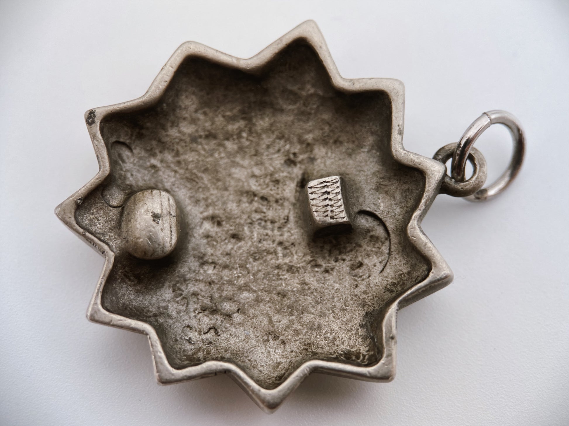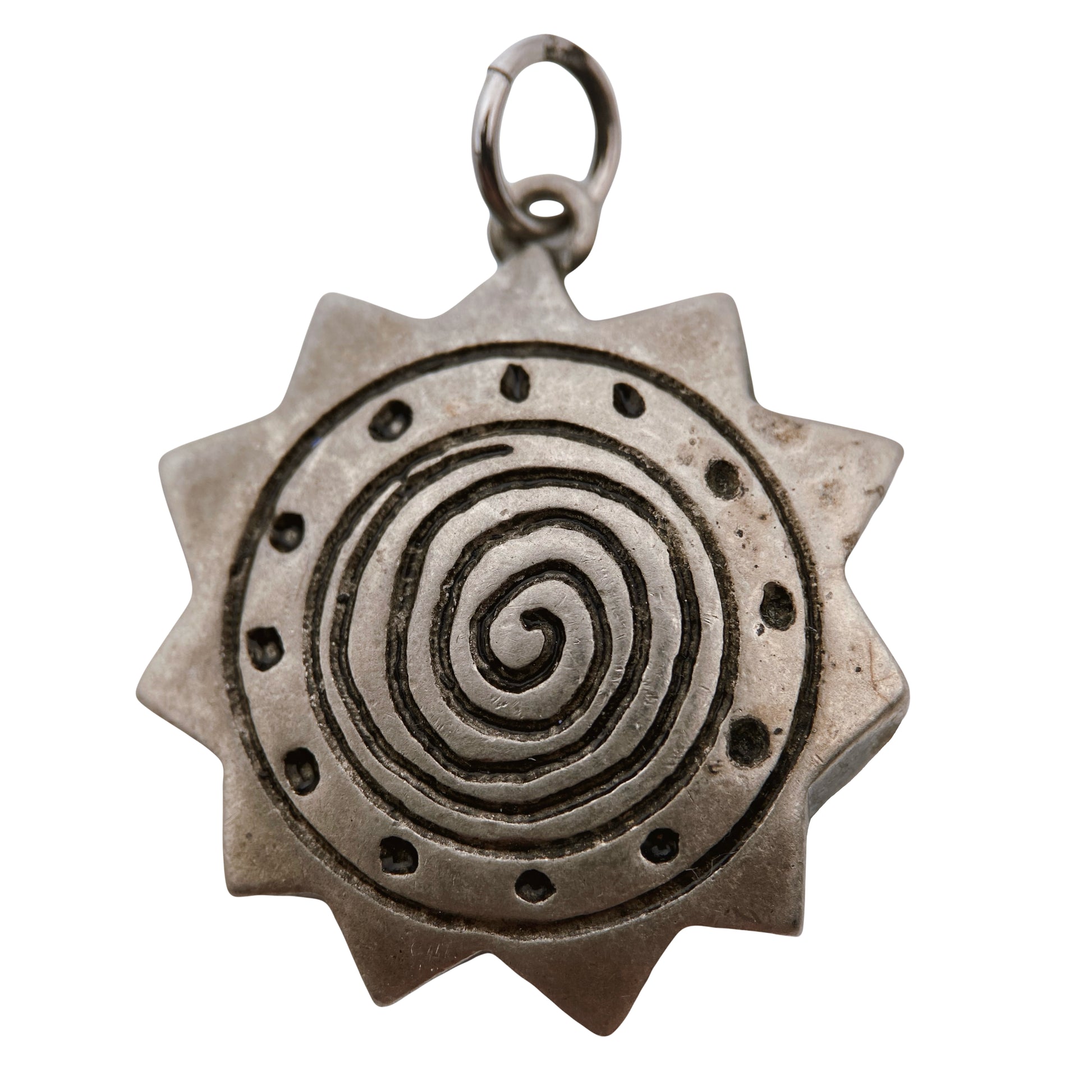 Šis pakabukas aiškiai įkvėptas saulės simbolikos ir pietvakarių JAV arba Meksikos indėnų meno – ypač primena Zuni ar Hopi stiliaus motyvus, nors šis konkretus kūrinys greičiausiai nėra autentiškas Navajo ar kitos genties darbas, o veikiau stilizuota bižuterija arba dekoratyvinė etninio stiliaus interpretacija. Spiralė su taškeliais aplink ją dažnai siejama su pueblo genčių ar net Toltekų simbolika, bet ši forma taip pat naudota plačiai „New Age“ ir „Southwest Style“ bižuterijoje nuo 1970–1990 m. Centre spiralė, kuri indėnų kultūrose dažnai simbolizuoja gyvenimo kelią, dvasinę kelionę arba saulės judėjimą. Atrodo kaip lieta balto metalo lydinio (greičiausiai cinko lydinys su sidabro danga) – nėra tipiško „sterling“ žymėjimo.