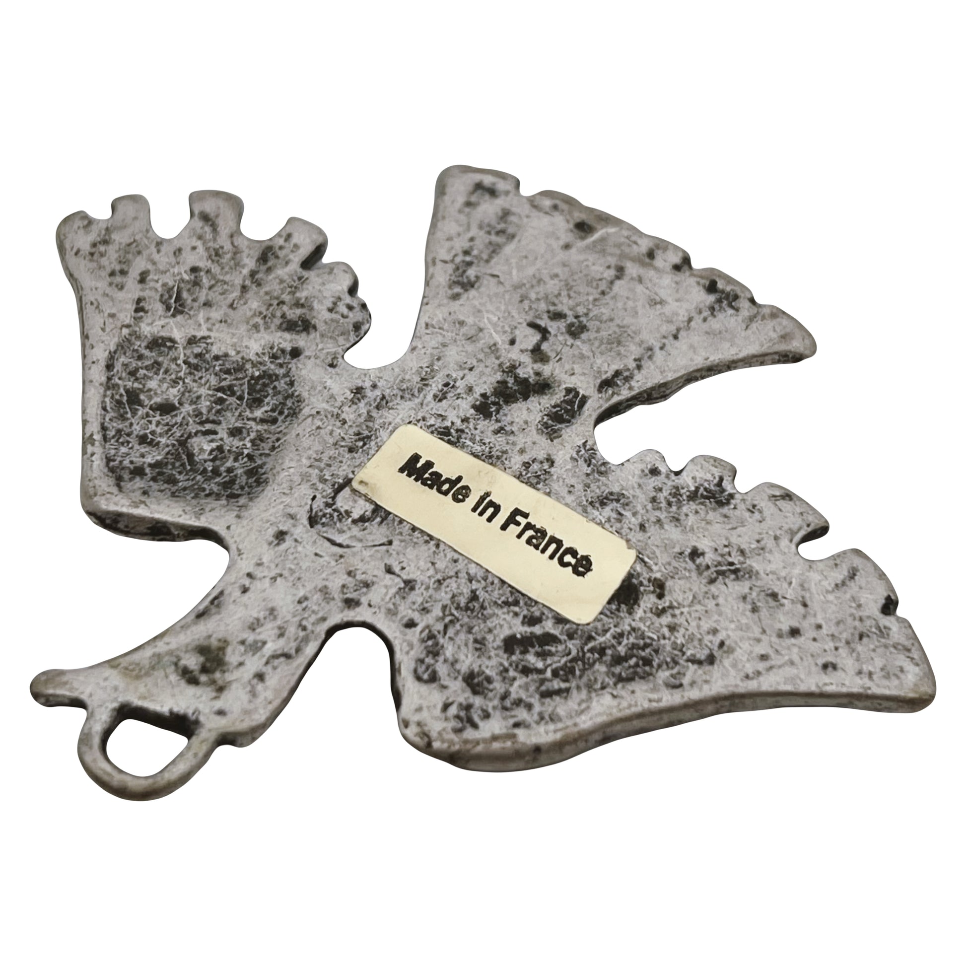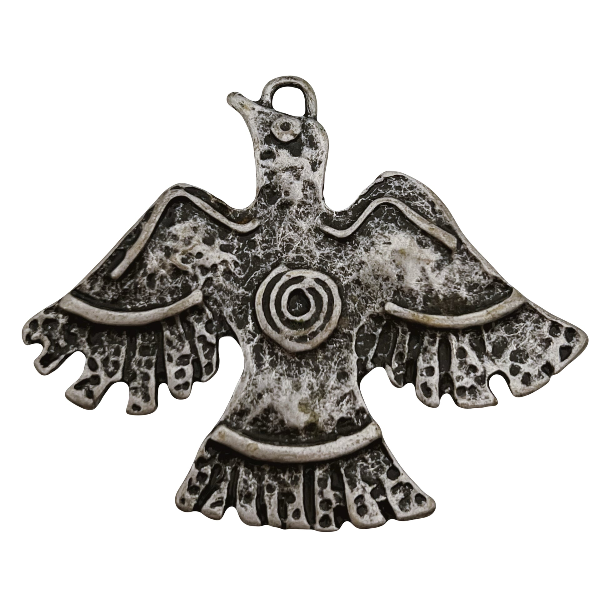 Šis pakabukas vaizduoja stilizuotą paukštį, primenantį griaustinio paukštį (Thunderbird) – simbolį, dažnai sutinkamą Šiaurės Amerikos čiabuvių mitologijoje, bet šiuo atveju interpretuotą europietišku dizainu. Medžiaga atrodo kaip lietas metalas su senoviniu patinavimu – dažniausiai tai cinko lydinys arba alavo lydinys su antikiniu sidabro spalvos paviršiumi. Pakabukas grubiai tekstūruotas, su iškilia simbolika krūtinės srityje (koncentriniai apskritimai). Lipdukas “Made in France” ant nugarėlės, būdingas prancūziškai bižuterijai, ypač 1970–1980 m.