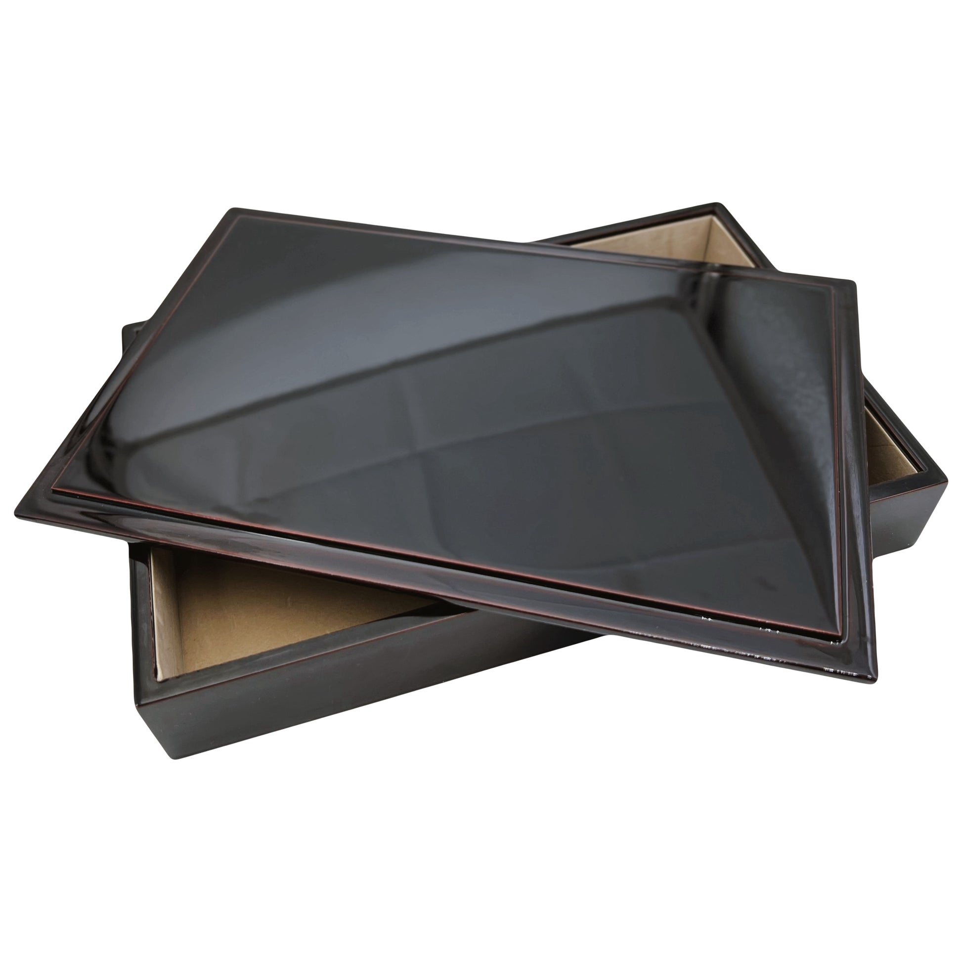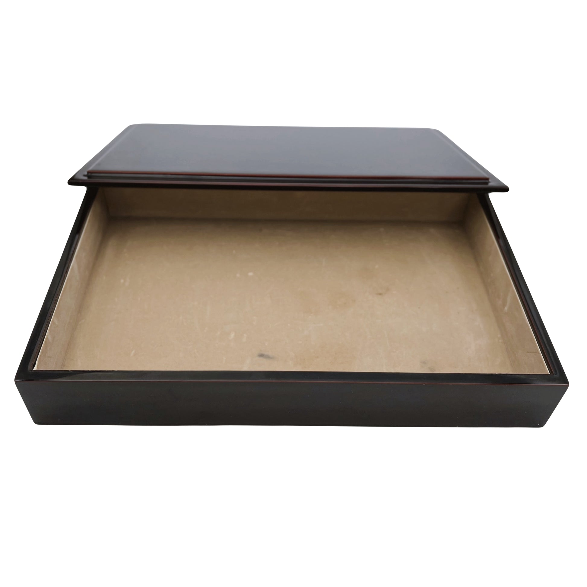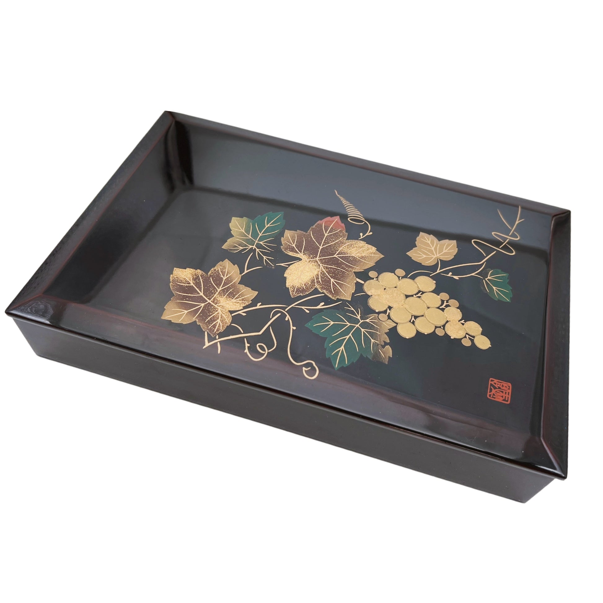 Elegantiška japoniška lakuoto medžio dėžutė, dekoruota aukso spalvos vynuogių ir lapų motyvu bei pažymėta raudonu menininko antspaudu (hanko). Raudonas menininko ženklas rodo autentišką japonišką meninį dirbinį. “Makie” (蒔絵) – tradicinė japoniška lakavimo technika, kai dizainas iš aukso pudros ar dažų dedamas ant lakuoto paviršiaus.