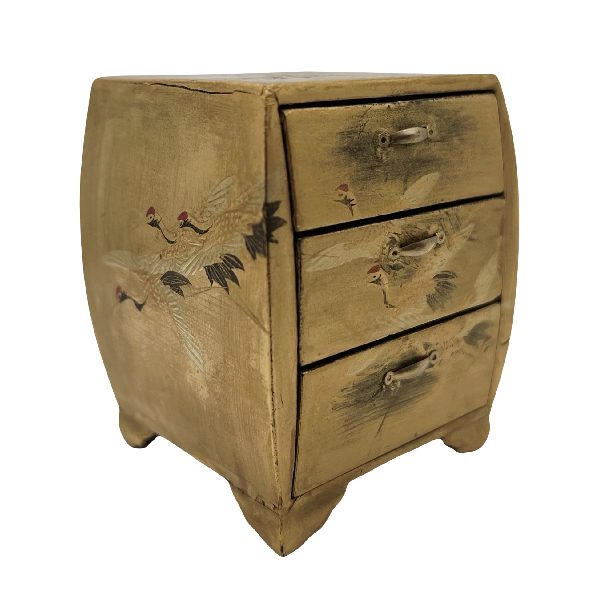 Tai japoniško stiliaus auksu dekoruota medinė mini komodėlė su trimis stalčiais. Išskirtinis XX a. vidurio rankų darbo kūrinys, dengtas aukso atspalvio laku ir dekoruotas skrendančių gervių (tsuru) motyvais. Šie paukščiai Japonijos kultūroje simbolizuoja ilgaamžiškumą, taiką ir dvasinę ramybę. Komodėlės šonai ir stalčiai puošti subtilia rankų tapyba, o išlenktos formos bei mažos kojelės suteikia jai elegantiško senovinio žavesio. Tokio tipo dėžutės buvo populiarios Japonijoje ir eksportuojamos į Vakarų rinkas 1950–1970 m., dažnai naudojamos papuošalams, smulkiems aksesuarams ar kaligrafijos reikmenims laikyti. Autentiškas rytietiško meno kūrinys, tinkamas tiek kolekcionavimui, tiek kaip išskirtinis interjero akcentas.