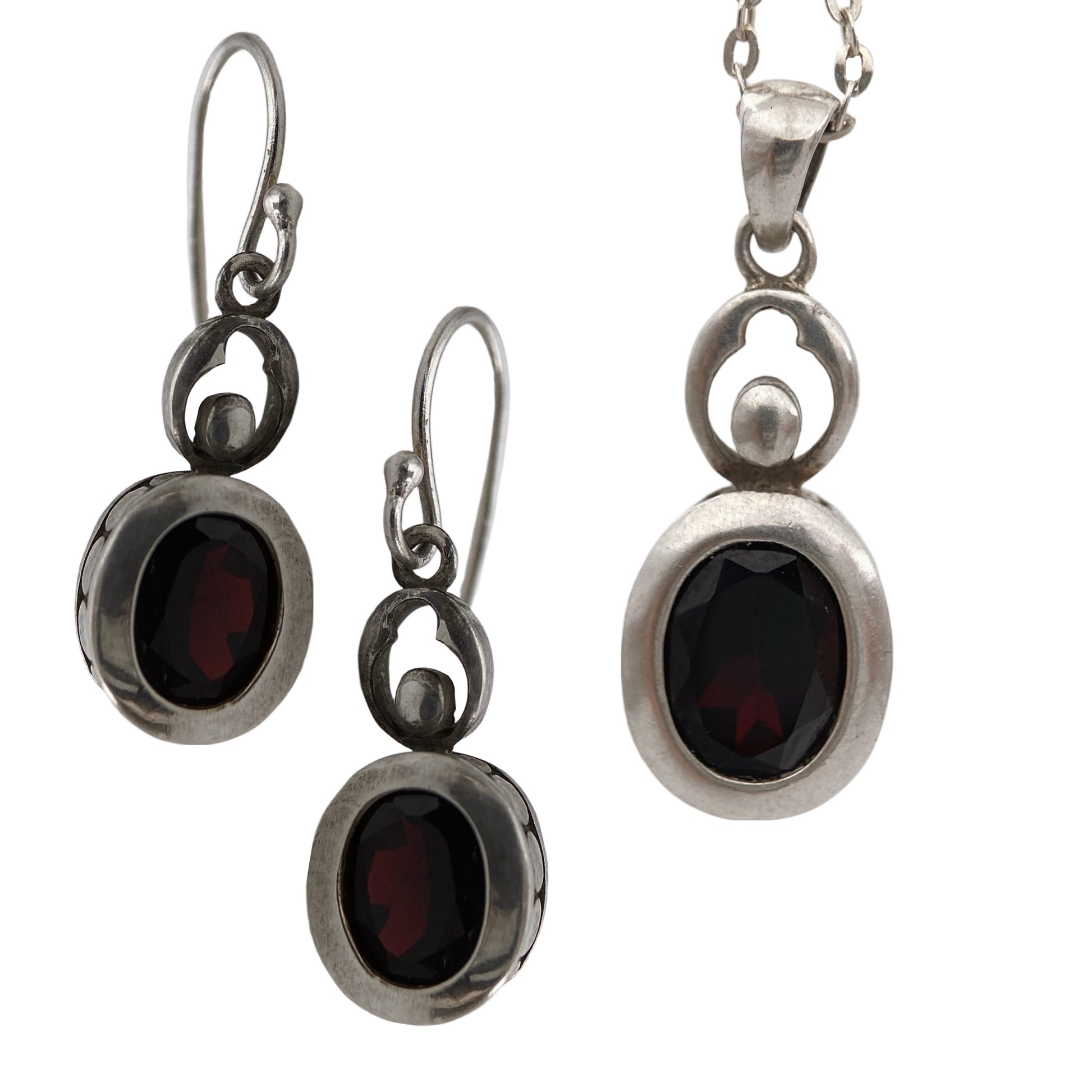 Elegantiškas ir romantiškas komplektas, pagamintas JAV mažose sidabro dirbtuvėse. Papuošalai pažymėti „LUC 925“, patvirtinančiu tikro sidabro sudėtį. Komplektą puošia sodriai tamsiai raudoni natūralūs piropo granatai, kurie šviesoje atsiskleidžia ryškesniu, ugniniu atspalviu. Kiekvienas akmuo įstatytas rankiniu būdu, o švelniai faktūrinė metalo apdaila suteikia papuošalams autentišką vintažo charakterį.