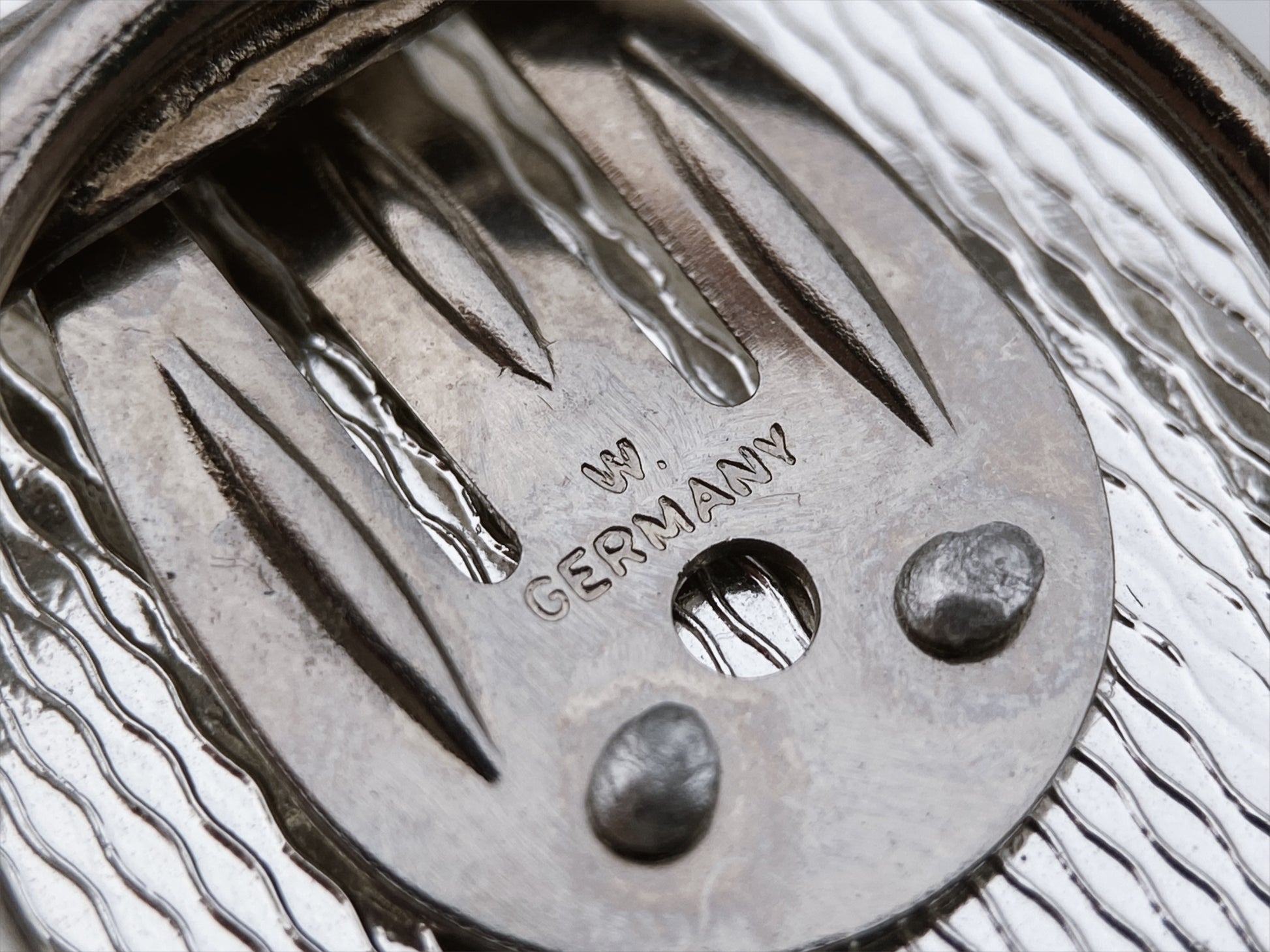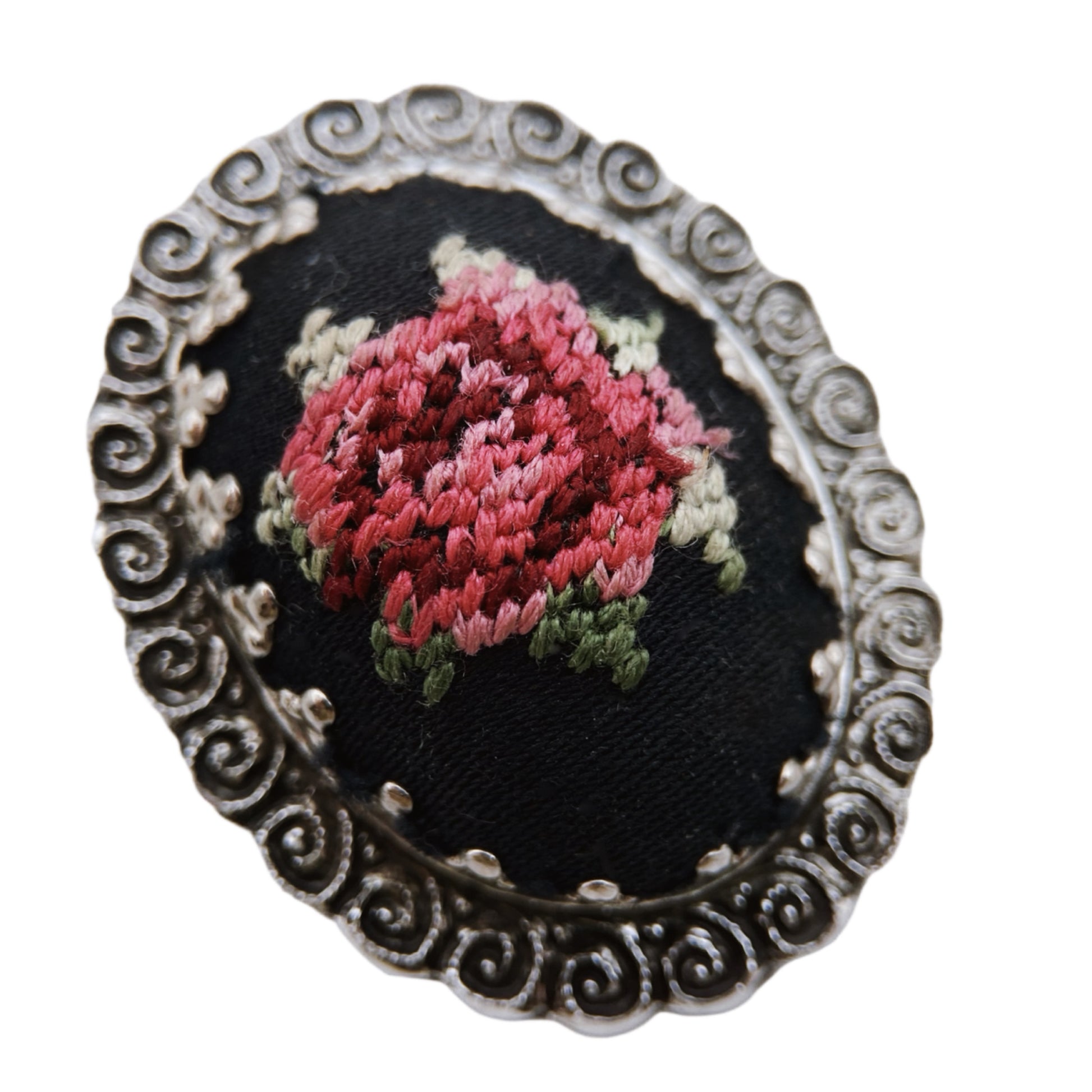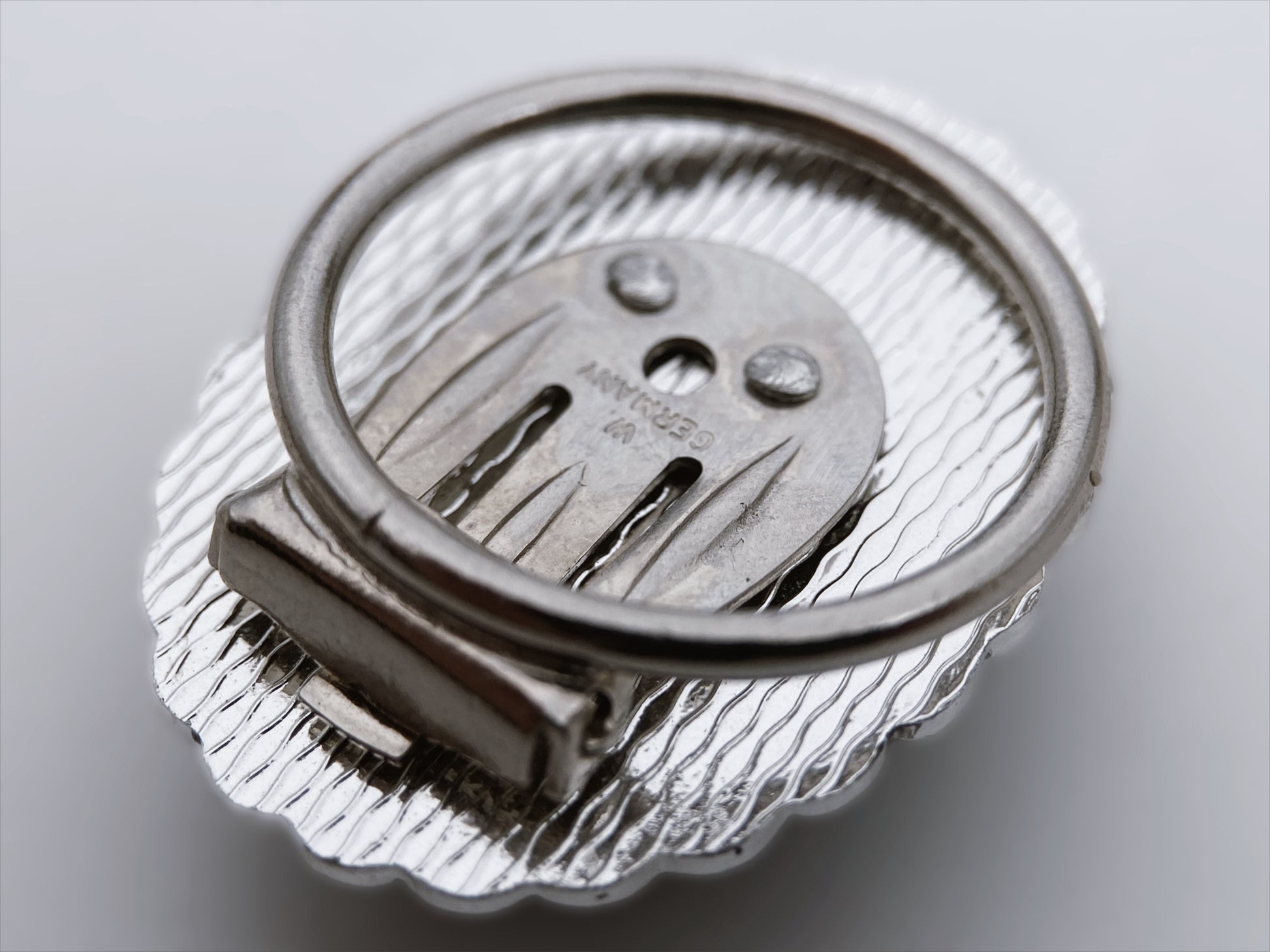 Tai vintažinė skarelės segė (dar vadinama “scarf clip” arba “scarf holder”). Naudojama tam, kad pritvirtintų šalikėlį ar skarelę prie drabužio, dažniausiai ant peties, kaklo ar krūtinės srityje. Priekinė dalis dekoruota siuvinėta rože – klasikinis nostalgiškas, vokiškas dizainas. Nugarėlėje – metalinis laikiklis su žyma “W. Germany”, ir žiedas per kurį perkišama medžiaga (skarelė ar šalis).