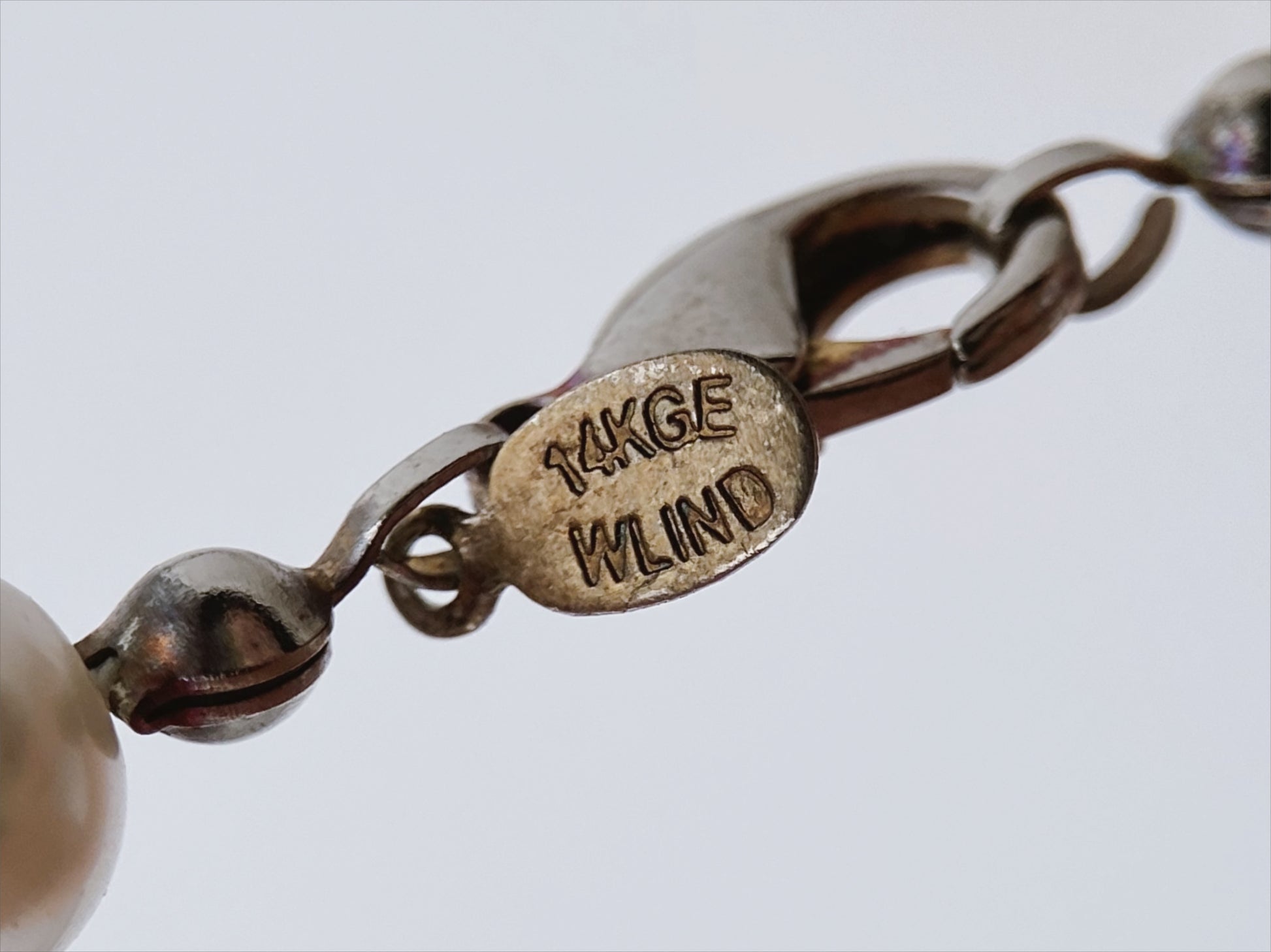 Klasikinis WLIND vėrinys su perlų imitacijomis, pažymėtas „14KGE WLIND“ ant užsegimo. Metaliniai elementai padengti 14 karatų aukso sluoksniu. Tai subtilus, elegantiškas XX a. antros pusės amerikietiškas papuošalas, išsiskiriantis švelniu baltos spalvos blizgesiu ir kokybiška apdaila.