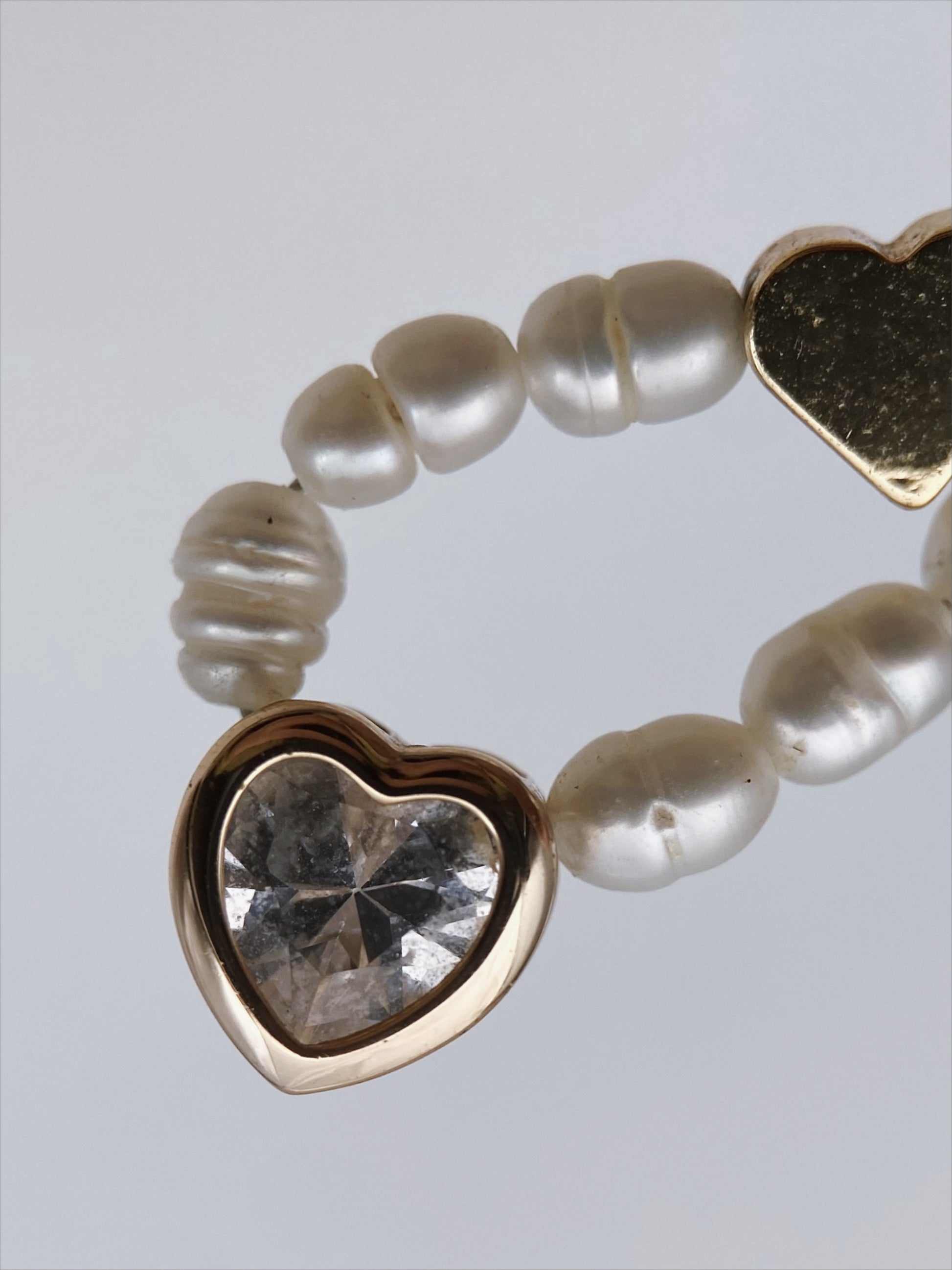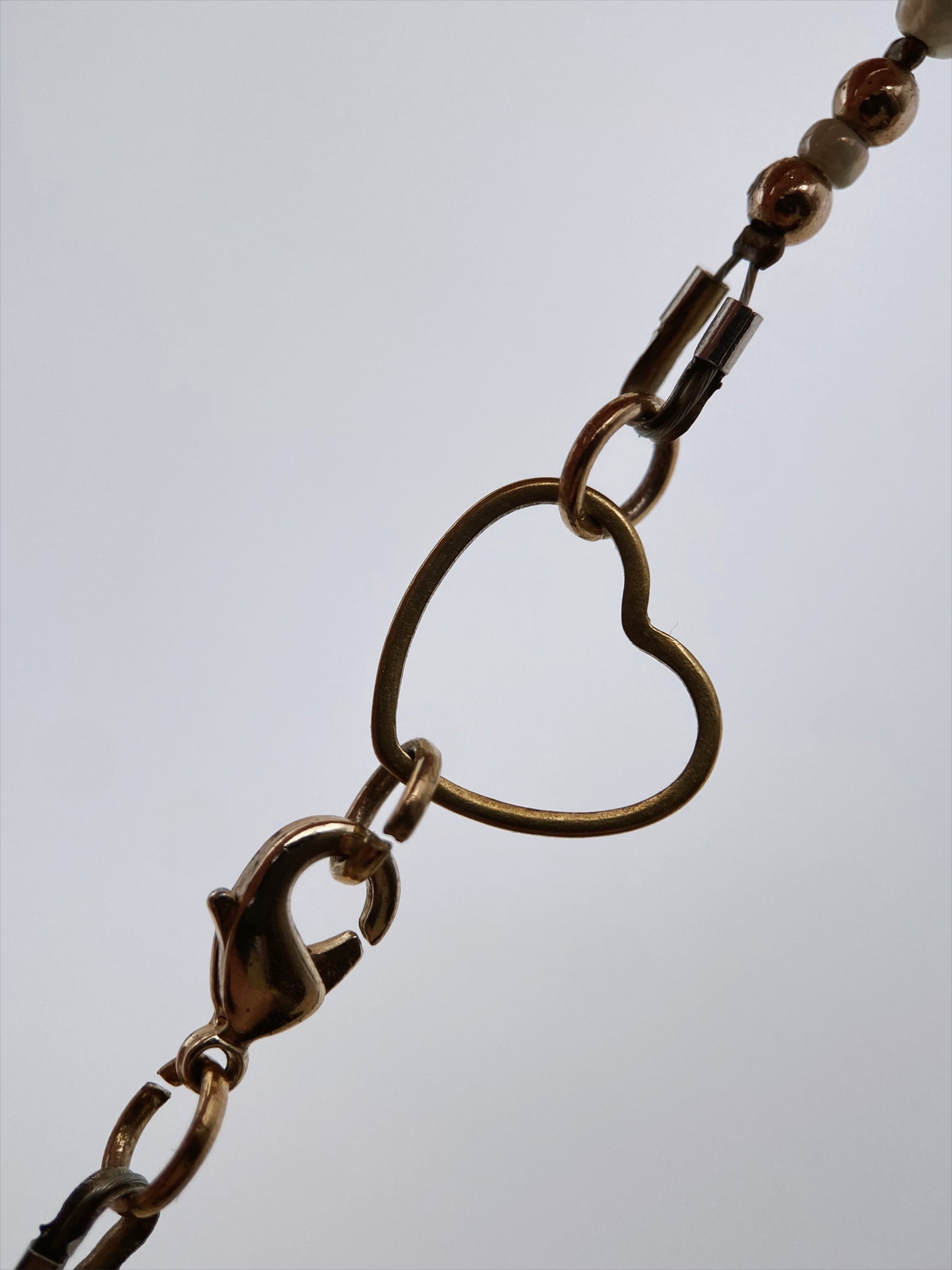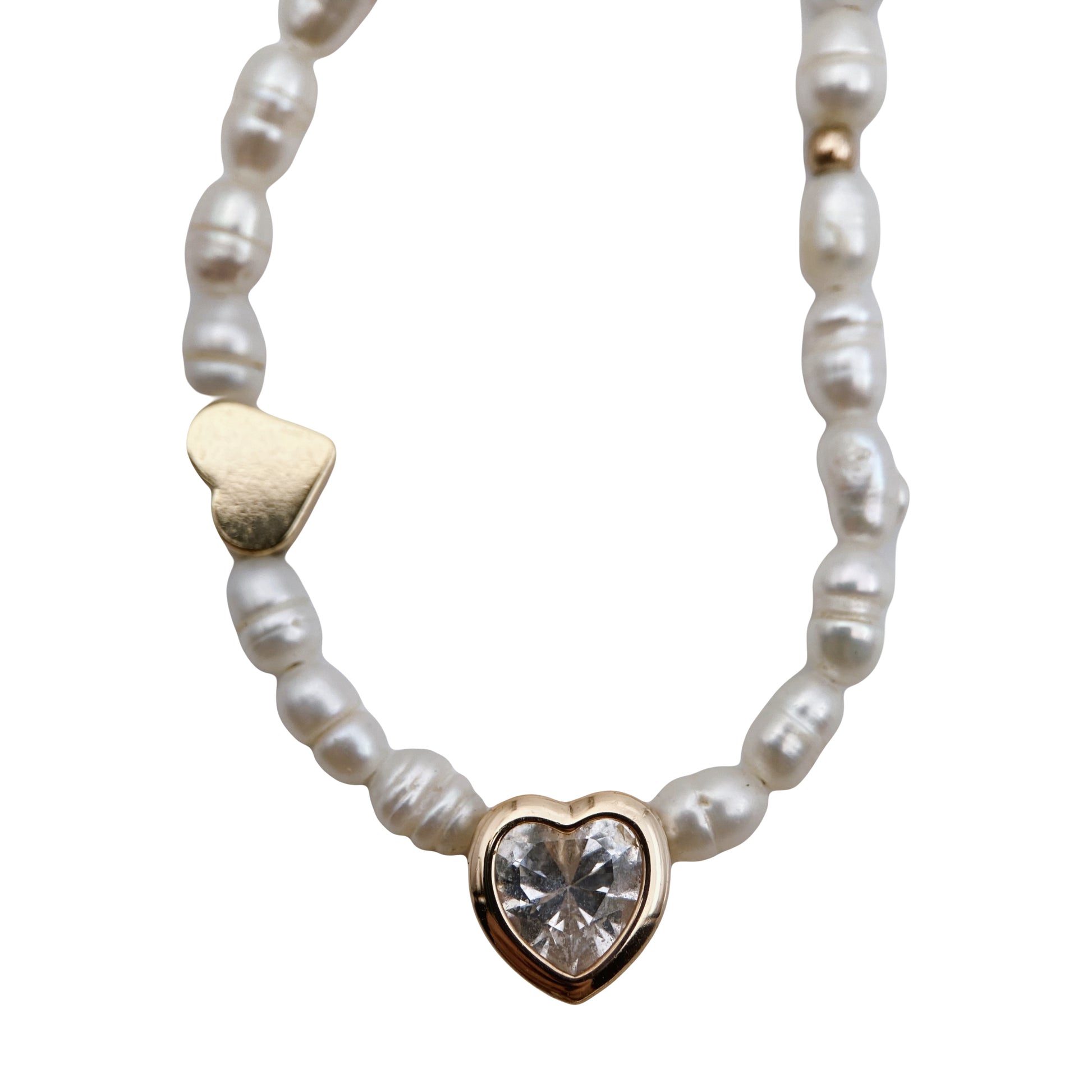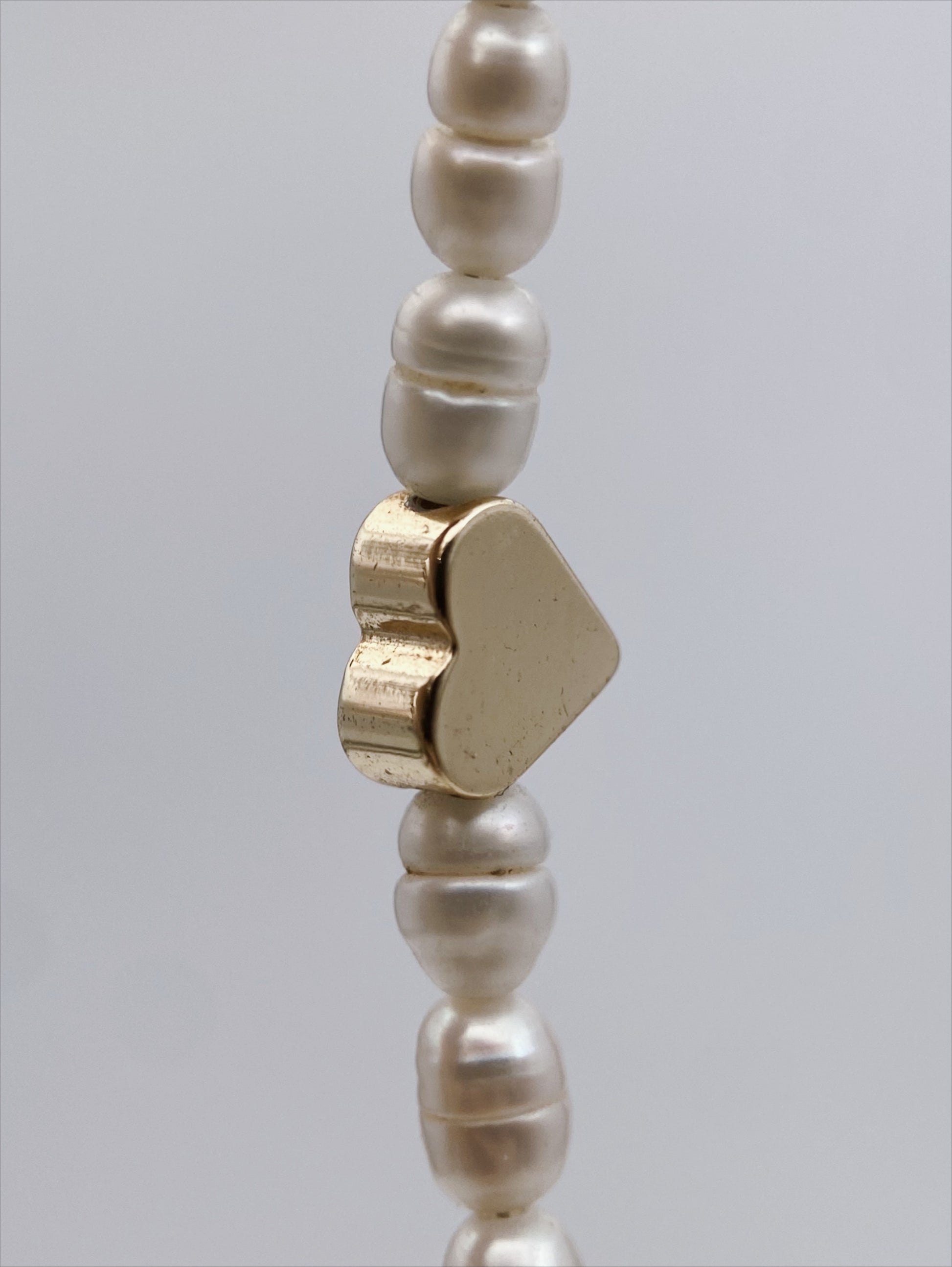 Subtilaus, romantiško dizaino vėrinys, sudarytas iš netaisyklingos formos tikrų gėlavandenių perlų. Centre – širdelės formos detalė su spindinčiu cirkoniu (arba krištolu), aukso spalvos apvade. Šone – matinio aukso spalvos širdelės elementas, suteikiantis papuošalui elegantišką akcentą.
