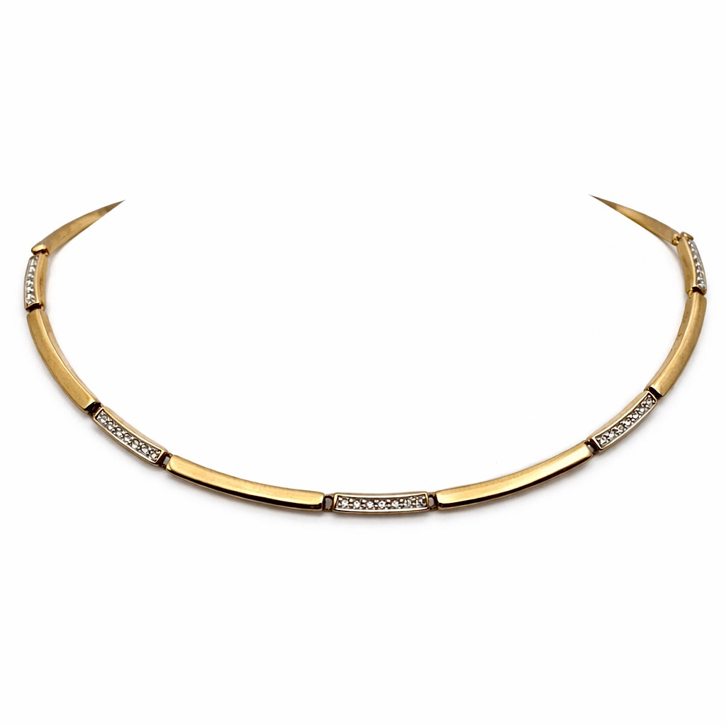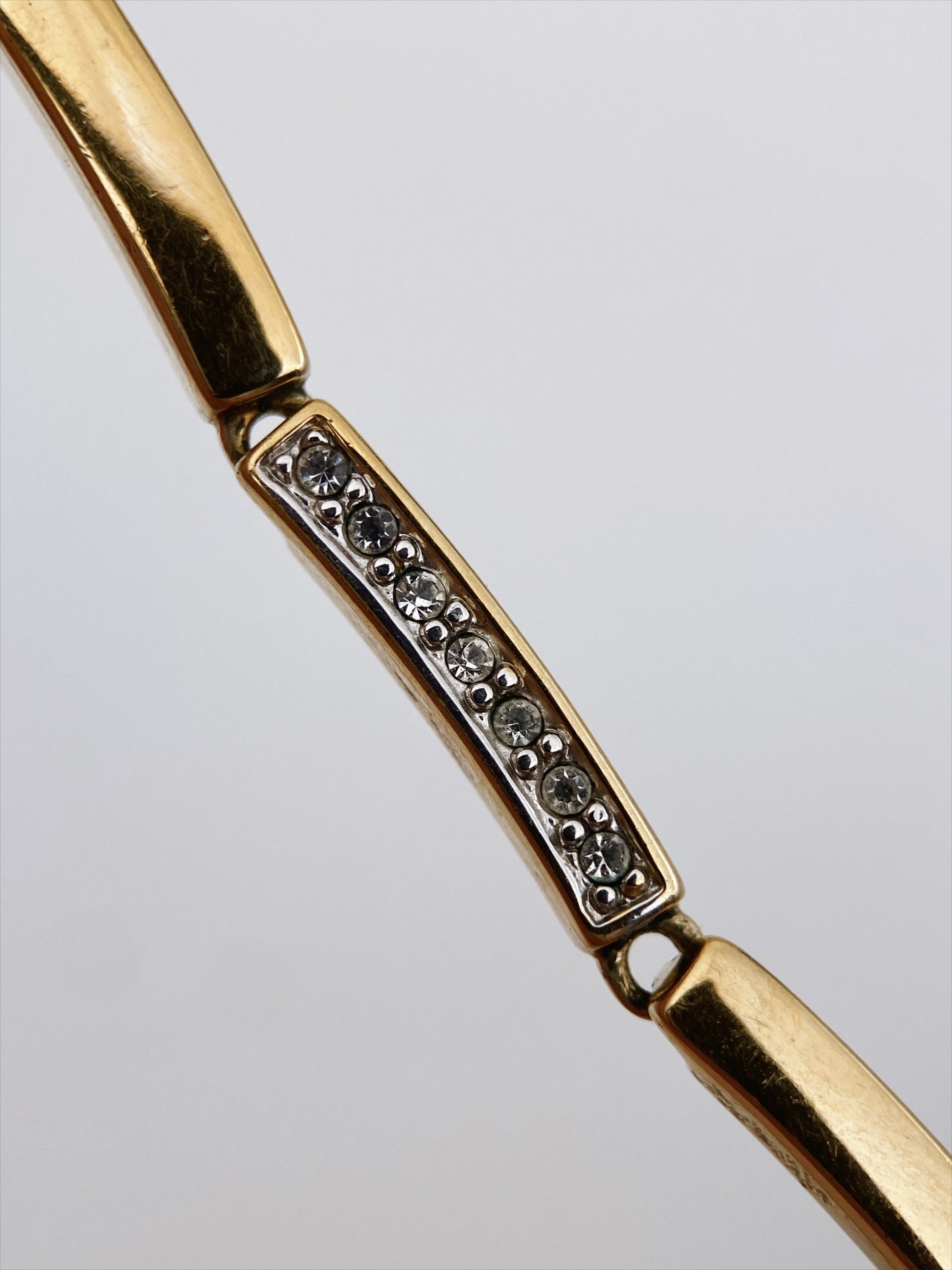 Elegantiškas minimalistinio dizaino segmentinis vėrinys, išsiskiriantis subtilia aukso ir skaidrių akmenų dermė. Švarios linijos ir simetriška kompozicija suteikia modernios klasikos įspūdį.