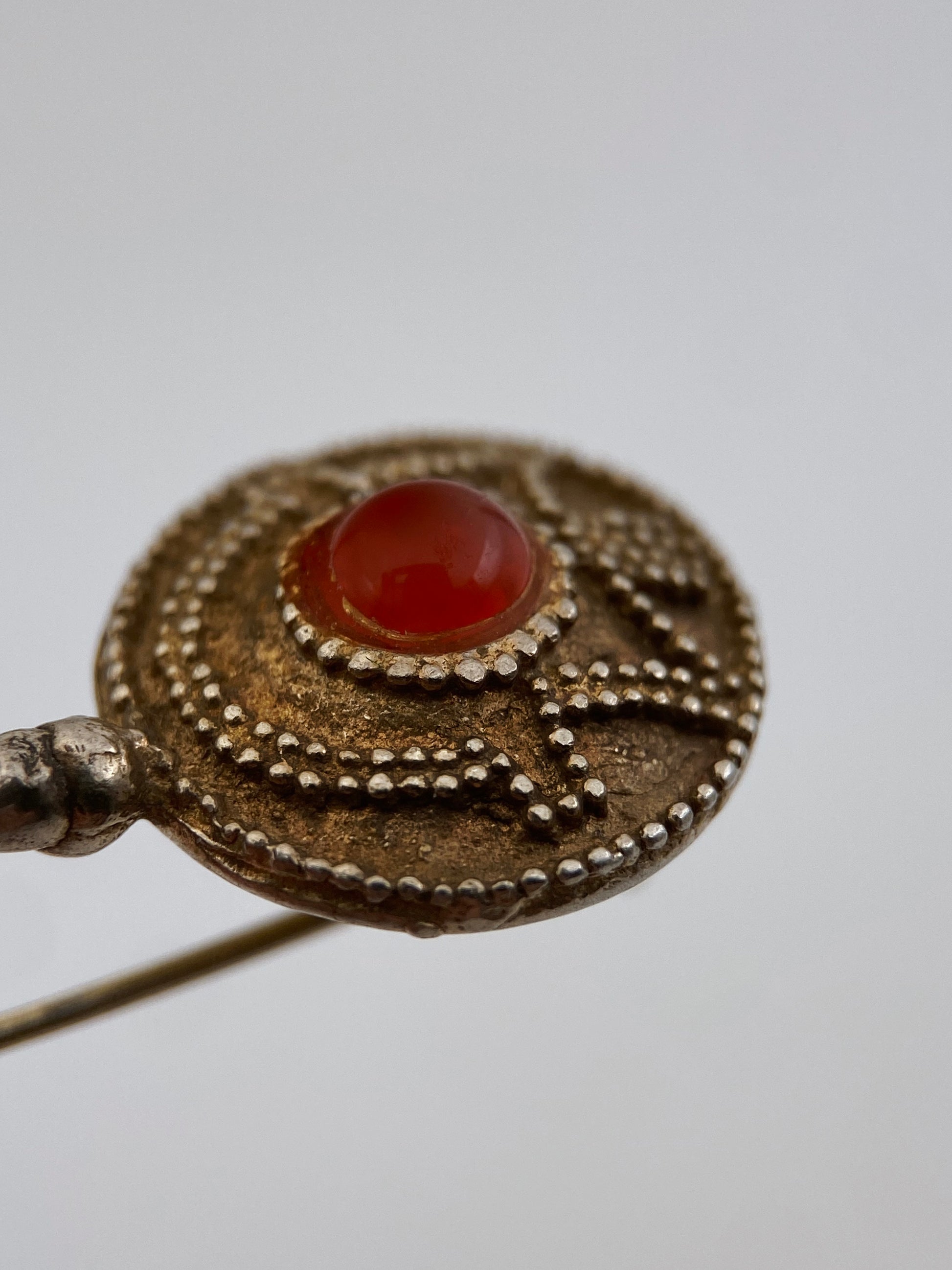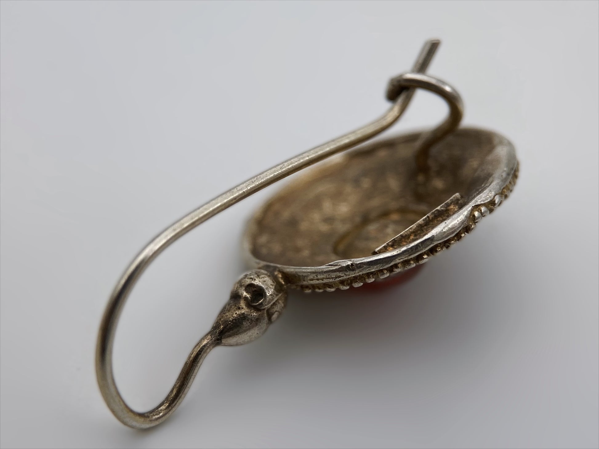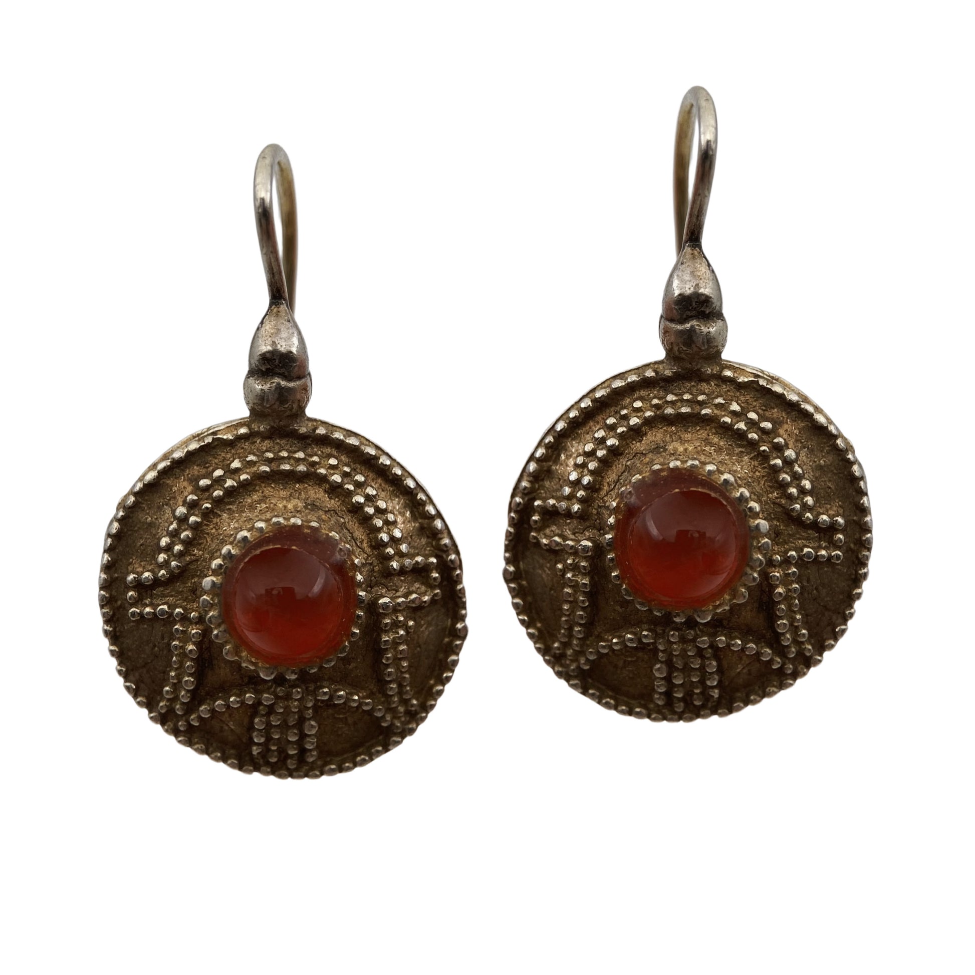 Autentiški etniniai sidabro auskarai, dekoruoti tradicine granuliacijos ir reljefo technika, būdinga Kaukazo regionui. Centre – lygus kupolo formos natūralaus karneolio akmenukas. Ant nugarėlės – 925 prabos žyma ir meistro ženklinimas „626 AR“. Kabliuko tipo užsegimas. Puikiai išlaikyti, išraiškingi vintage etno stiliaus papuošalai. Prekės kodas: RF036
