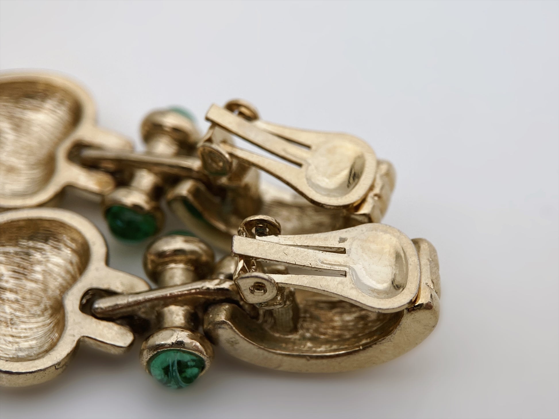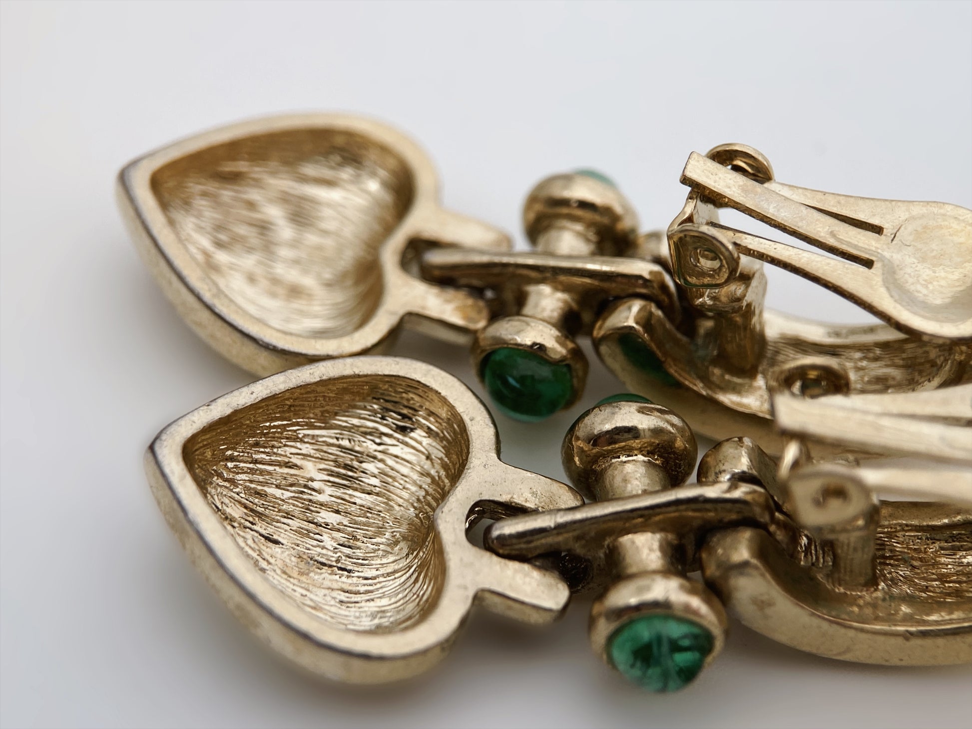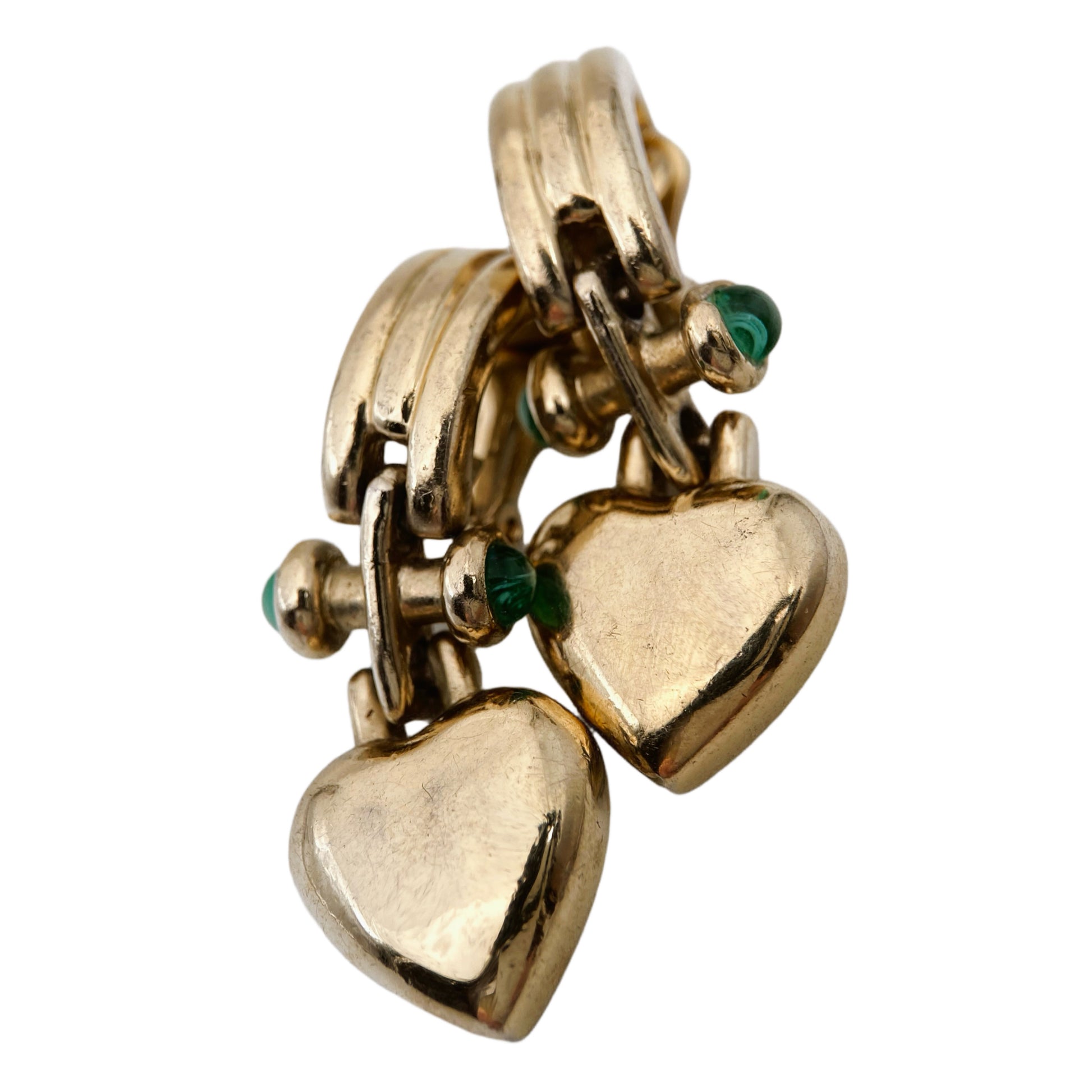 Romantiško stiliaus auskarai klipsai su širdelės formos pakabukais. Viršutinė dalis dekoruota dvigubu lankeliu ir mažais žaliais stiklo akcentais. Auksaspalvis metalas suteikia šiltą, elegantišką efektą.