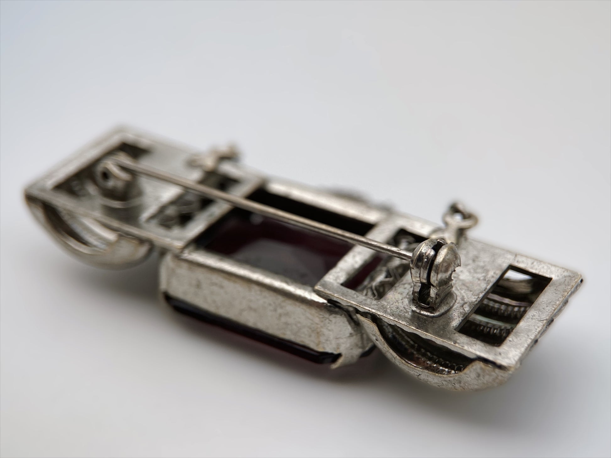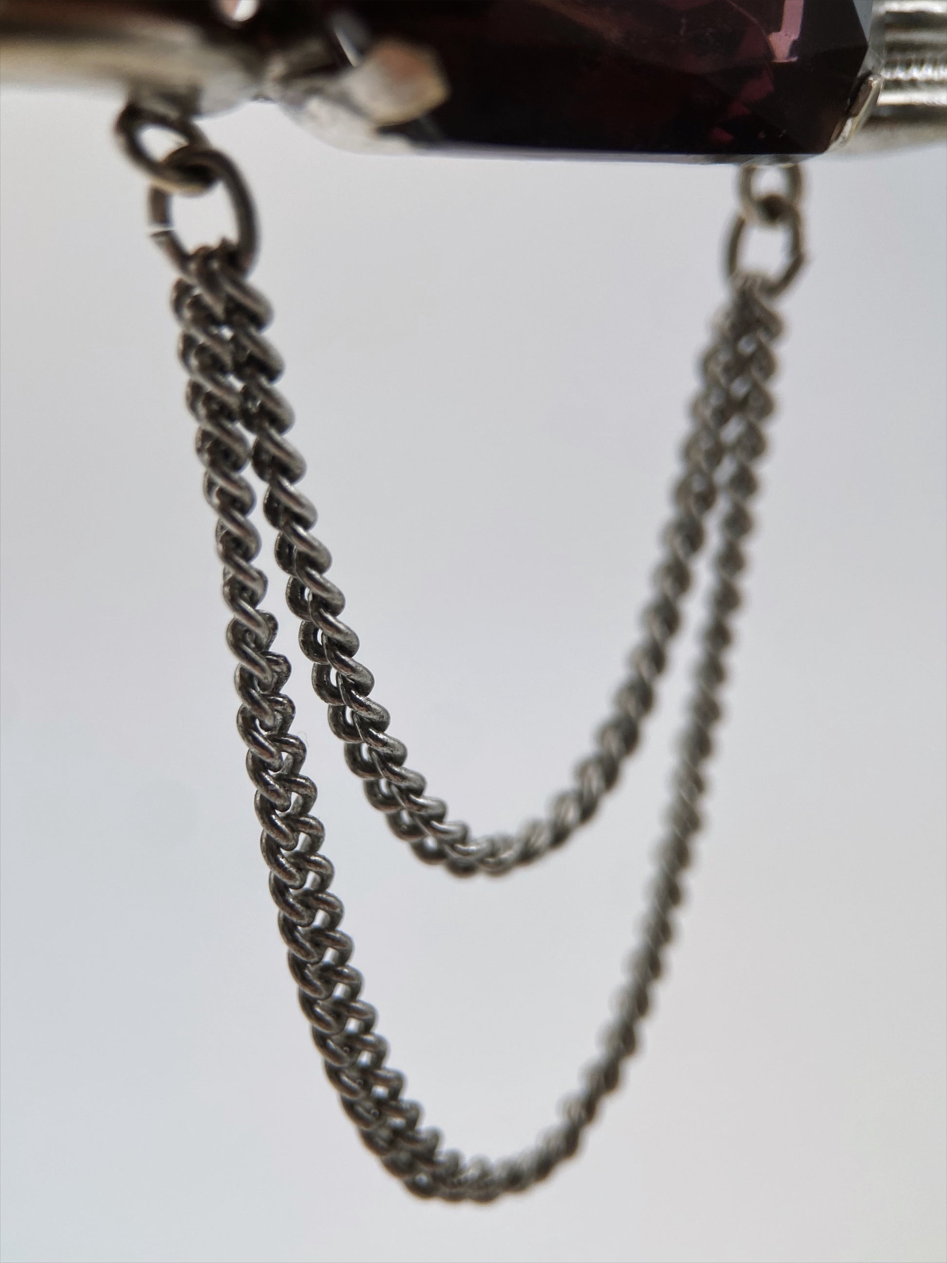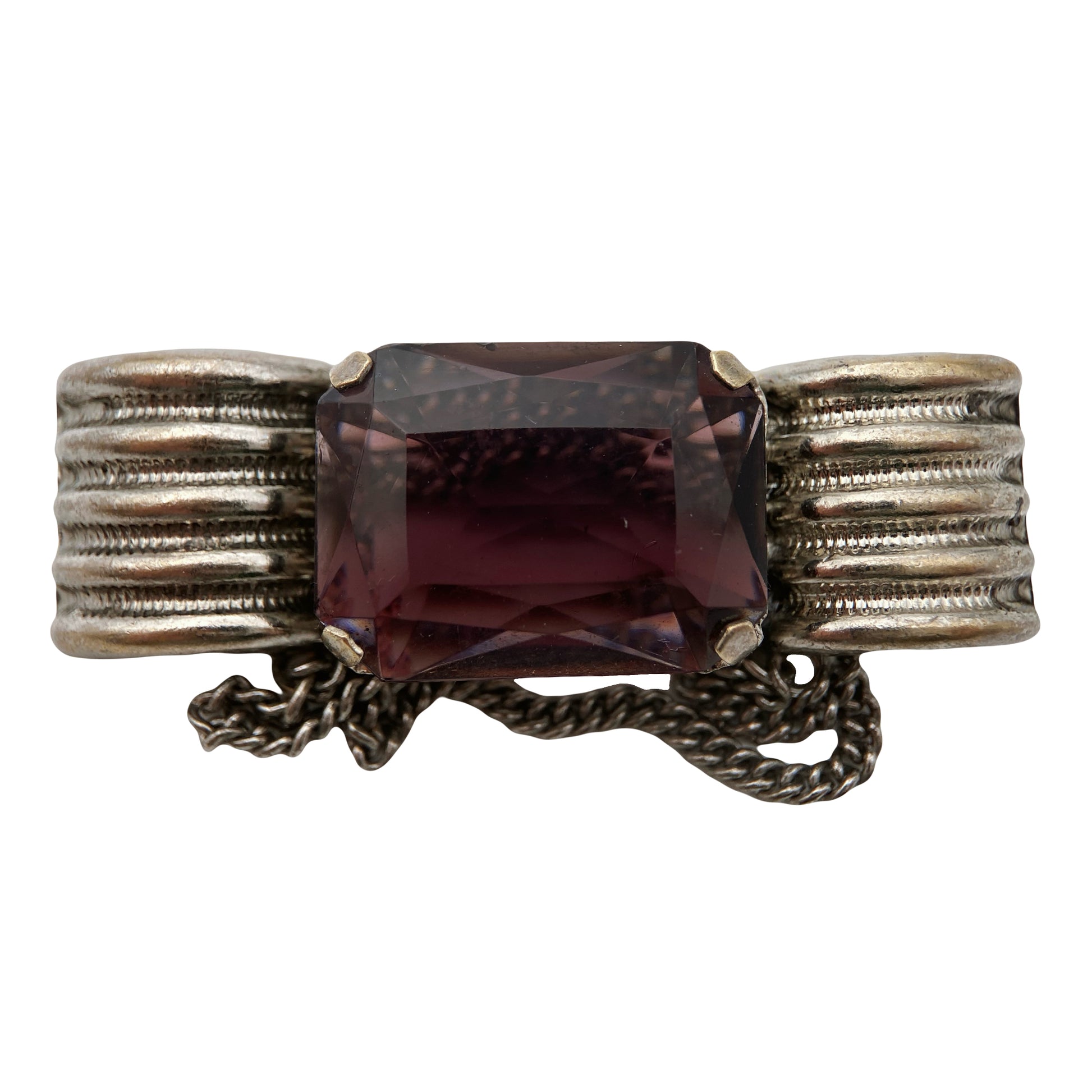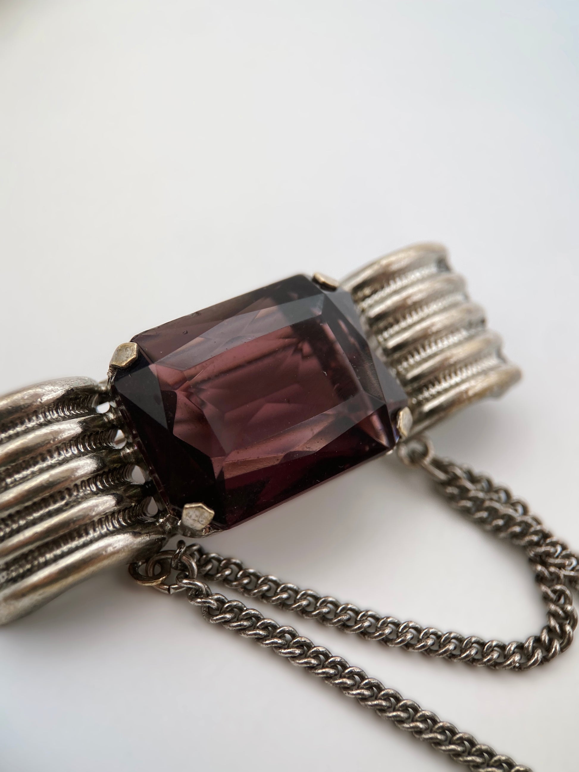 Vintažinė “Art Deco Revival” sagė (1950–1970), dekoruota dideliu vyšninės violetinės spalvos stiklo akmeniu. Šonai puošti reljefinėmis rievėmis, sagė masyvi, klasikinio metalo lydinio. Užsegimas – senesnio tipo segtukas su fiksatoriumi. Unikalus Europos pokario bižuterijos pavyzdys.