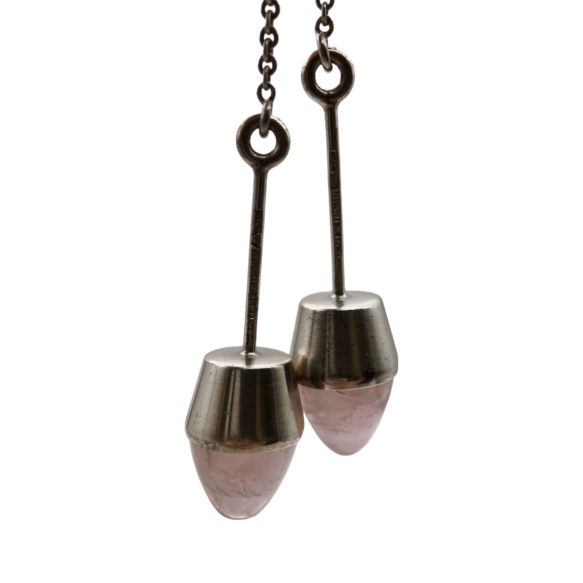 Autentiškas itališkas modernistinis sidabro vėrinys su natūralaus rožinio kvarco pakabukais, sukurtas XX a. 8-ajame dešimtmetyje. Vėrinį sudaro masyvūs, lašo formos rožinio kvarco elementai, įtvirtinti sidabro (| 8 | - reiškia 800 praba) gaubtuose ir sujungti grandinėle, suteikiančia papuošalui ritmingą judesį ir skulptūrinį charakterį. Papuošalas pažymėtas itališku dirbtuvės simboliu (stilizuotas „medelis“) bei sidabro 800 prabos žymėjimu, taip pat datavimo kodu G7, leidžiančiu tiksliai datuoti dirbinį 1977 metais. Toks žymėjimas būdingas Italijos modernistinei juvelyrikai, ypač Florencijos dirbtuvėms, kuriose natūralūs akmenys buvo derinami su architektūrinėmis, industrinio pobūdžio metalinėmis formomis. Rožinis kvarcas – natūralus akmuo, vertinamas dėl savo švelnios spalvos ir unikalių vidinių struktūrų, todėl kiekvienas elementas yra individualus. Bendras dizainas išraiškingas – tai ne dekoratyvinė bižuterija, o modernistinis dizaino objektas, tinkantis tiek kolekcionavimui, tiek kaip ryškus „statement“ papuošalas.