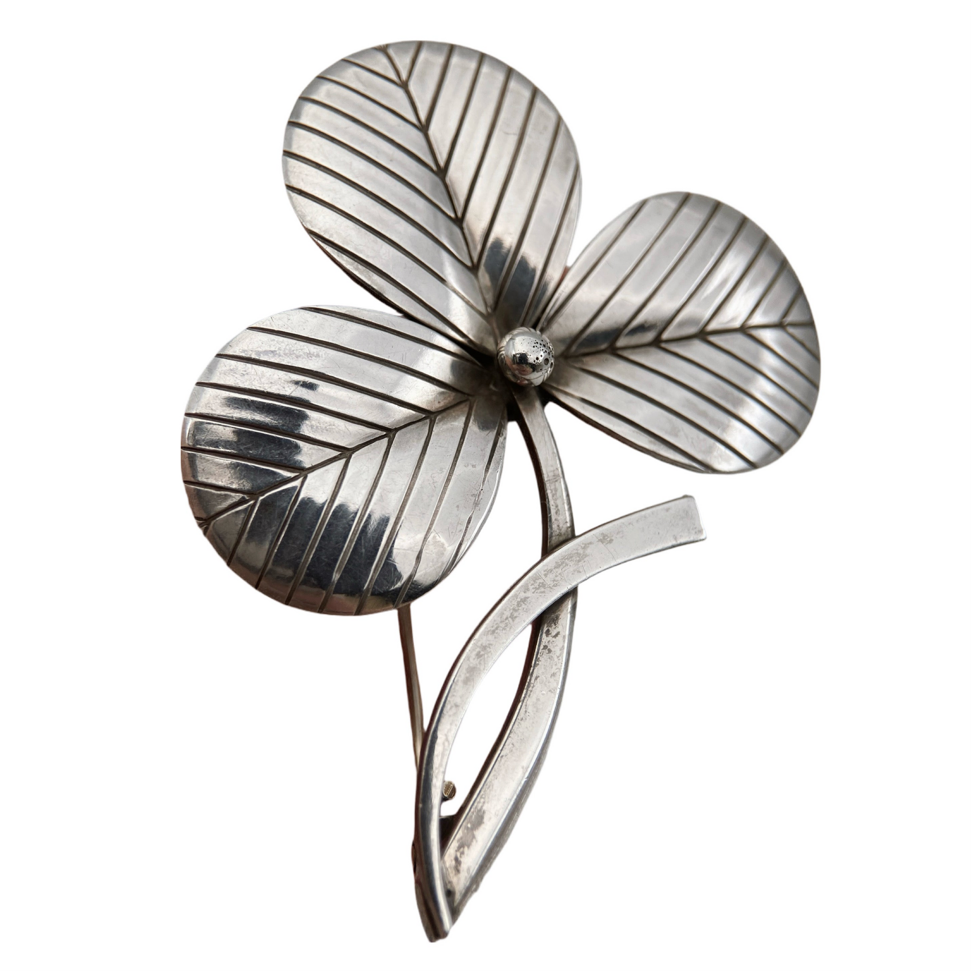Vintažinė modernistinio stiliaus sidabrinė sagė, vaizduojanti stilizuotą gėlę su trimis lapeliais. Dizainas būdingas Skandinavijos modernizmui (K9–1969 m.) – švarios linijos, grafiškai graviruoti lapai, skulptūriška forma. AMS siejamas su Skandinavijos (Švedijos) sidabro dirbtuvėmis, dirbusiomis modernizmo laikotarpiu. Tai ne masinė bižuterija, o tikras sidabrinis autorinis darbas.