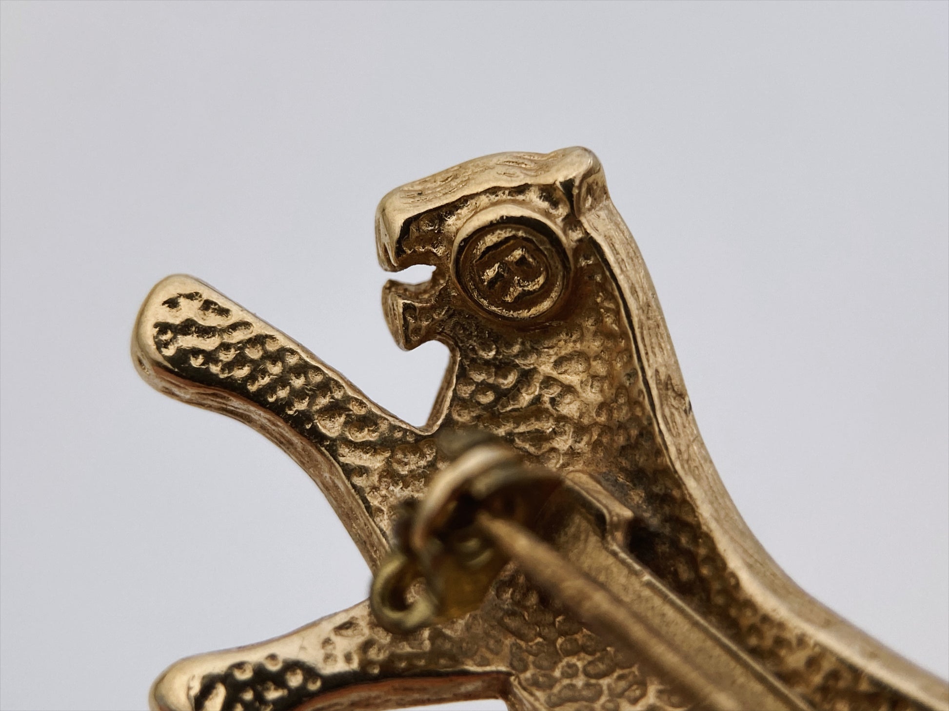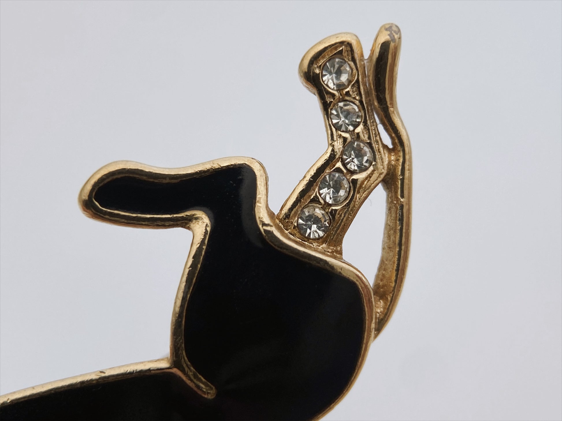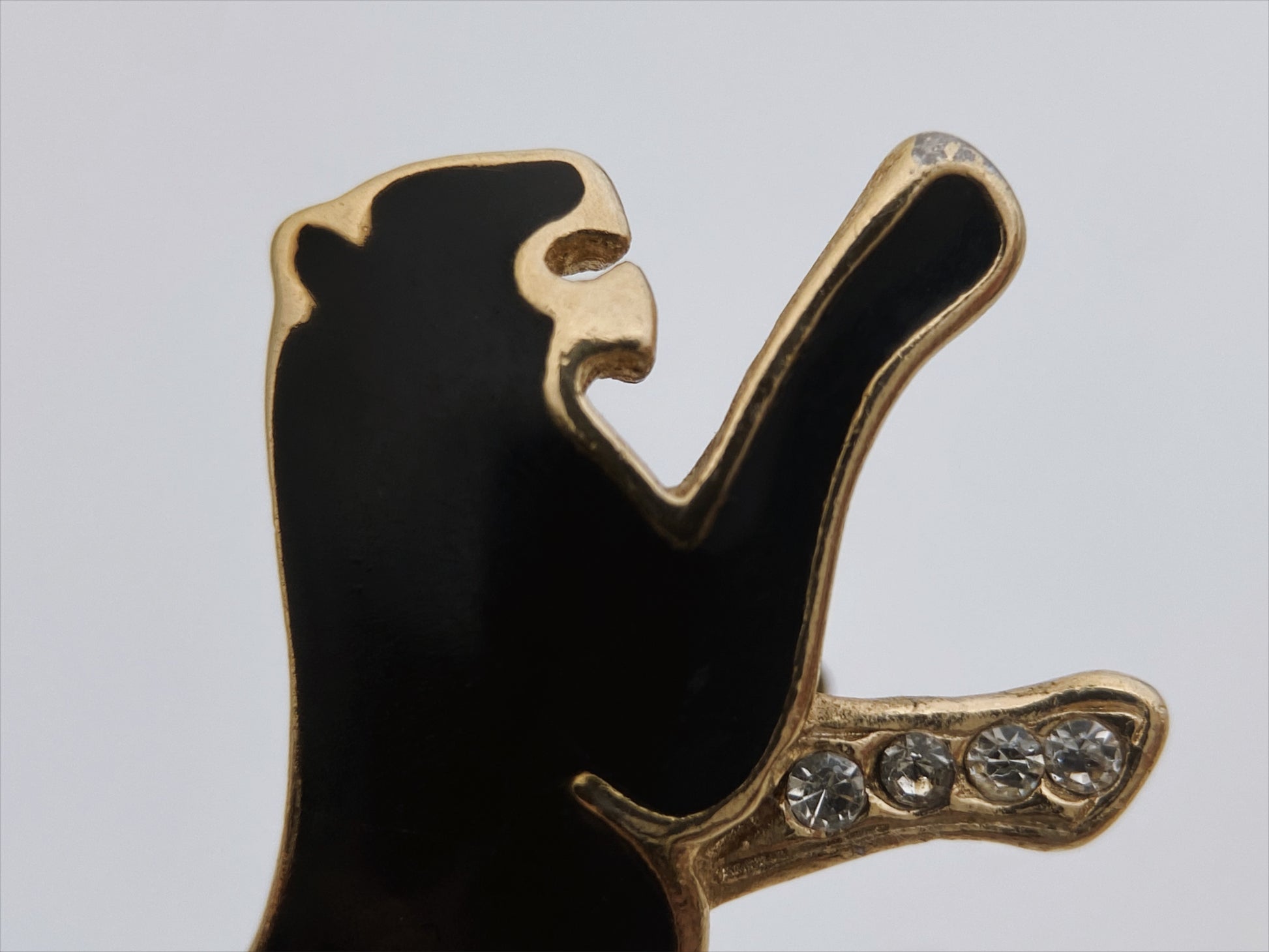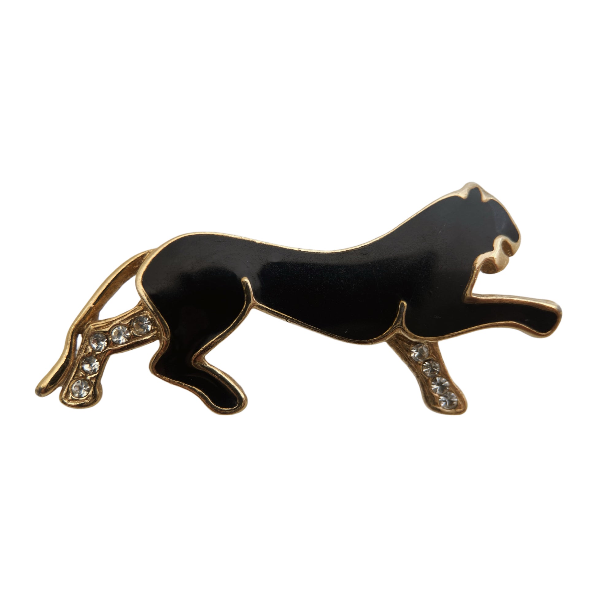 Vintažinė JAV gamybos sagė su panteros motyvu, dekoruota juodu emaliu ir skaidriais kristalais. Aukso spalvos metalas, registruotas gamintojo ženklas (R apskritime). XX a. 8 dešimtmetis. Matomos nežymios dėvėjimo žymės, būdingos vintažiniam papuošalui. Prekės kodas: RF095