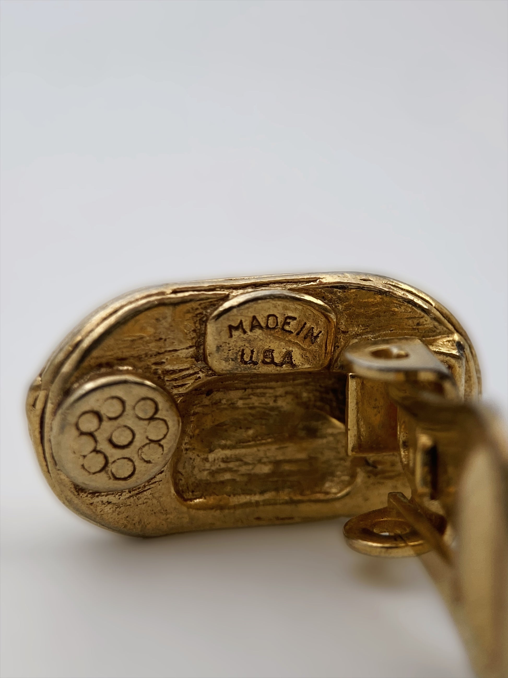 Sudėtis: paauksuotas metalas, stiklo kristalai Būklė: labai gera Išmatavimai: 2 x 1,2 cm Spalva: aukso Šalis: JAV Žymėjimas: „MADE IN U.S.A.“ Laikotarpis: 1970–1980 metai Rinkos vertė: 25–45 €