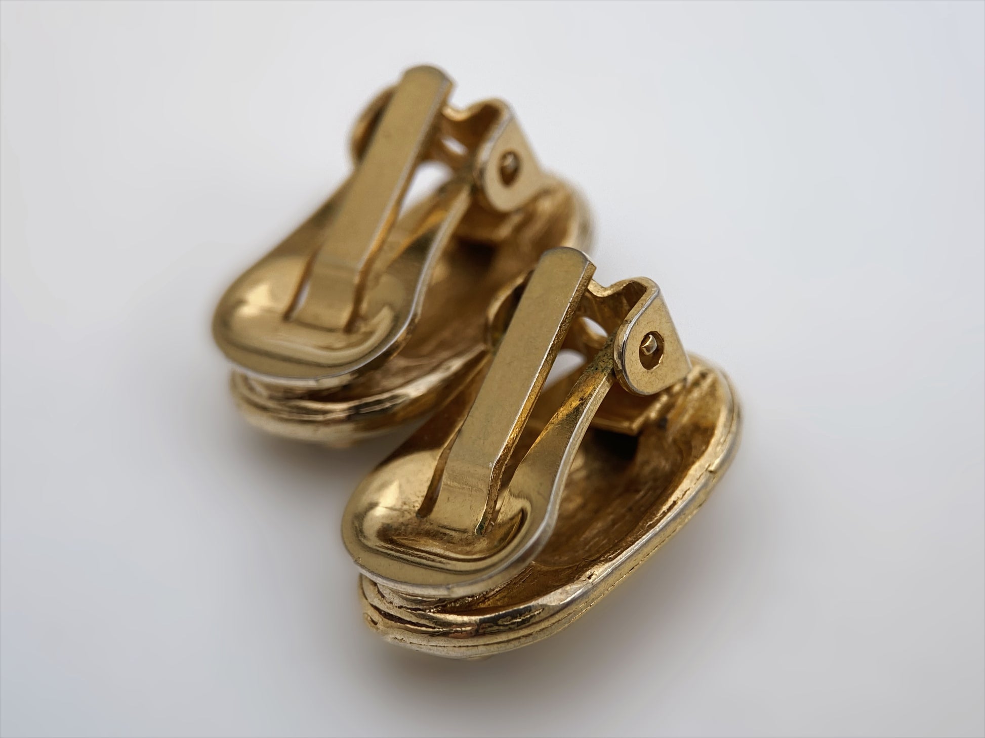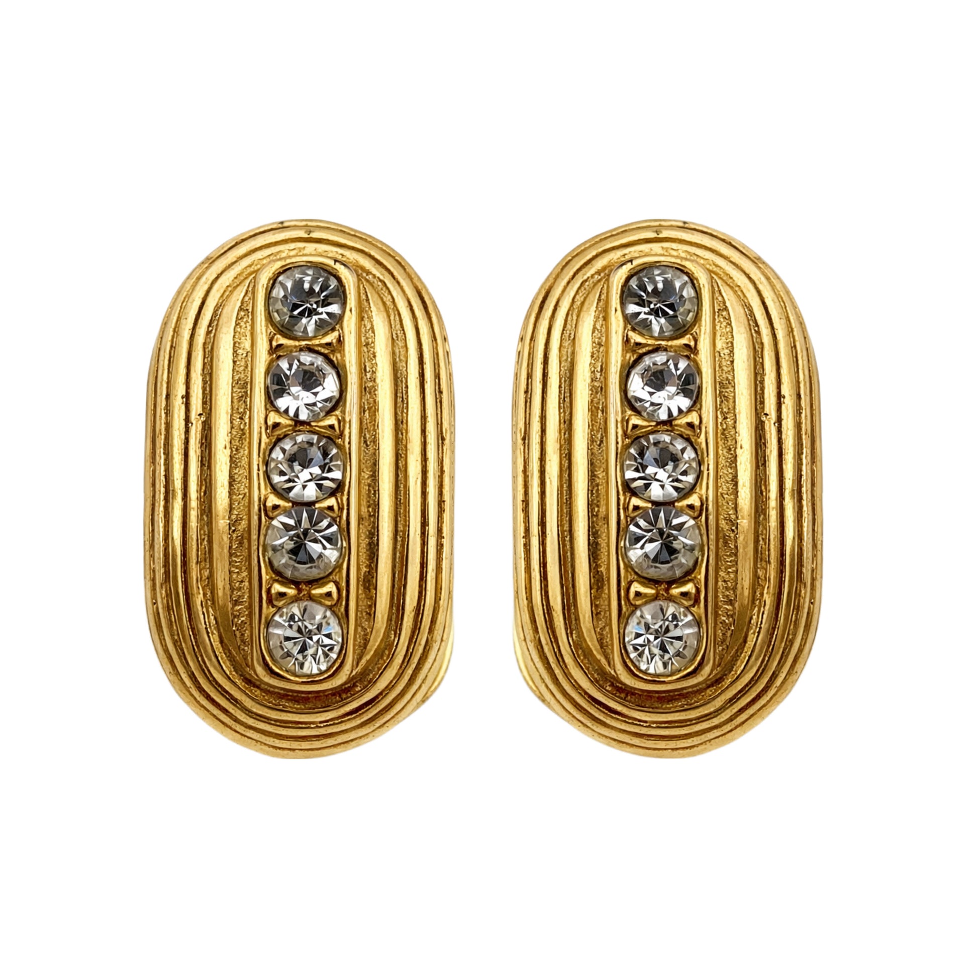 Klipsai pasižymi klasikiniu XX a. antros pusės amerikietiškos bižuterijos dizainu. Pailga, reljefinė forma su koncentriškai išdėstytomis linijomis ir centre įstatytų skaidrių kristalų eile sukuria elegantišką, subtiliai dekoratyvų įvaizdį. Kokybiškas paauksuoto metalo liejimas ir tipiškas vintaginis klipsinis užsegimas rodo geros kokybės masinę JAV gamybą.