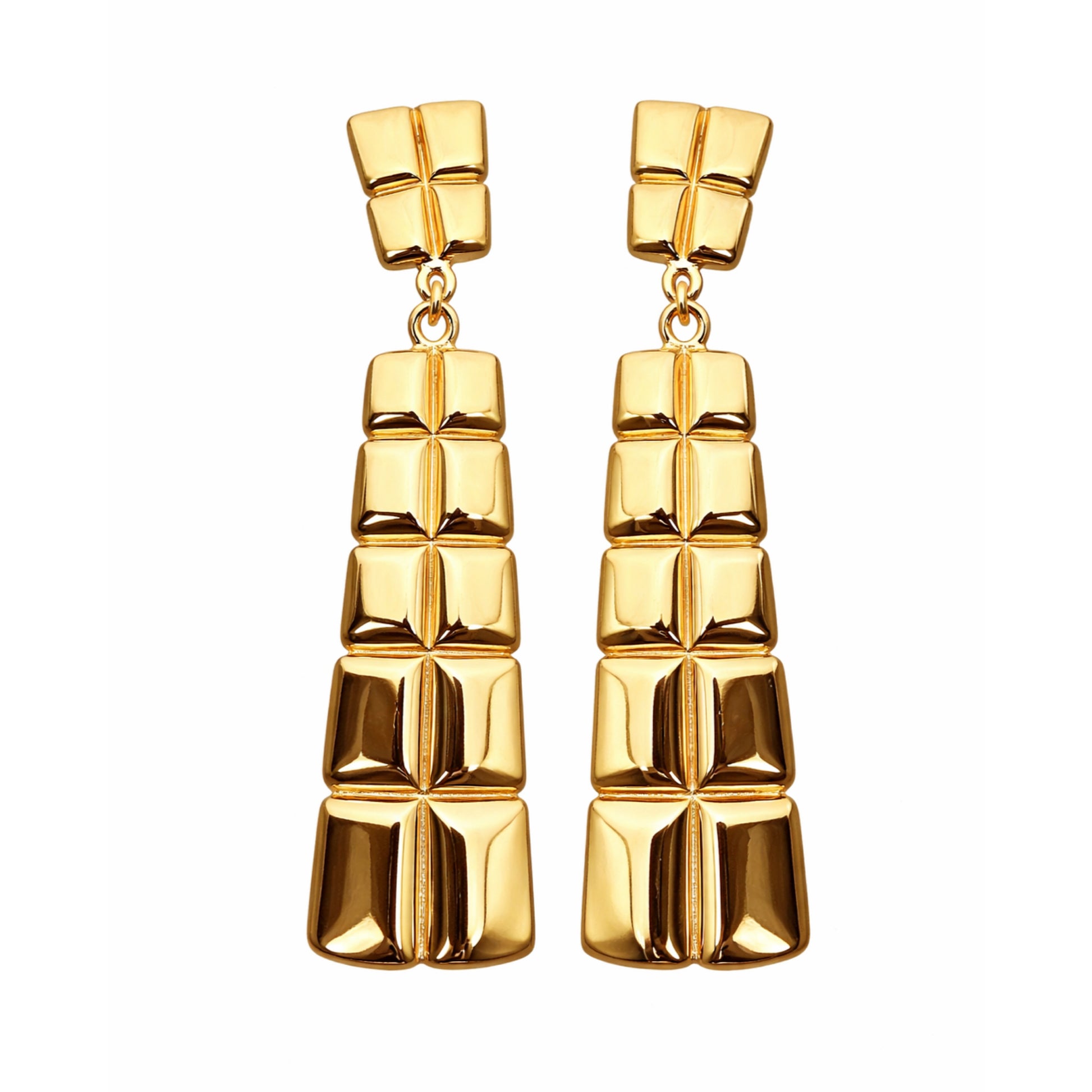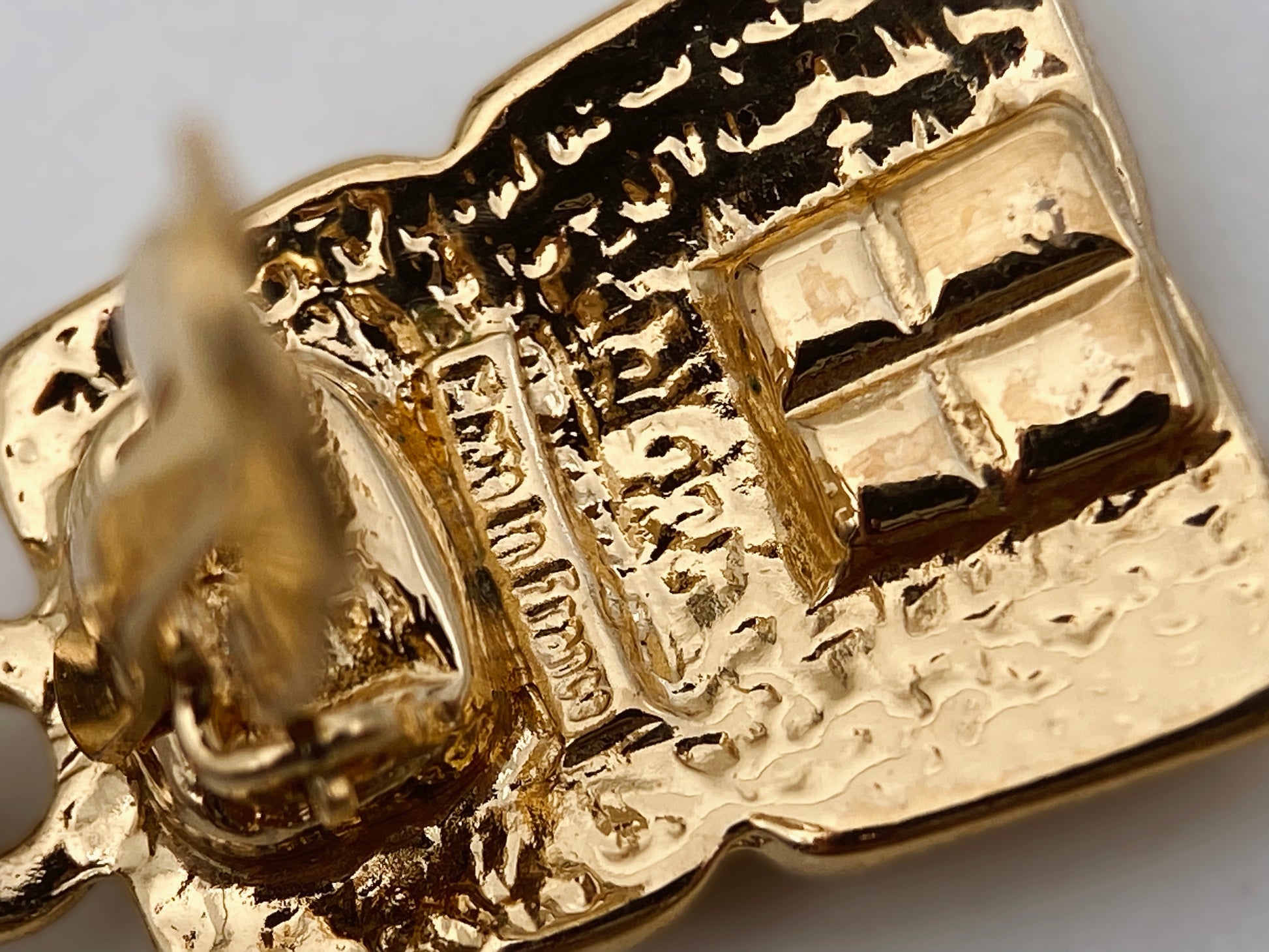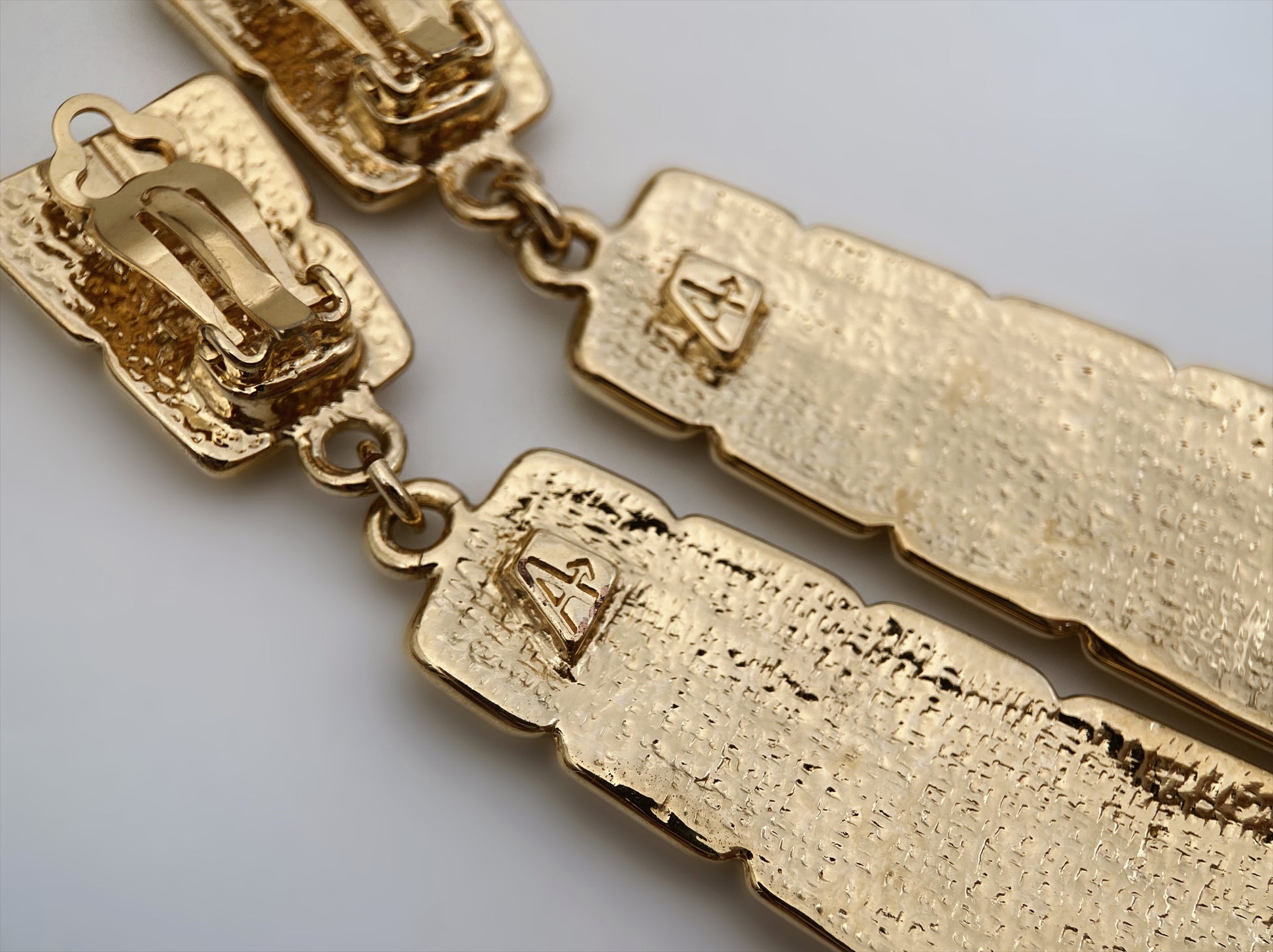 Auskarai yra masyvūs, architektūrinio segmentuoto dizaino, būdingo 9-ojo dešimtmečio prancūziškai bižuterijai. Reljefiškai sukurti blokiniai elementai sukuria skulptūrinį efektą, o kokybiškas liejimas ir tvirtas klipsinis mechanizmas rodo profesionalią studijinę gamybą.