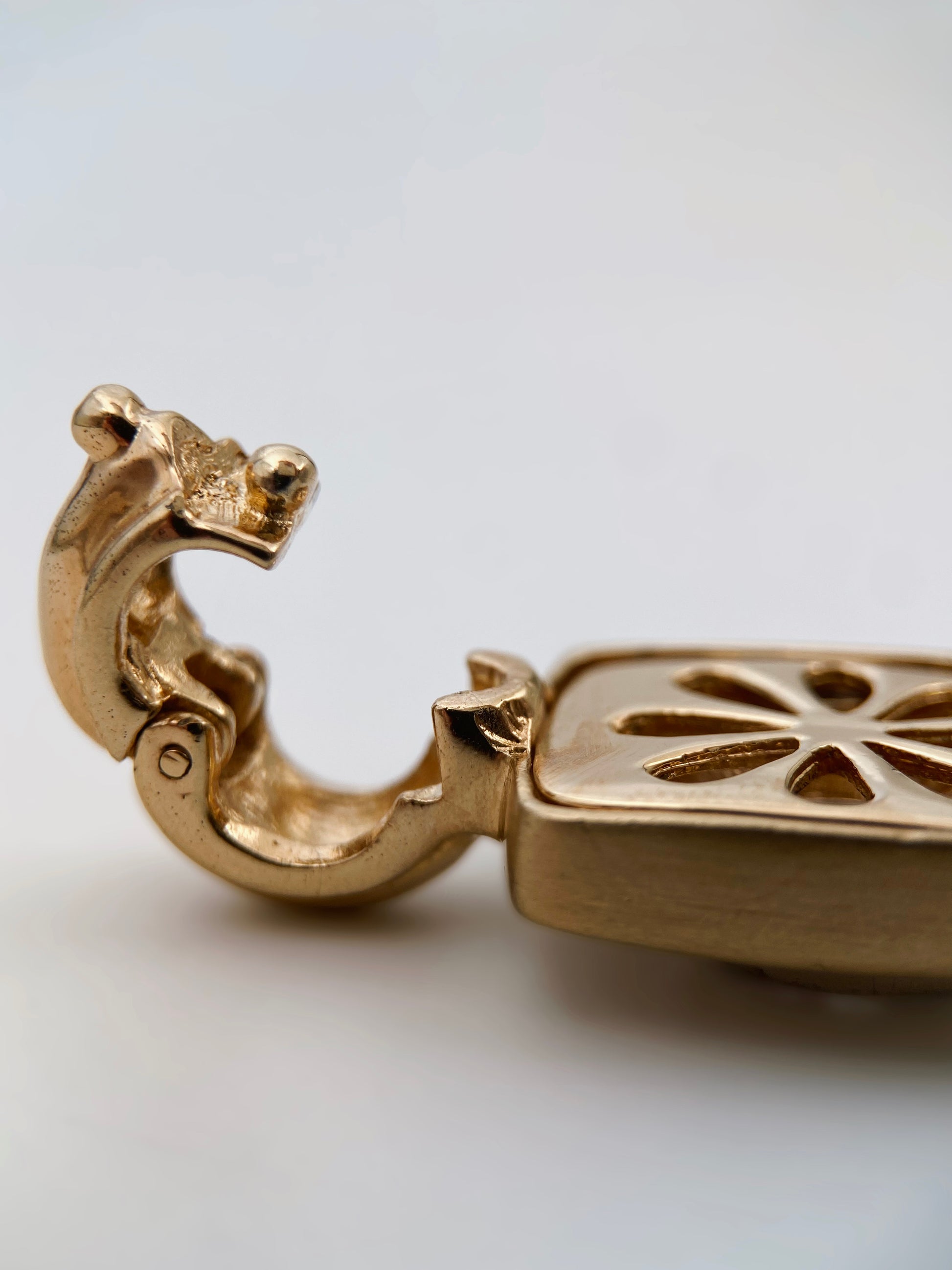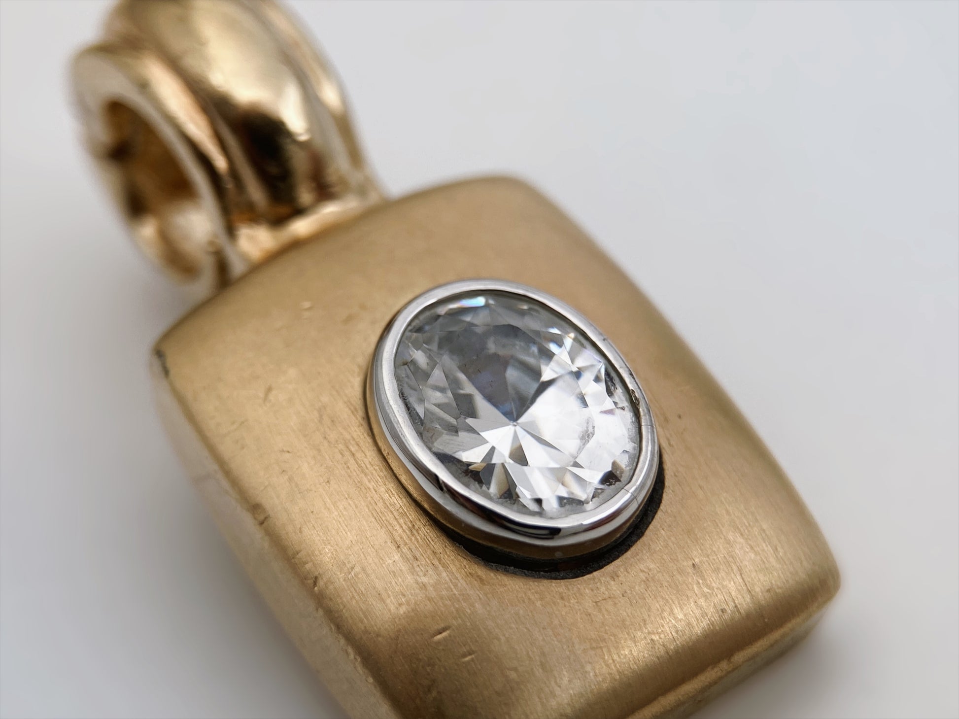 Modernistinio, minimalistinio dizaino pakabukas su įleistu (bezel tipo) apvaliu kristalu. Matinis aukso paviršius kontrastuoja su ryškiu, šviesą stipriai laužiančiu akmeniu, todėl papuošalas atrodo solidžiai ir šiuolaikiškai. Forma kompaktiška, universali – tinka tiek prie masyvesnės grandinėlės, tiek prie minimalistinio kaklo papuošalo.