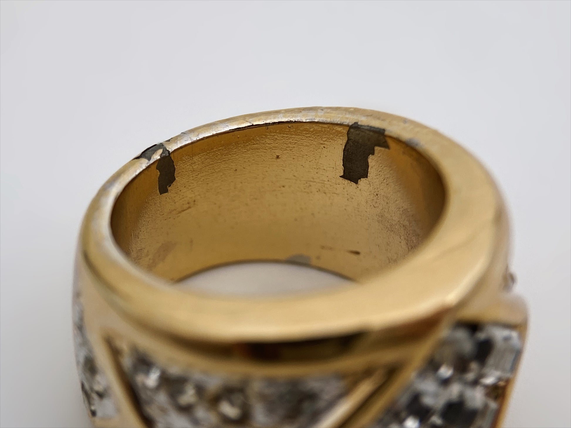 Sudėtis: metalas, kristalai Būklė: patenkinama Išmatavimai: 17 mm (7 dydis) Spalva: aukso, balta Šalis: JAV Žymėjimas: nėra Laikotarpis: 1980-1990 metai Rinkos vertė: 20-30 €