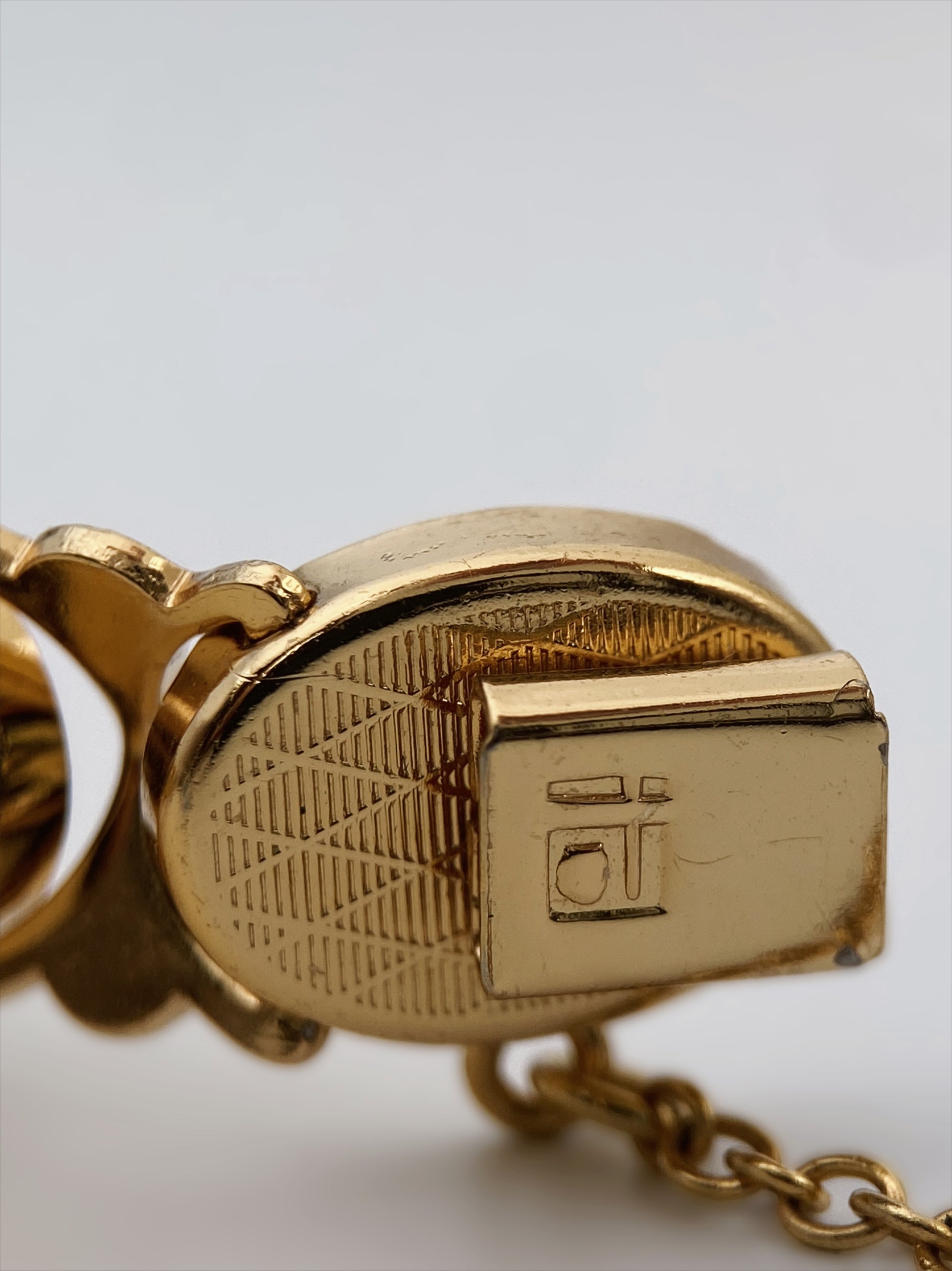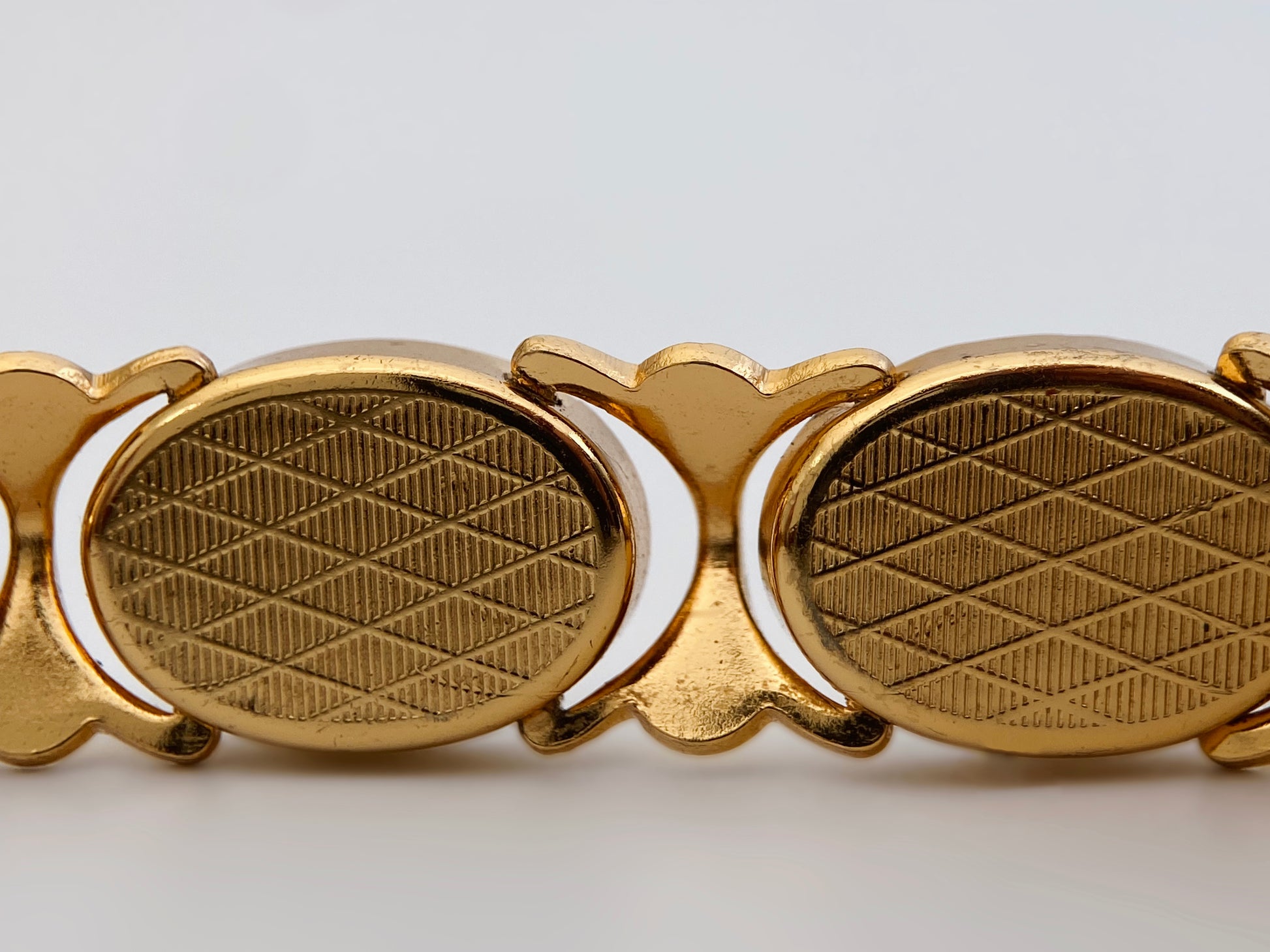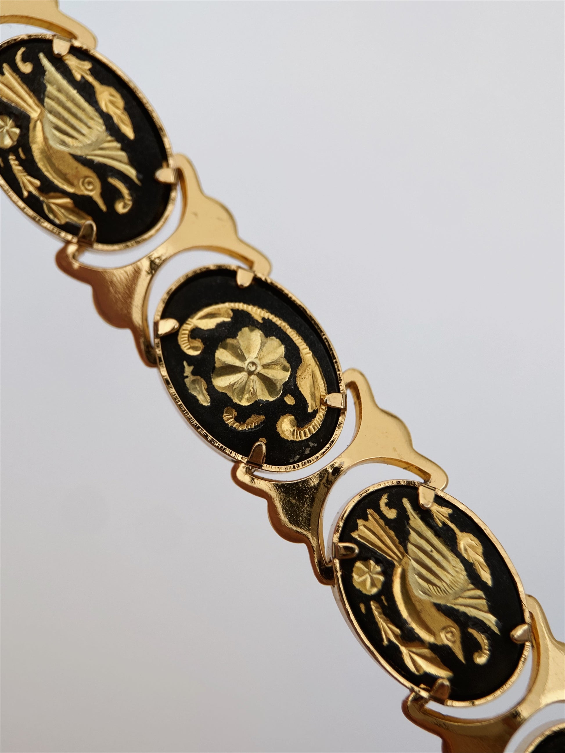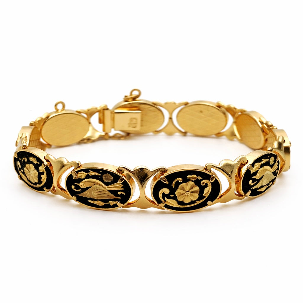 Apyrankė sudaryta iš ovalių segmentų, dekoruotų tradicine Toledo damaskino technika – aukso spalvos ornamentai ir paukščių motyvai įkomponuoti juodame fone. Reljefinis paviršius ir klasikinė kompozicija atspindi ispanišką dekoratyvinę tradiciją. Modelis su saugos grandinėle ir solidžiu užsegimu rodo kokybišką gamybą. Damaskino papuošalai yra kolekcionuojami, ypač geros būklės ir su aiškiais motyvais.