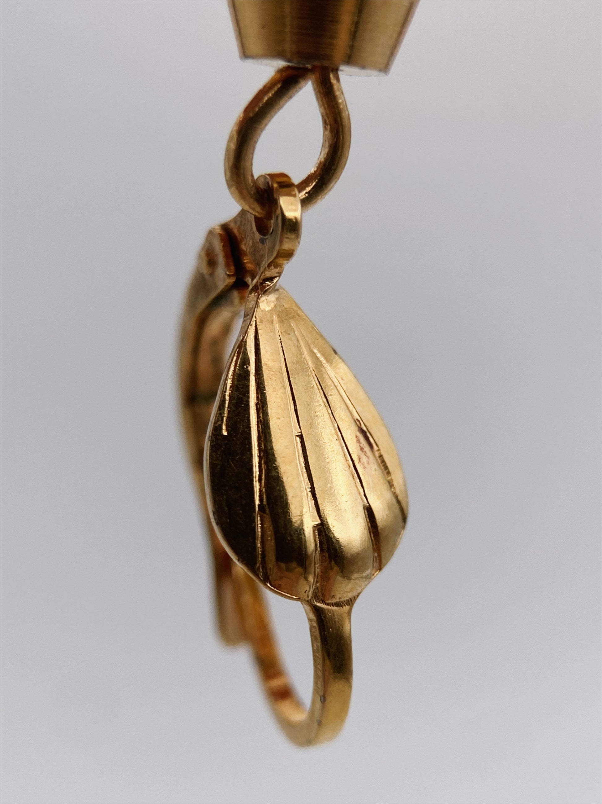 Išraiškingo dizaino auskarai su stilizuota viršutine dalimi ir kabančiu cilindriniu, tekstūruotu pakabuku. Derinamas poliruotas ir mechaniniu būdu graviruotas paviršius sukuria subtilų šviesos žaismą. Forma primena modernistinę / brutalistinę kryptį, būdingą to laikotarpio europinei bižuterijai. Konstrukcija tvirta, su senesnio tipo klipsiniu mechanizmu. Prekės kodas: RF107