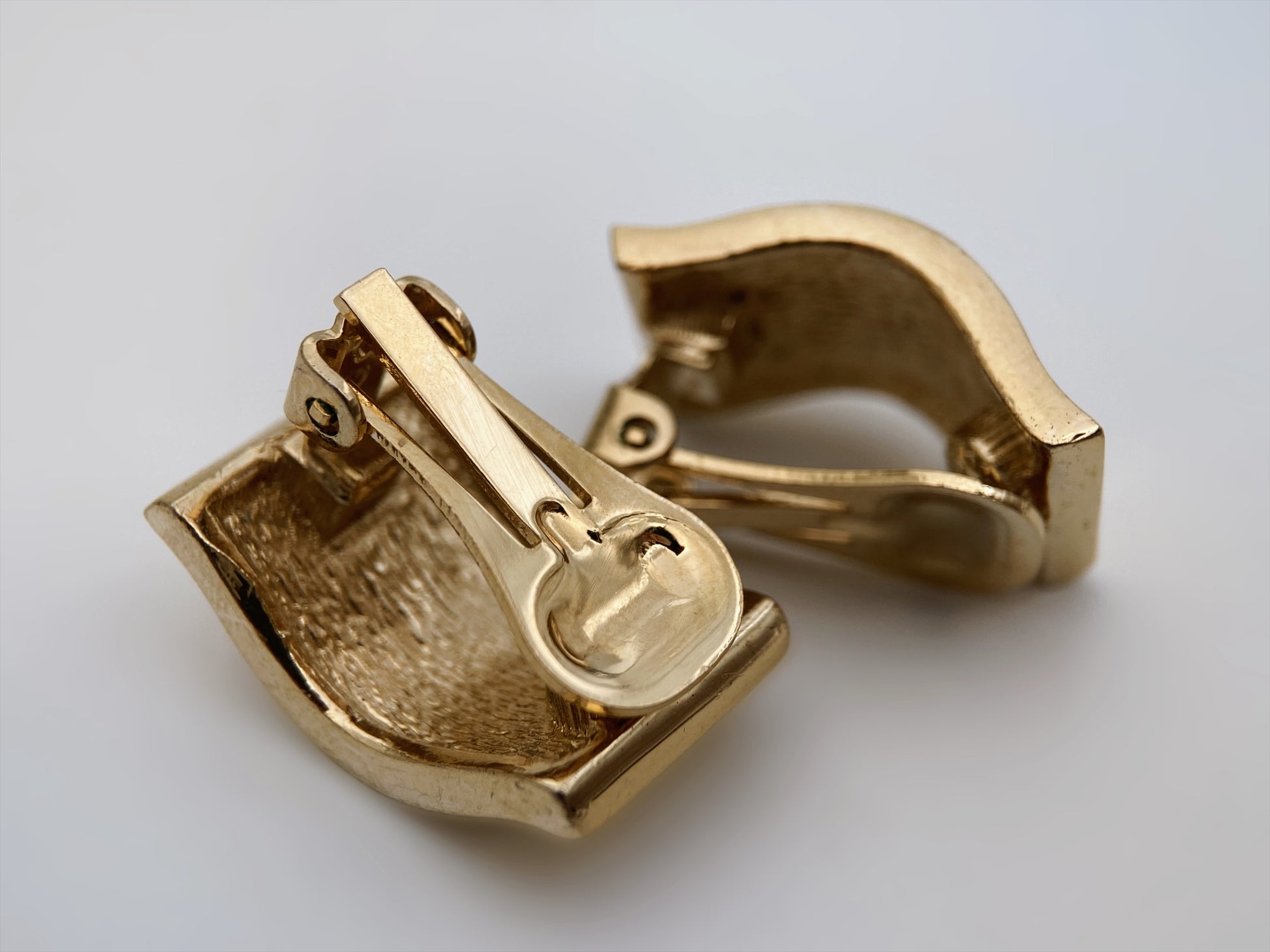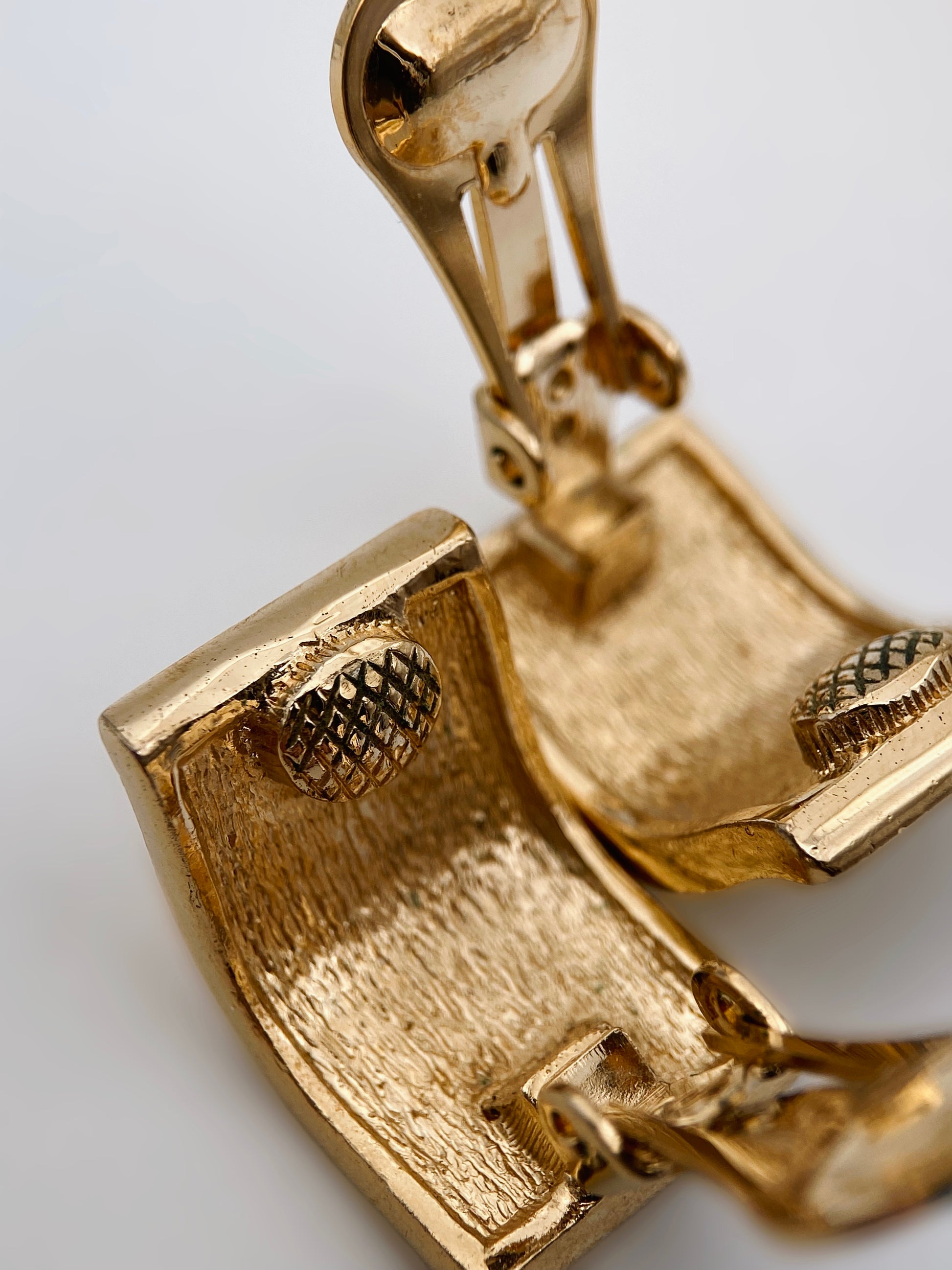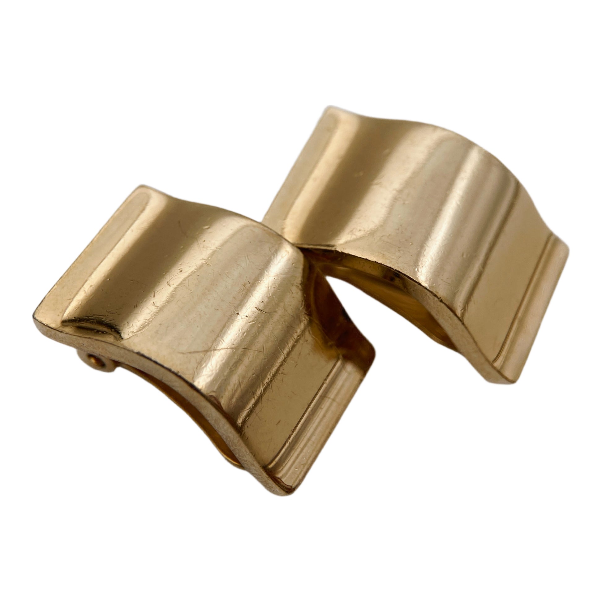 Išraiškingi, architektūrinės formos auskarai su švelnia banguota, skulptūrine linija. Paviršius lygus, poliruotas, su subtiliais reljefiniais akcentais kraštuose. Forma primena modernistinę metalo skulptūrą.