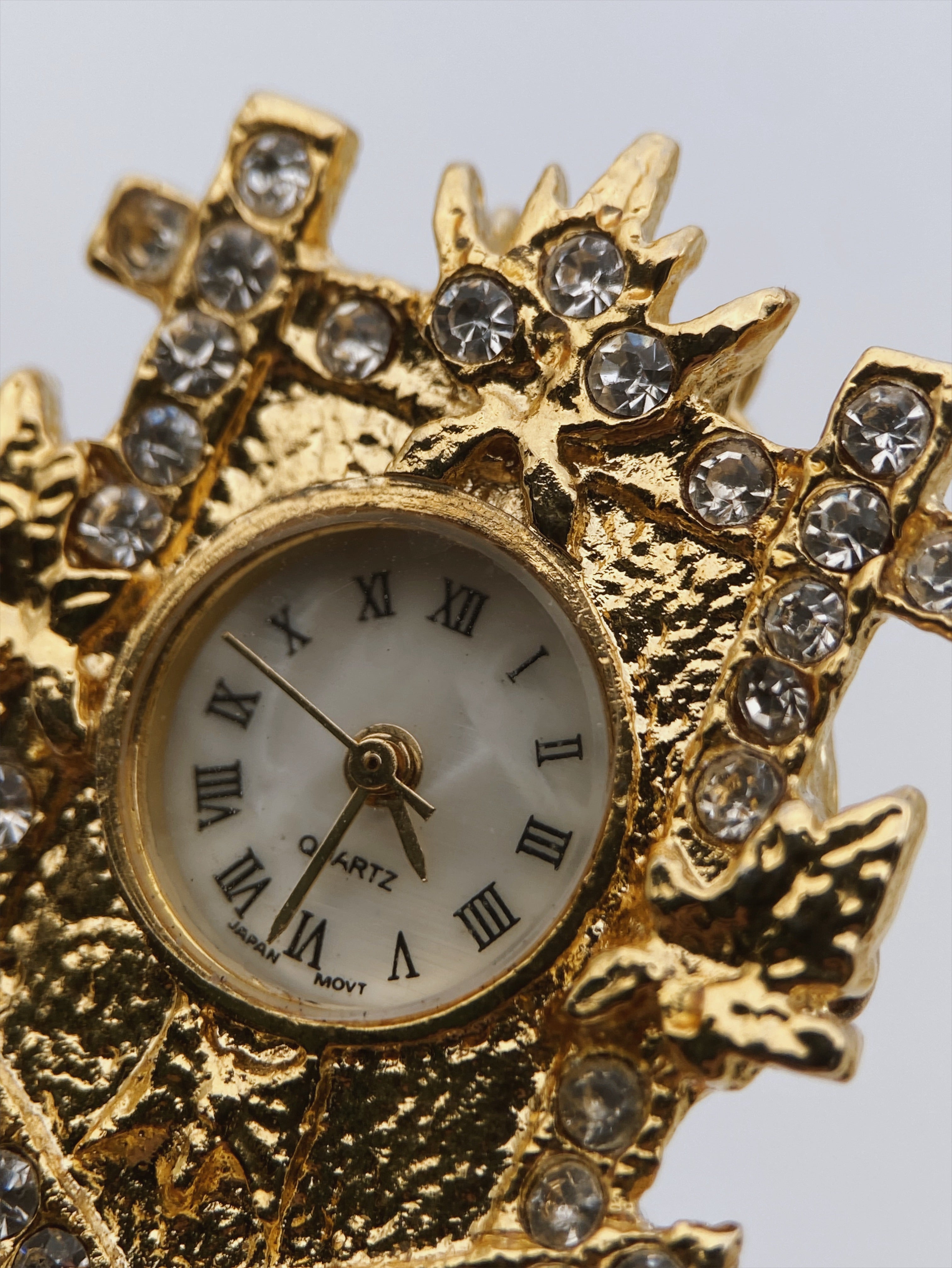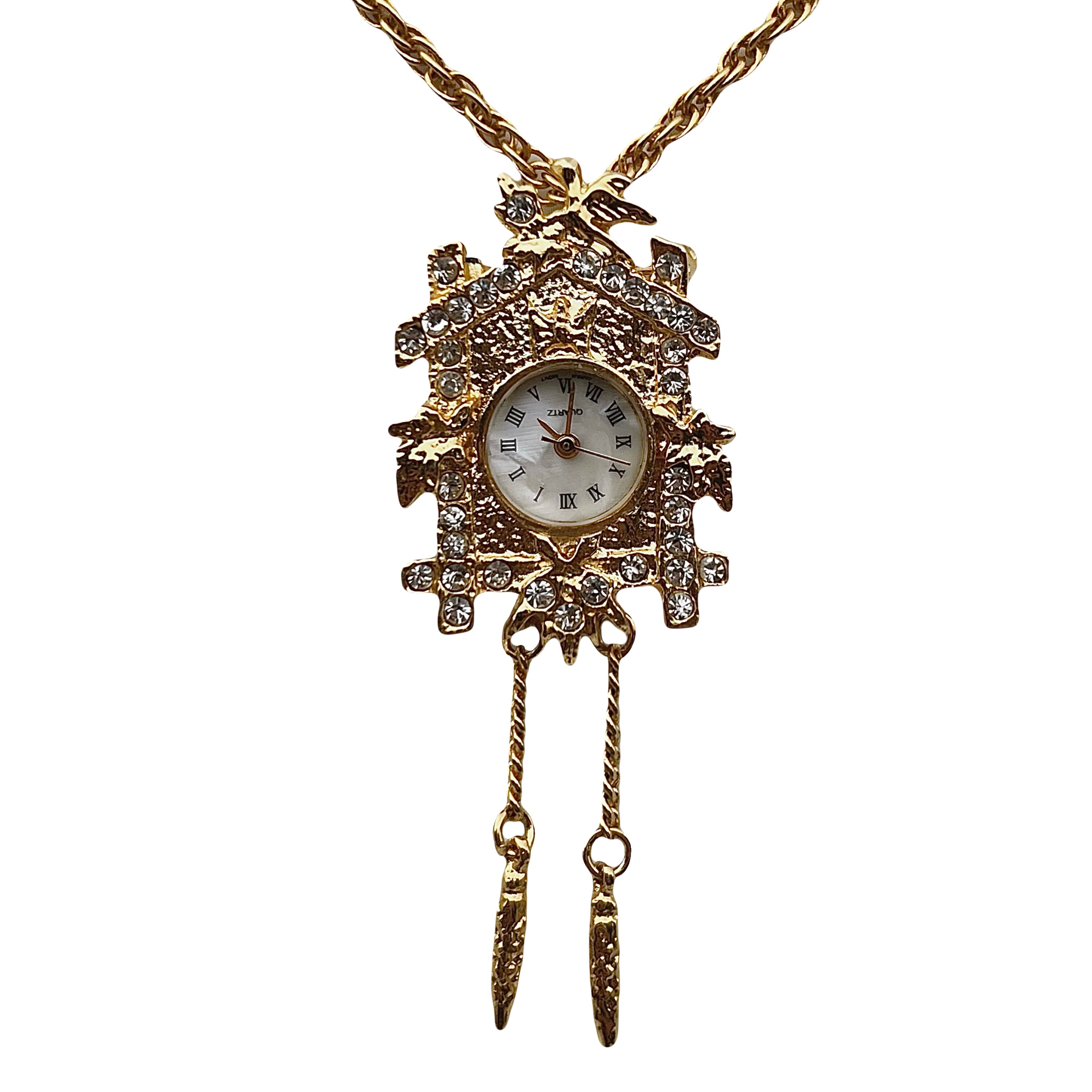 Šis laikrodis yra vintažinio stiliaus kaklo pakabukas su laikrodžiu, kuris primena tradicinį gegutės laikrodį su kabantčiais svareliais. Mažas ciferblatas su perlamutriniu pagrindu ir romėniškais skaitmenimis. Kvarcinis mechanizmas, pažymėtas „QUARTZ JAPAN MOVT“ (tai reiškia japoniškas kvarcinis mechanizmas), tikėtina, kad pagamintas JAV.