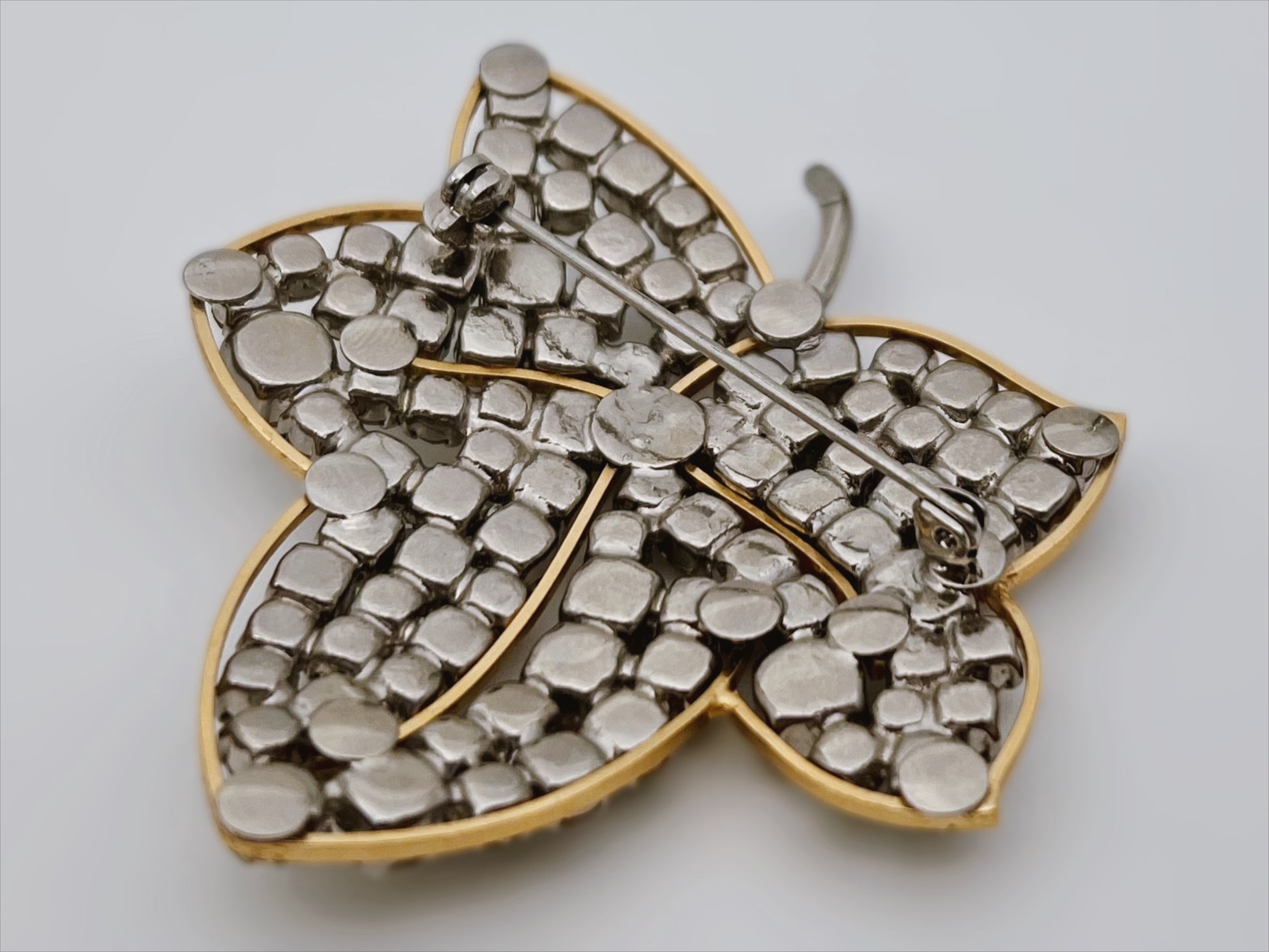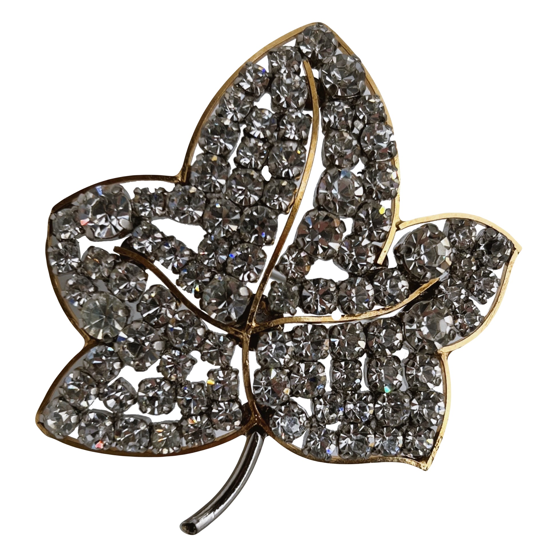 Vintažinė klevo lapo formos sagė, dekoruota skaidriais kristalais. Tai labai būdingas XX a. vidurio (apie 1950–1960 m.) kostiuminės bižuterijos stilius. Tankiai išdėlioti stikliniai kristalai, įtvirtinti pavieniais dantukais – tai aukštesnės klasės bižuterijos ženklas (priešingai nei klijuoti akmenys).