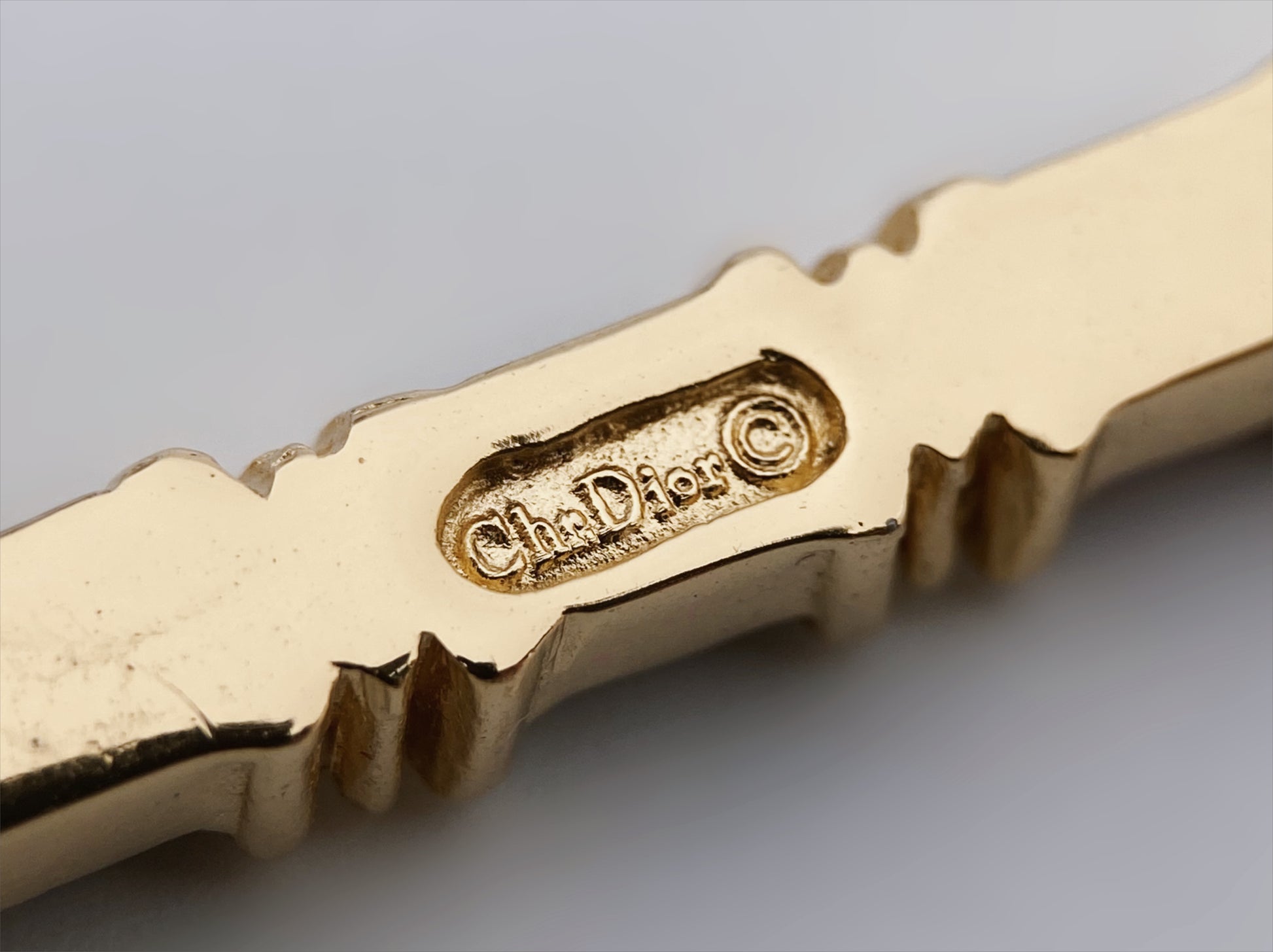 “Chr. Dior ©” – autentiškas Dior žymėjimas, naudotas 1950–1970 m., dažnai ant papuošalų, gamintų bendradarbiaujant su “Henkel & Grossé”. Šio sagės dizainas labiausiai atitinka 1965–1970 m. Dior bižuteriją, kuri jungė architektūrinį minimalizmą su spalvų kontrastu.