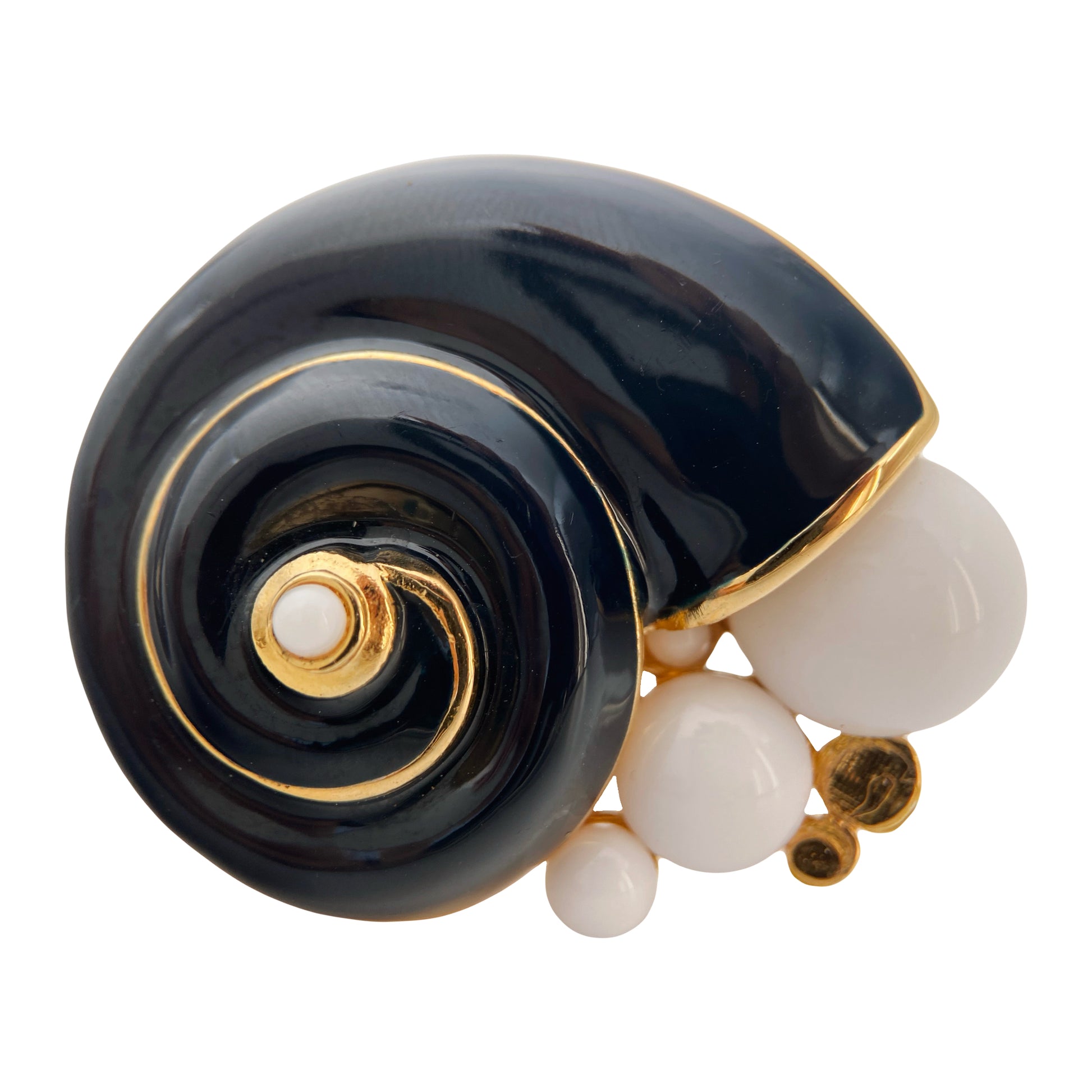 Aukso spalvos spiralės formos sagė (kriauklė) su juodu emaliu. Stilius - skulptūrinis, modernistinis. Tokie spiralės/korpuso motyvai mažiau dažni nei klasikinės formos. Ši segė – vienas įspūdingiausių ir labiausiai kolekcinę vertę turinčių “CS” (Collins Seitz) žymėtų papuošalų, reprezentuojantis ne tik dailų dizainą, bet ir aukštos kokybės gamybą bendradarbiaujant su St. John. Kolekcininkų vertinami „St. John“ papuošalai: „Logo“ dizaino sagės ir auskarai su „CS“ simboliu; klasikiniai perlų ir juodo emalio deriniai; didelės, struktūrinės sagės – ypač vabzdžių, gyvūnų ar geometrinių formų; retesni papuošalai su emaliu ar spalvotais kristalais.