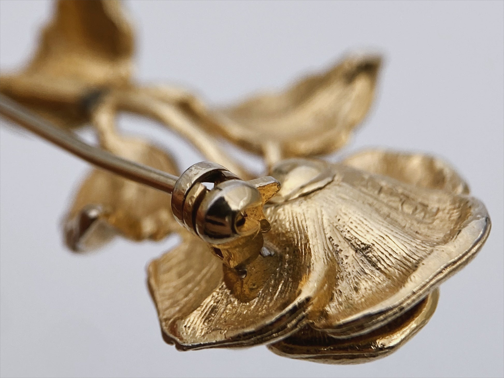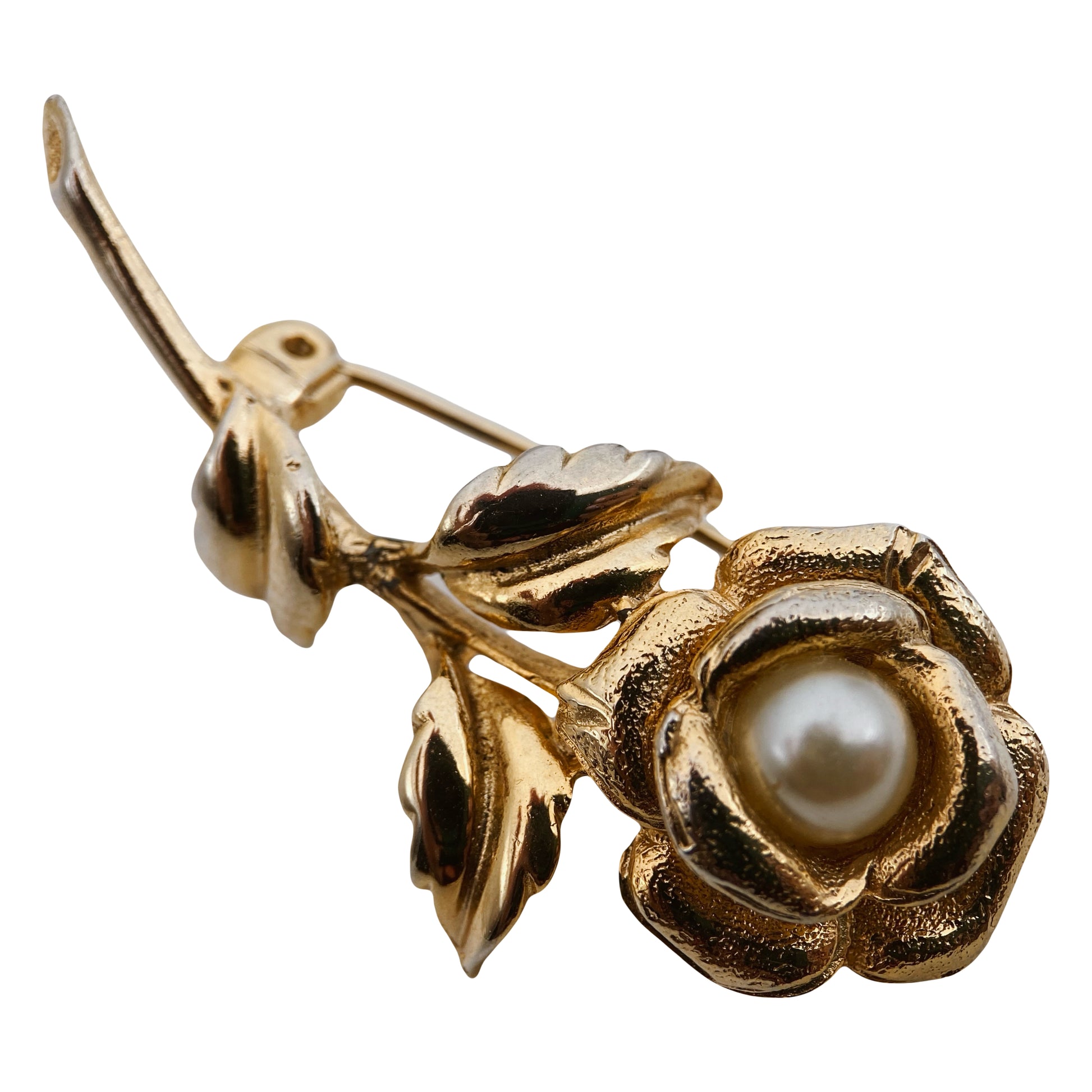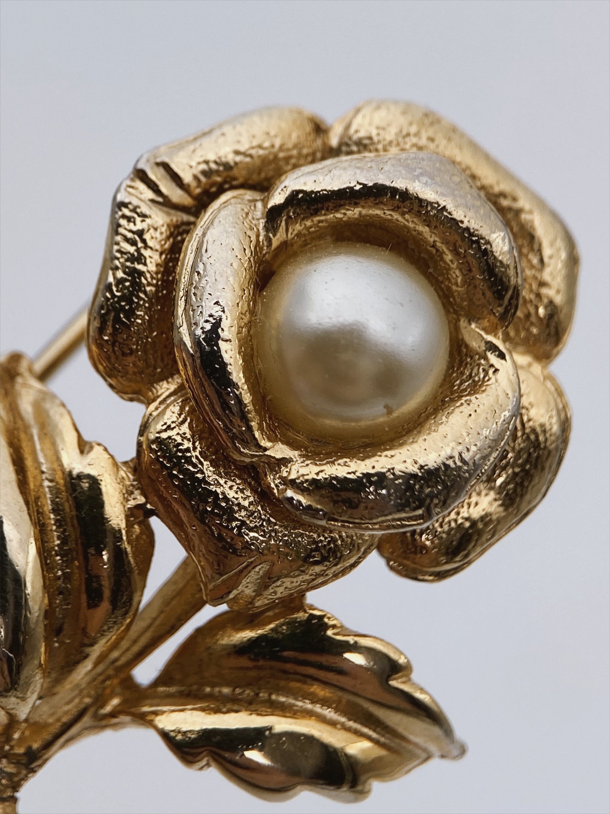 Klasikinė vintažinė rožės formos segė su dirbtiniu perlu centre. Ji yra paauksuoto metalo, dekoruota lapeliais ir žiedo žiedlapiais, ir pažymėta „NI20“ ženklinimu.