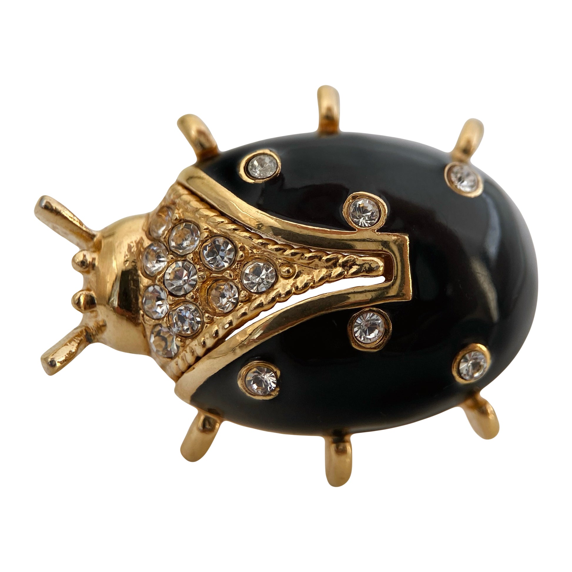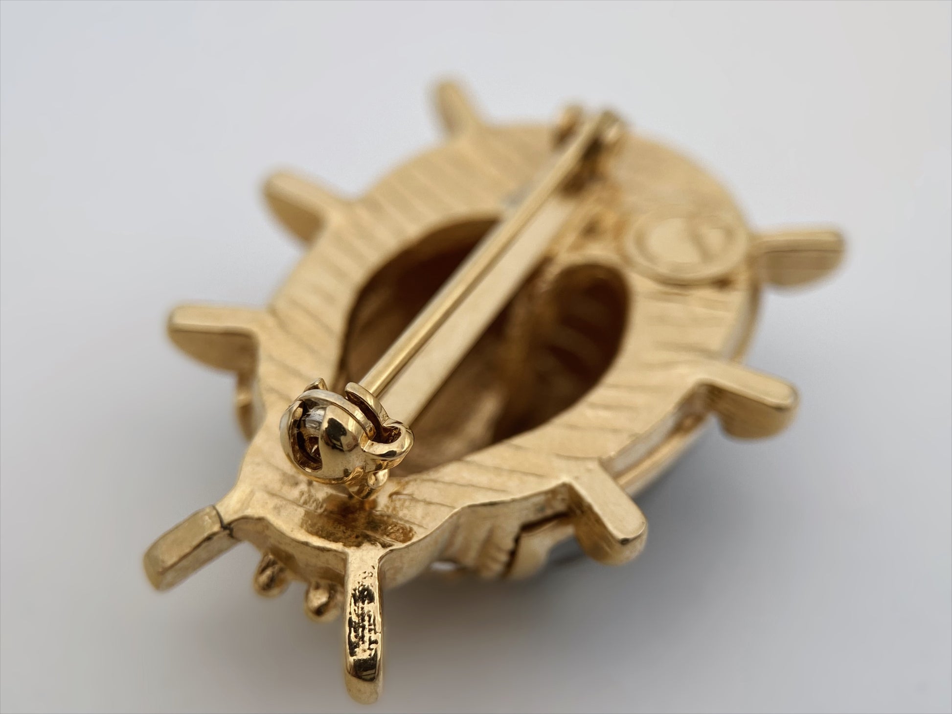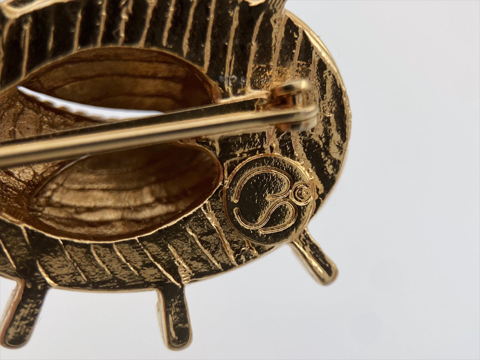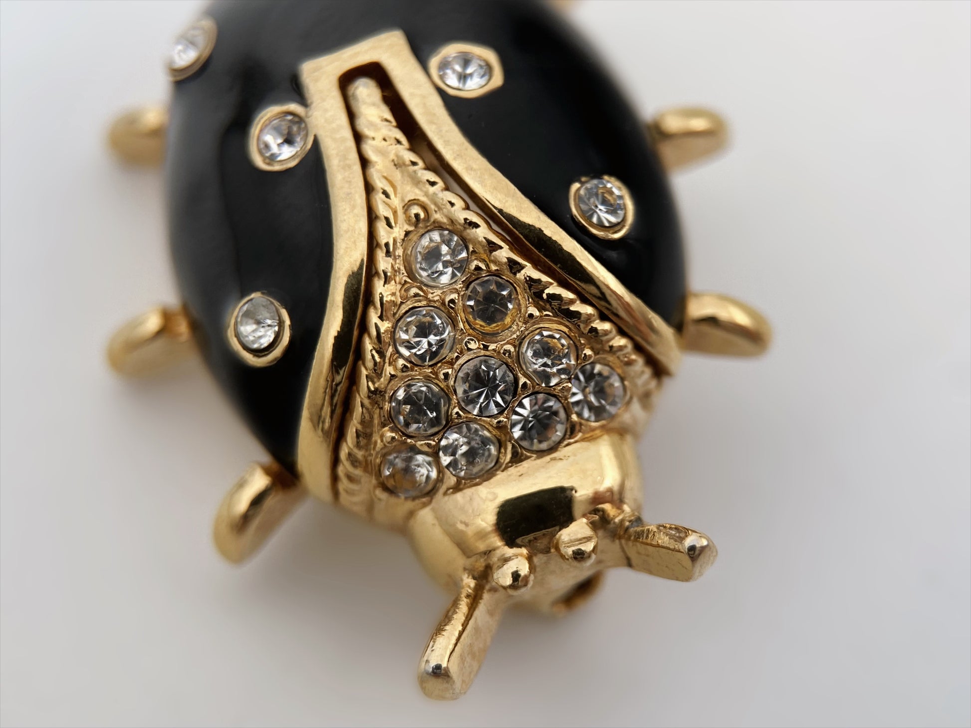 Sudėtis: paauksuotas metalas, kristalai, emalė Gamybos būdas: rankų darbas Būklė: labai gera Išmatavimai: 3 x 2,5 cm Spalva: aukso, juoda Žymėjimas: St John logotipas (“CS”) Šalis: JAV Laikotarpis: 1995-2000 metais Rinkos vertė (boružės modeliai): 100–150 €