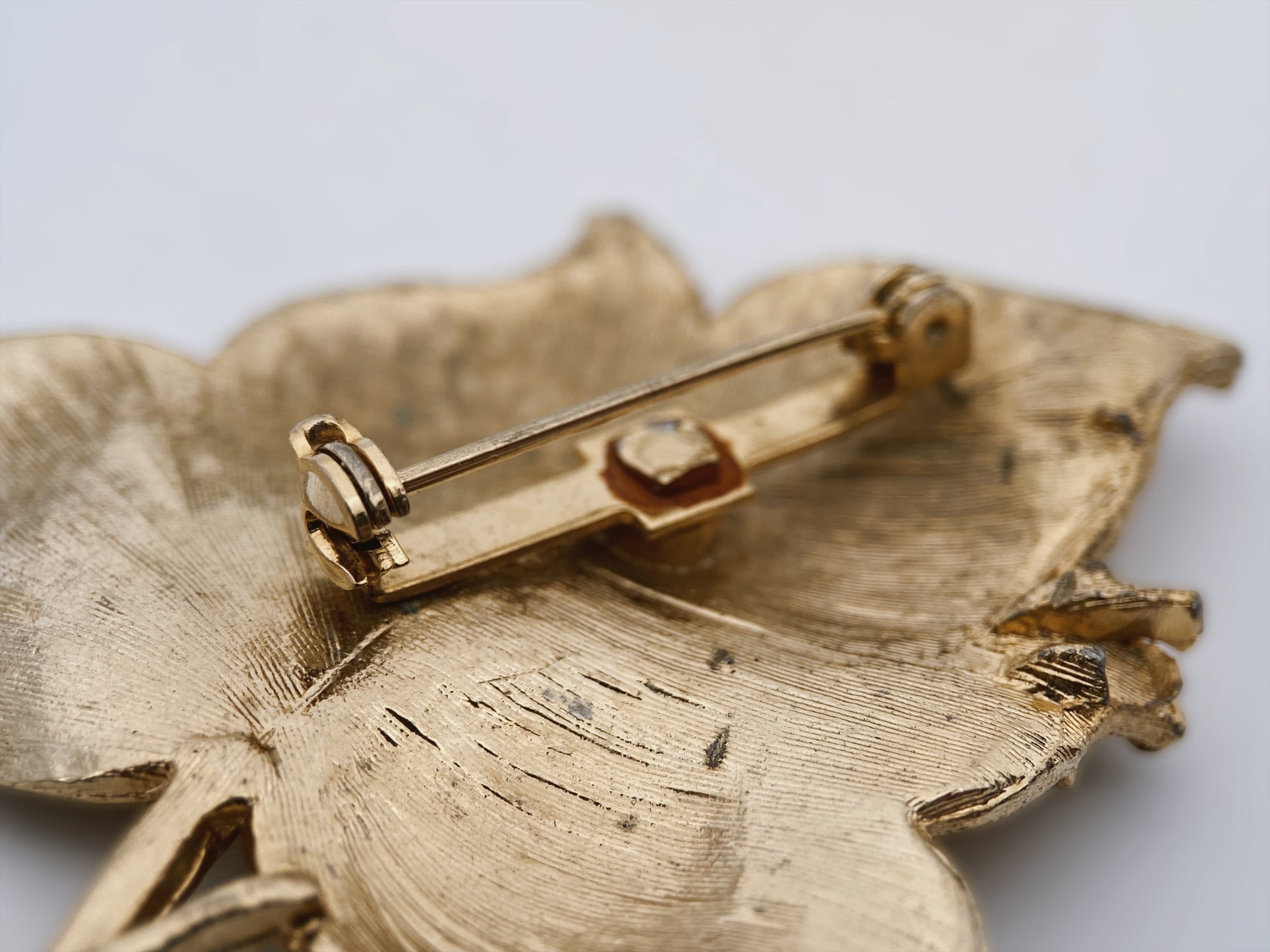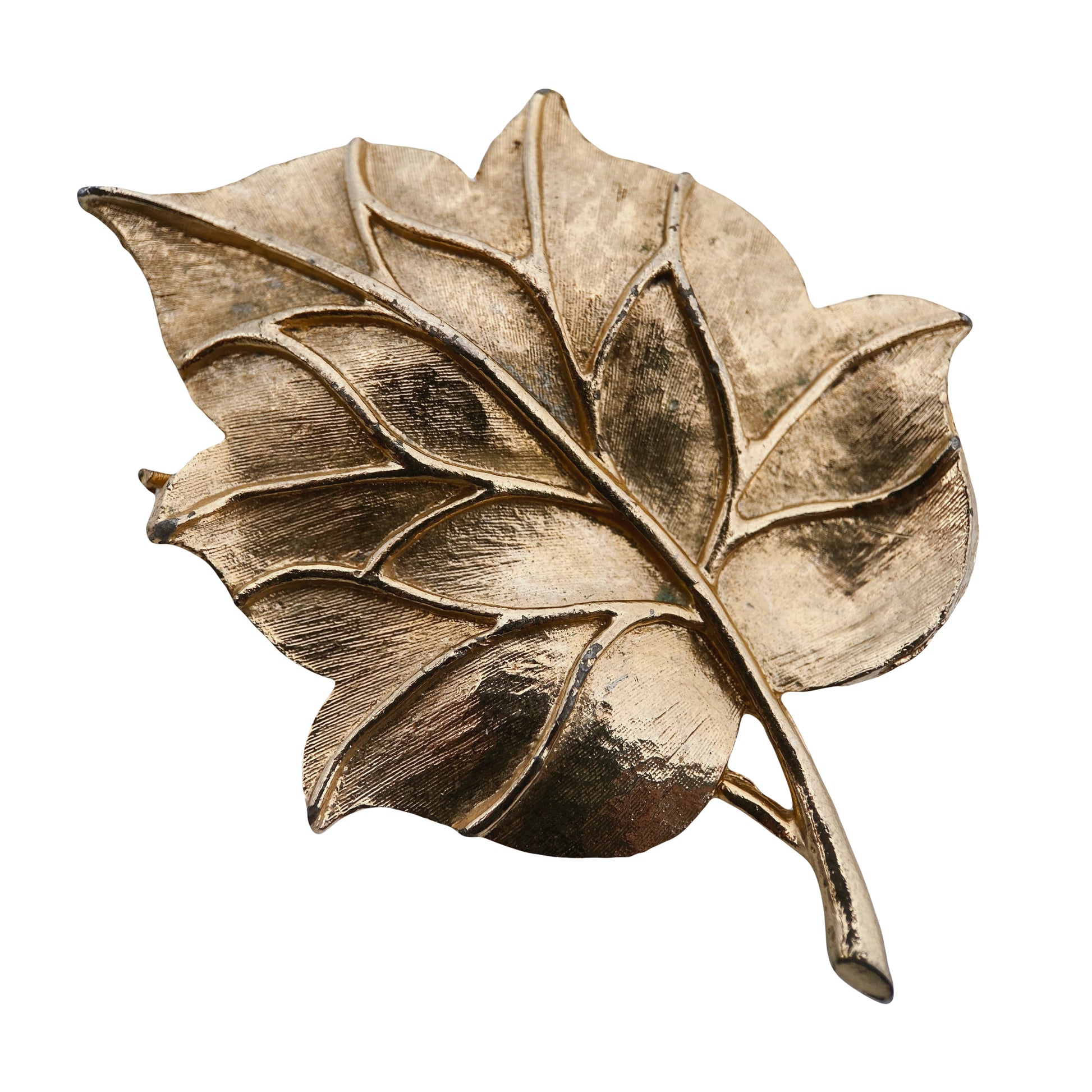 Ši lapo formos segė yra gražus pavyzdys vidurio XX a. vintage bižuterijos, net jei ji nepažymėta. Lapelis – populiarus motyvas 1950–1970 m. bižuterijoje (ypač rudeninių ar natūralių motyvų kolekcijose). Aukso spalvos presuotas metalas su tekstūriniu paviršiumi. Tipinis „rolling C clasp“ užsegimas su apsauginėmis ritėmis – dažnai naudotas 1950–1970 m.