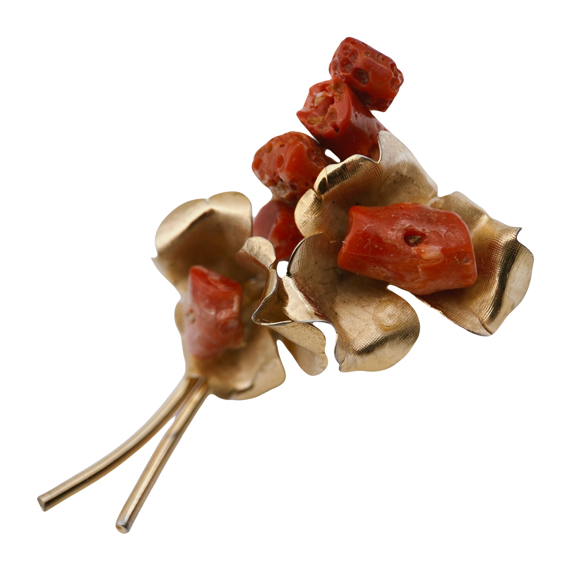 Unikali 1950-1970 m. laikotarpio segė, dekoruota natūraliais raudonojo koralo gabaliukais. Kiekvienas akmuo – neapdirbtas (tai didelis privalumas), išlaikęs organišką formą, todėl segė yra visiškai unikali. Metalo lapeliai formuoti rankiniu būdu, suteikiant jiems subtilaus judesio ir tekstūros pojūtį.
