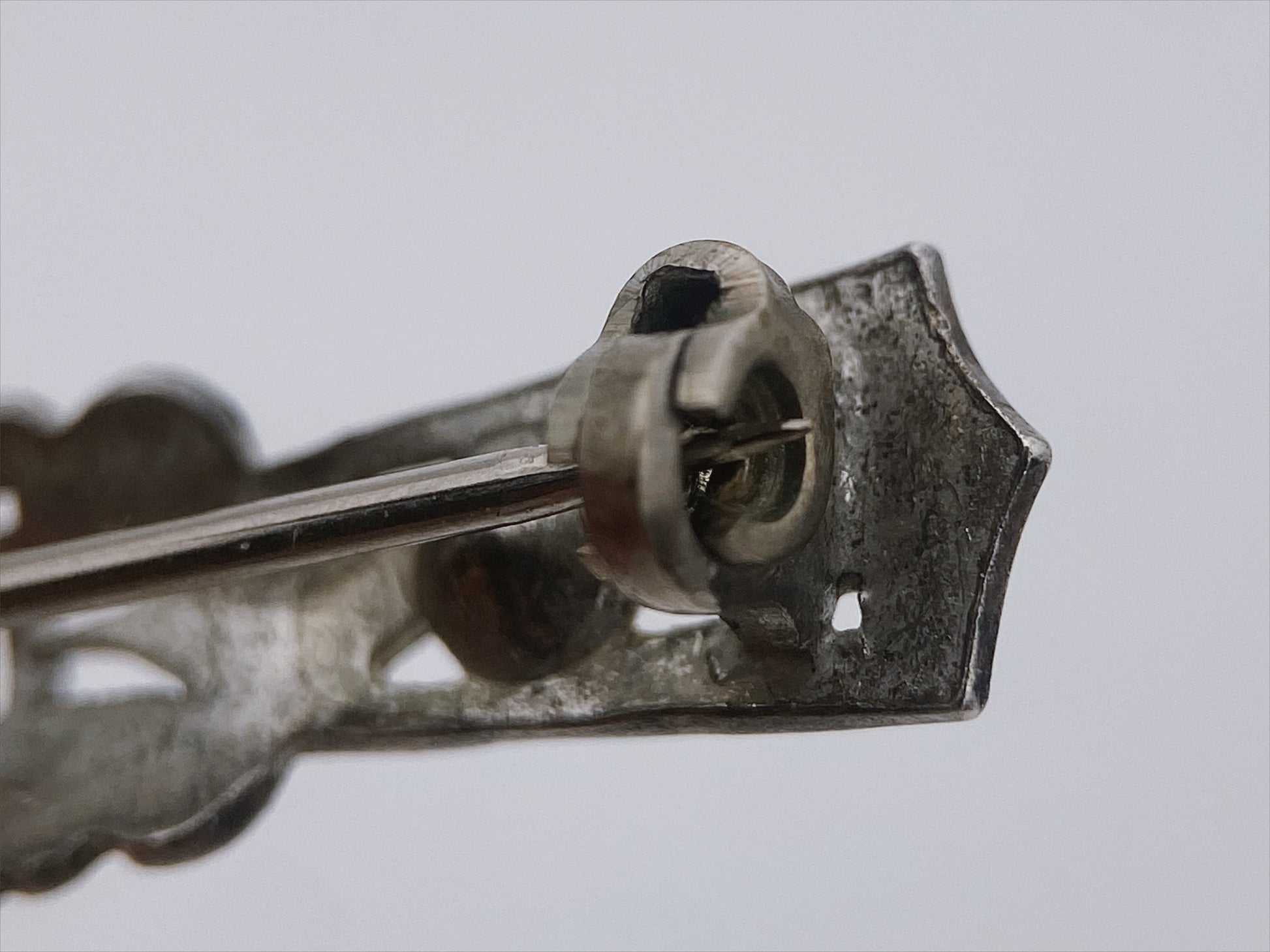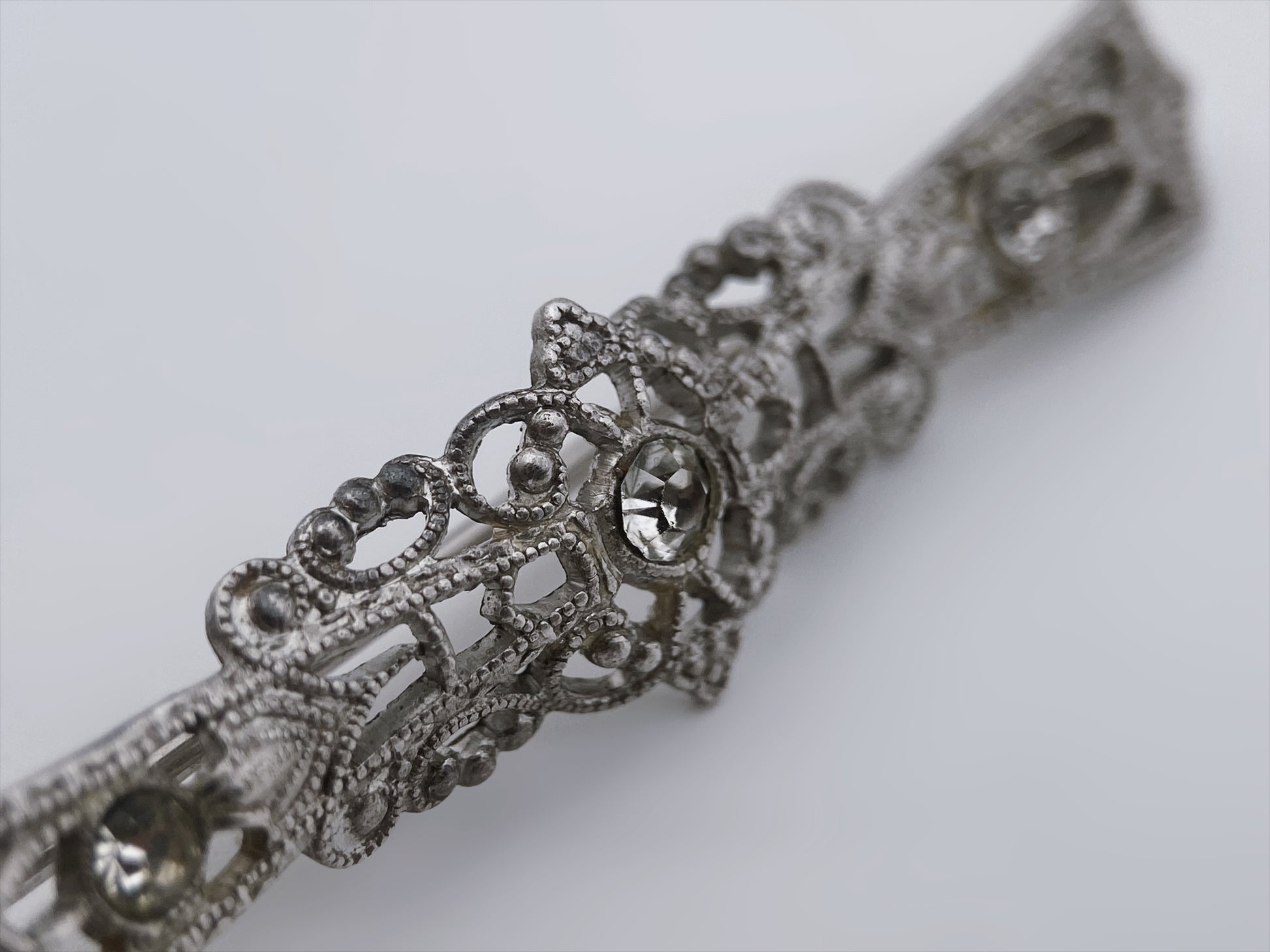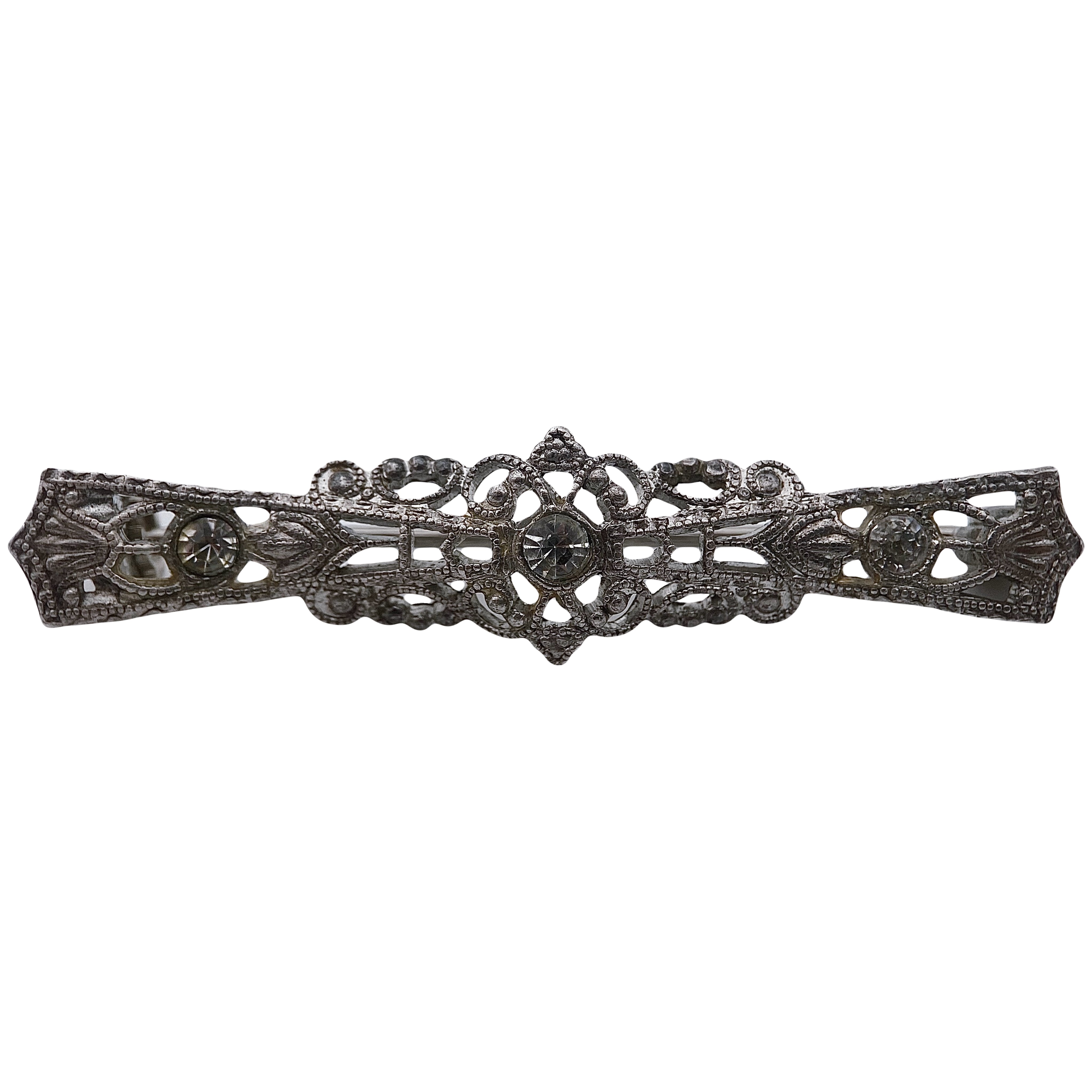 Ažūrinio dizaino sagė iš sidabro spalvos metalo, puošta trimis skaidriais stiklo kristalais. Sagės paviršius dekoruotas smulkiomis granulėmis ir augaliniais ornamentais, primenančiais edwardiško ar art deco laikotarpio estetiką. Metalas yra nepoliruotas, su švelnia patina, suteikiančia senovinį charakterį. Išraiškingas dizainas, turintis panašumų su Edwardian (1900–1915) arba Art Deco (1920–1930) stiliais.