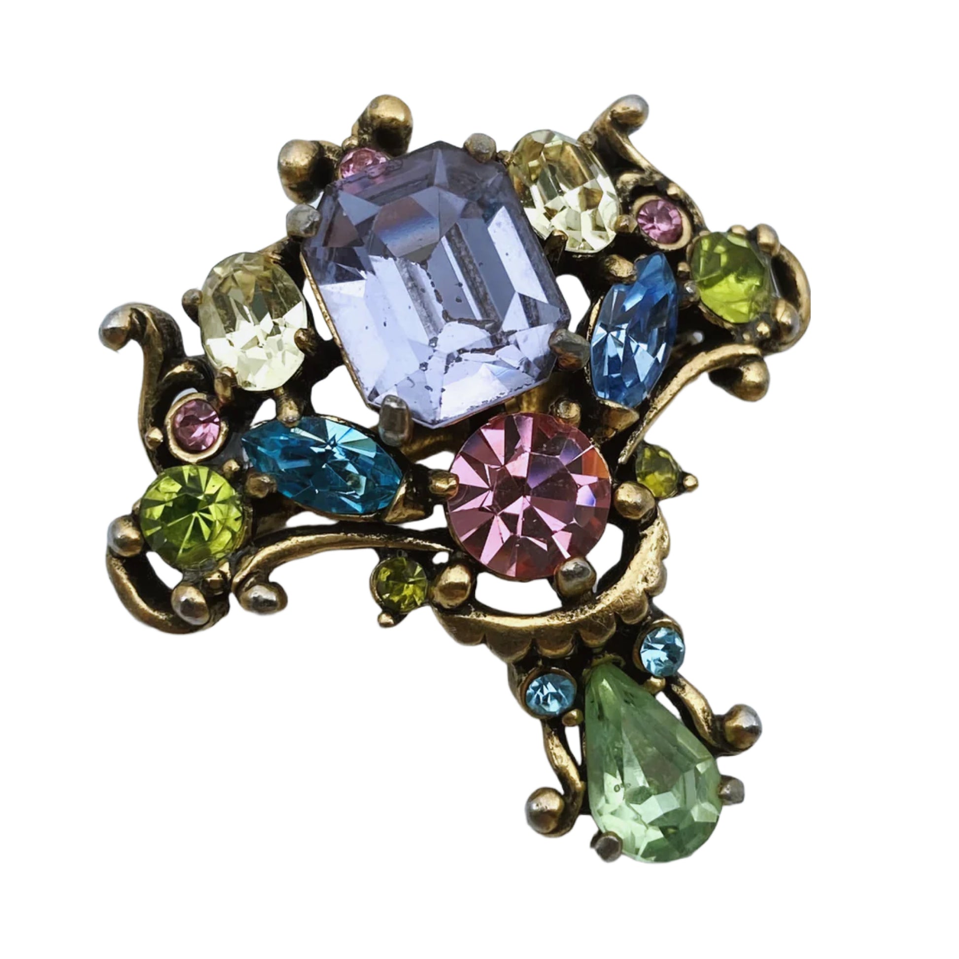 Originali “Hollycraft” sagė iš 1953 metų – tai vieni iš labiausiai kolekcionuojamų “mid-century” kūrinių. Įmonė veikė JAV, nuo 1938 m. iki 1971 m., iš pradžių kaip „Hollywood Jewelry Mfg. Co.“, vėliau pervadinta į „Hollycraft“. Garsėjo spalvotų kristalų kompozicijomis, barokiniu, rokokiniu dizainu. 1950–1960 m. buvo jų aukso laikotarpis – būtent tada ženklindavo papuošalus su konkrečiais metais („Hollycraft 1953“). Metalas: auksaspalvis lydinys, labai stabilus. Įvairių formų spalvoti kristalai – purpurinis, žalias, rožinis, geltonas, melsvas. Visi įstatyti į aukštos kokybės grifelius (prong-set). „HOLLYCRAFT 1953“ – tai autentiškas metų įrašas, naudotas ant riboto leidimo kolekcijų. 1953 m. kolekcijos išsiskiria pastelinėmis spalvomis ir gotikiniais akcentais. Sagės su datavimu yra kolekcininkų itin vertinamos, nes aiškiai identifikuoja leidimą.