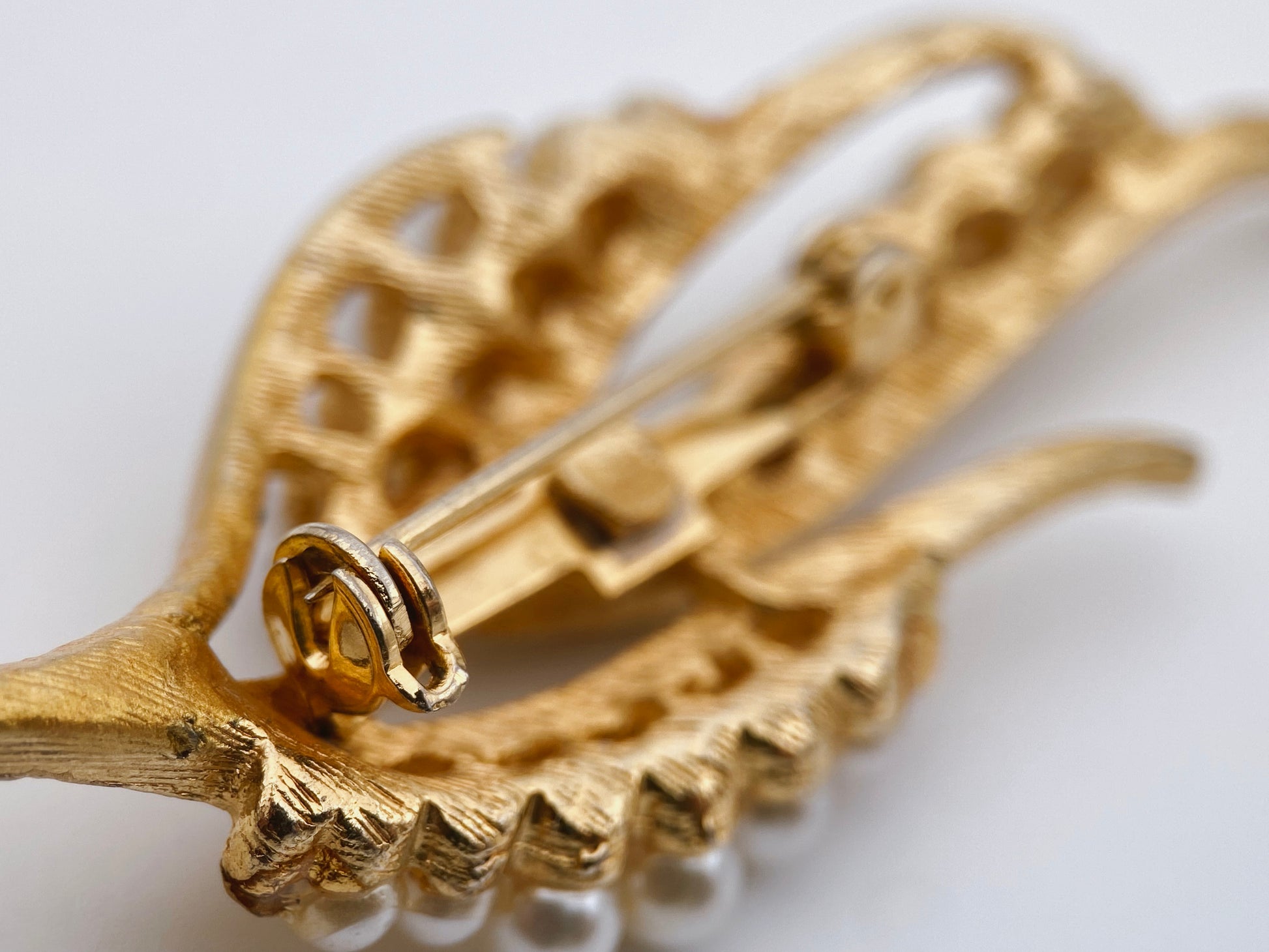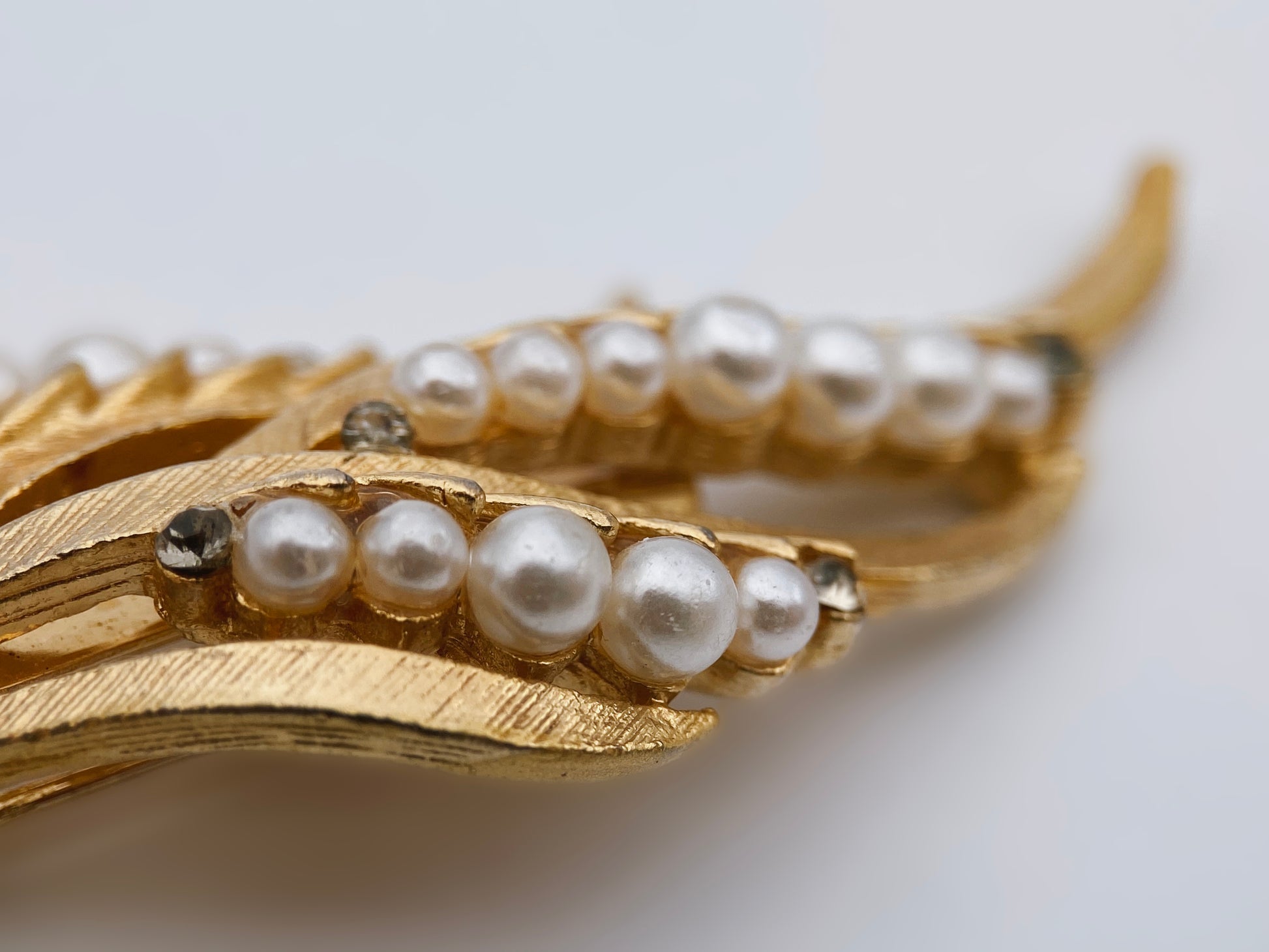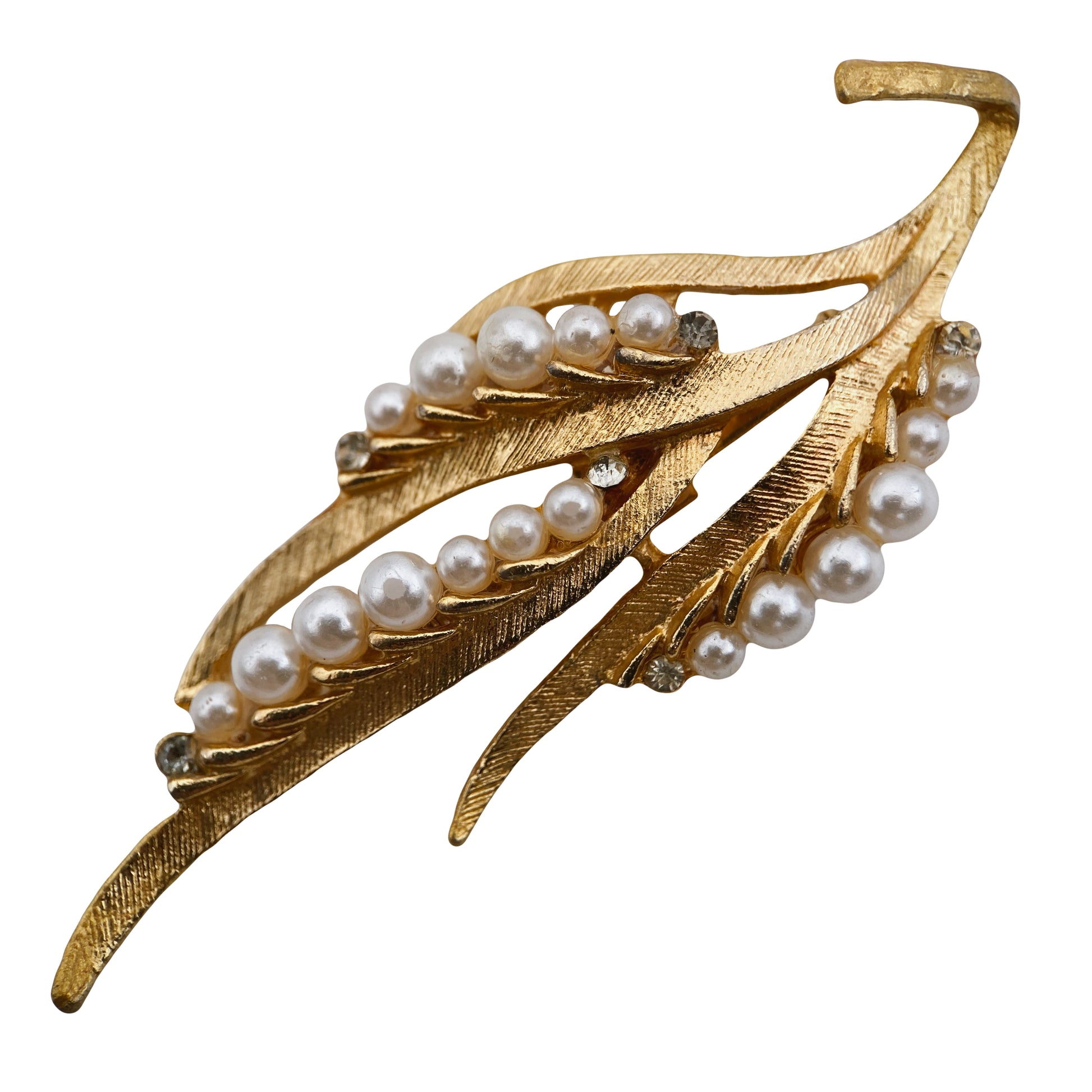 Tai vintažinė sagė iš JAV, dekoruota perlų imitacijomis ir skaidriais kristalais, be gamintojo žymėjimo. Dizainas primena lapo arba plunksnos formą, būdingą 1950–1970 m. amerikietiškai bižuterijai, ypač tokiems gamintojams kaip „Coro“, „Lisner“, ar „Monet“.