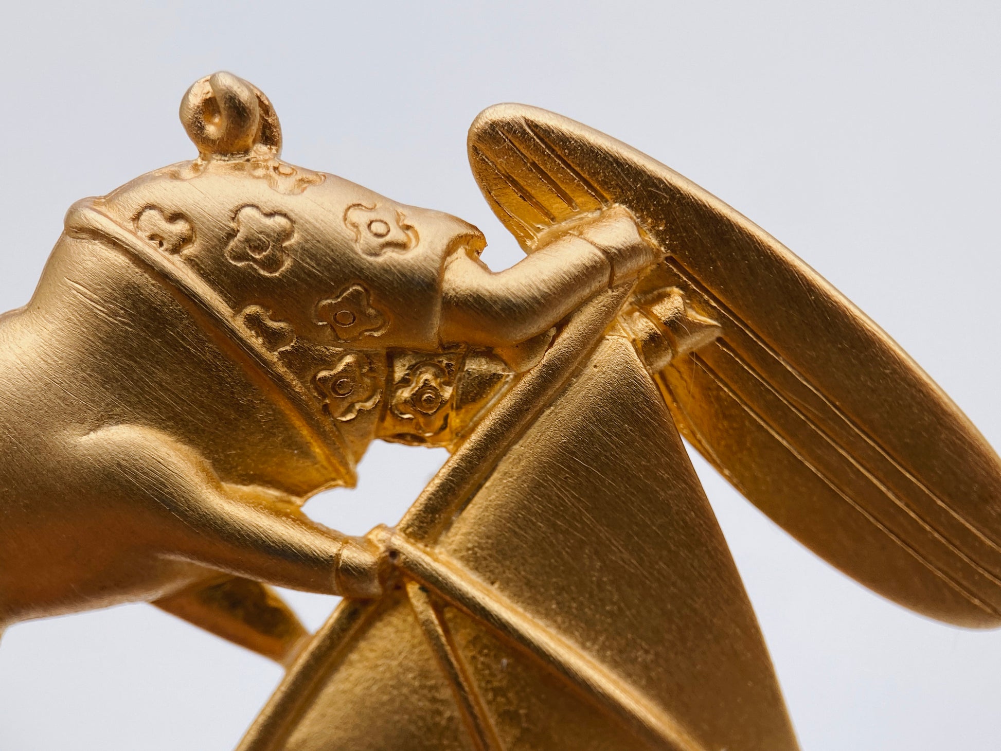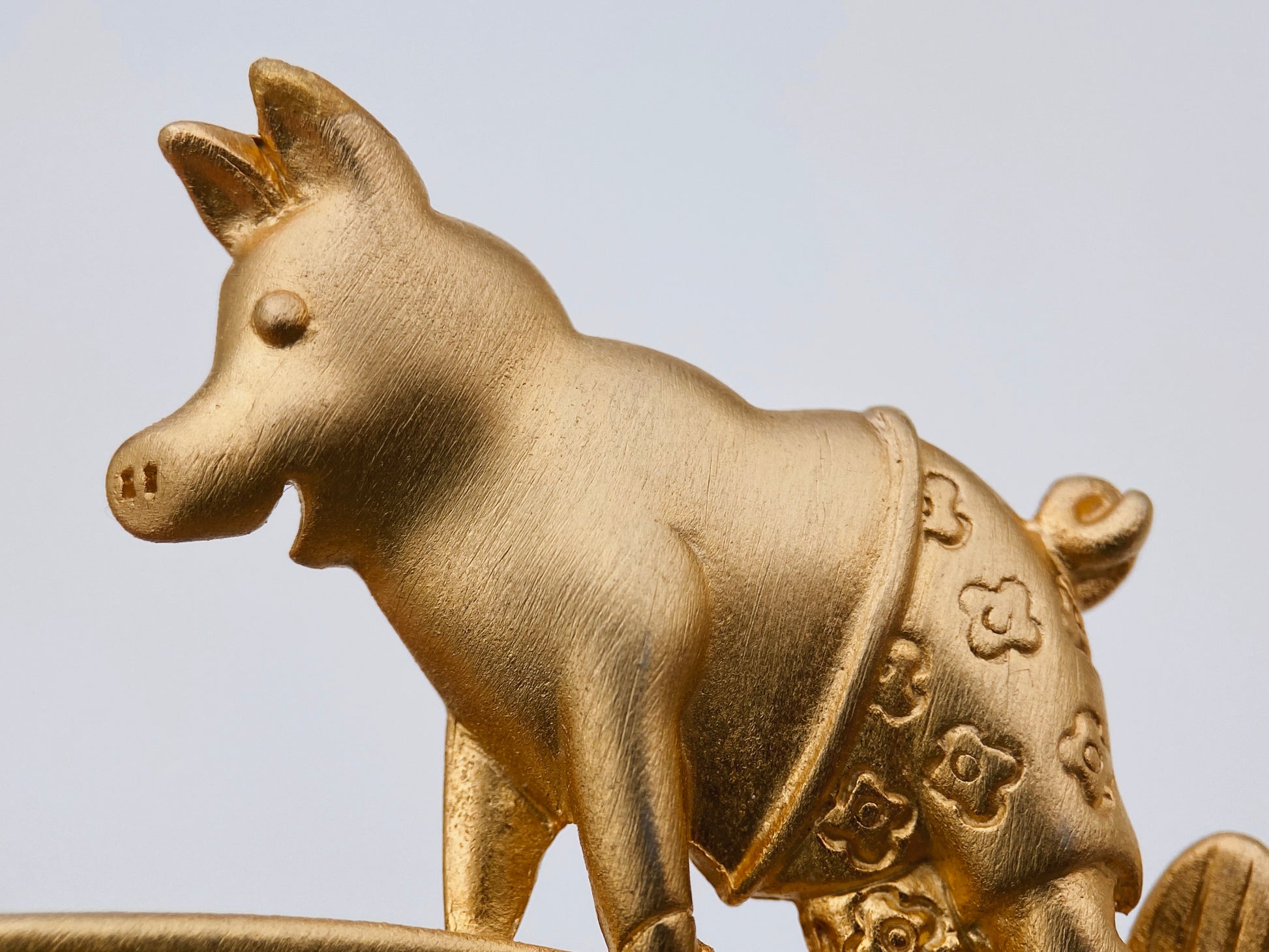 Žaisminga vintažinė "Jonette Jewelry” sagė iš 1980–1990 m. laikotarpio, vaizduojanti auksaspalvį paršiuką su gėlėtais šortais, plaukiantį banglente su bure. Kolekcinis, humoristinis dizainas – puiki dovana ar linksmas aksesuaras.