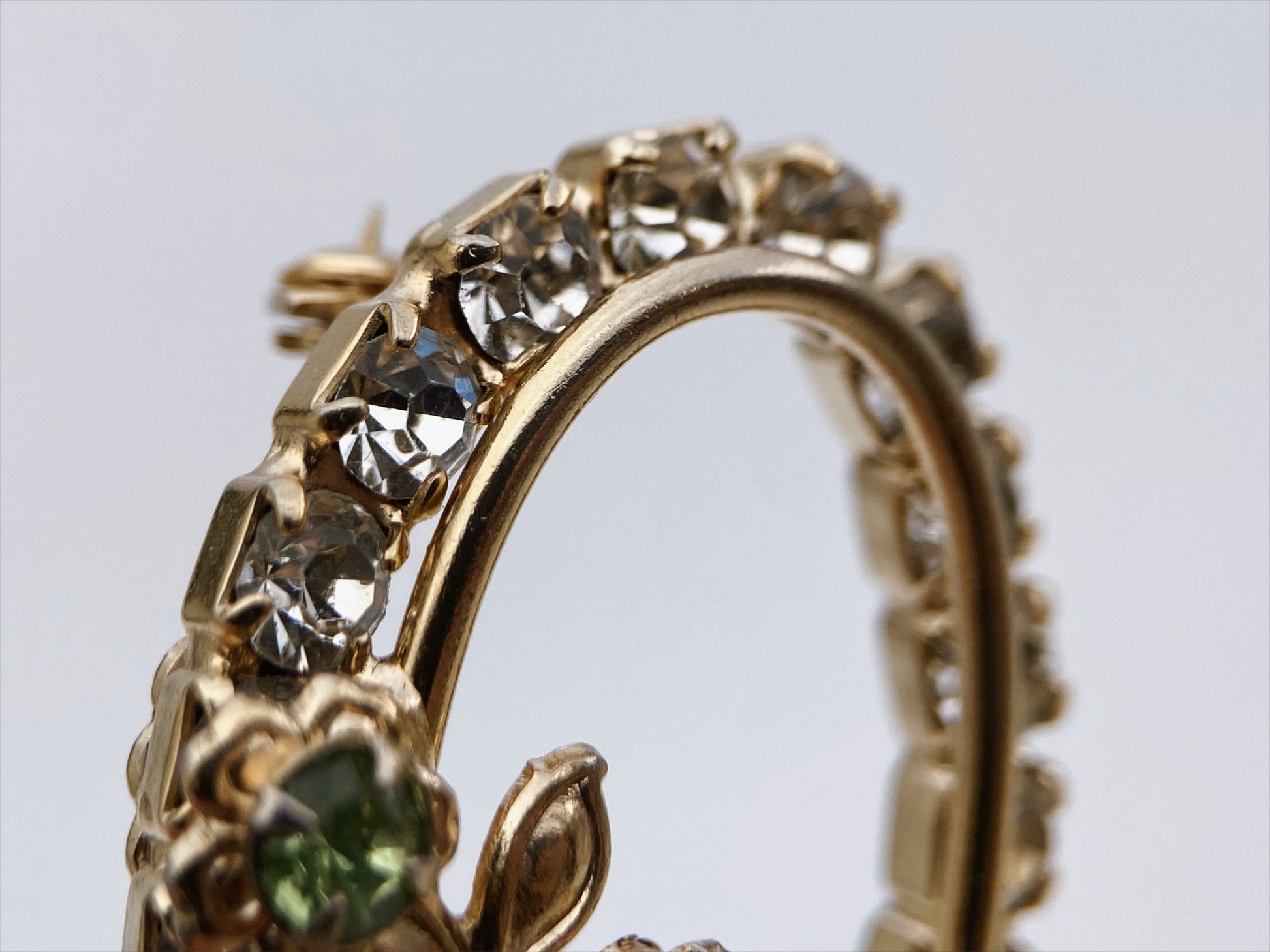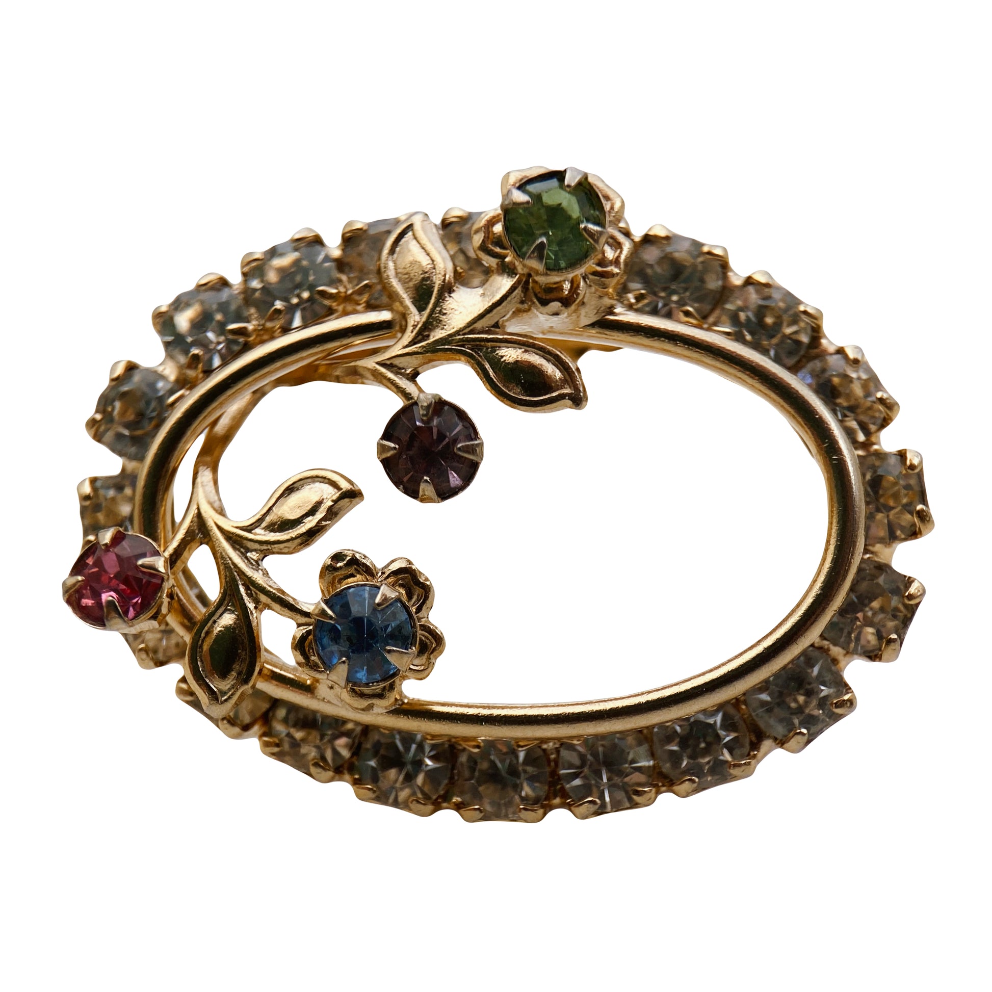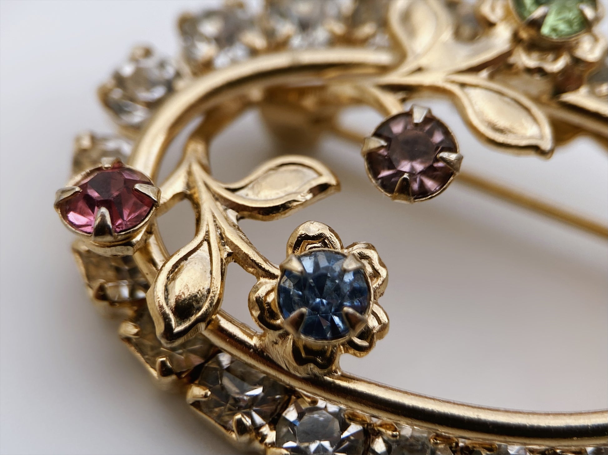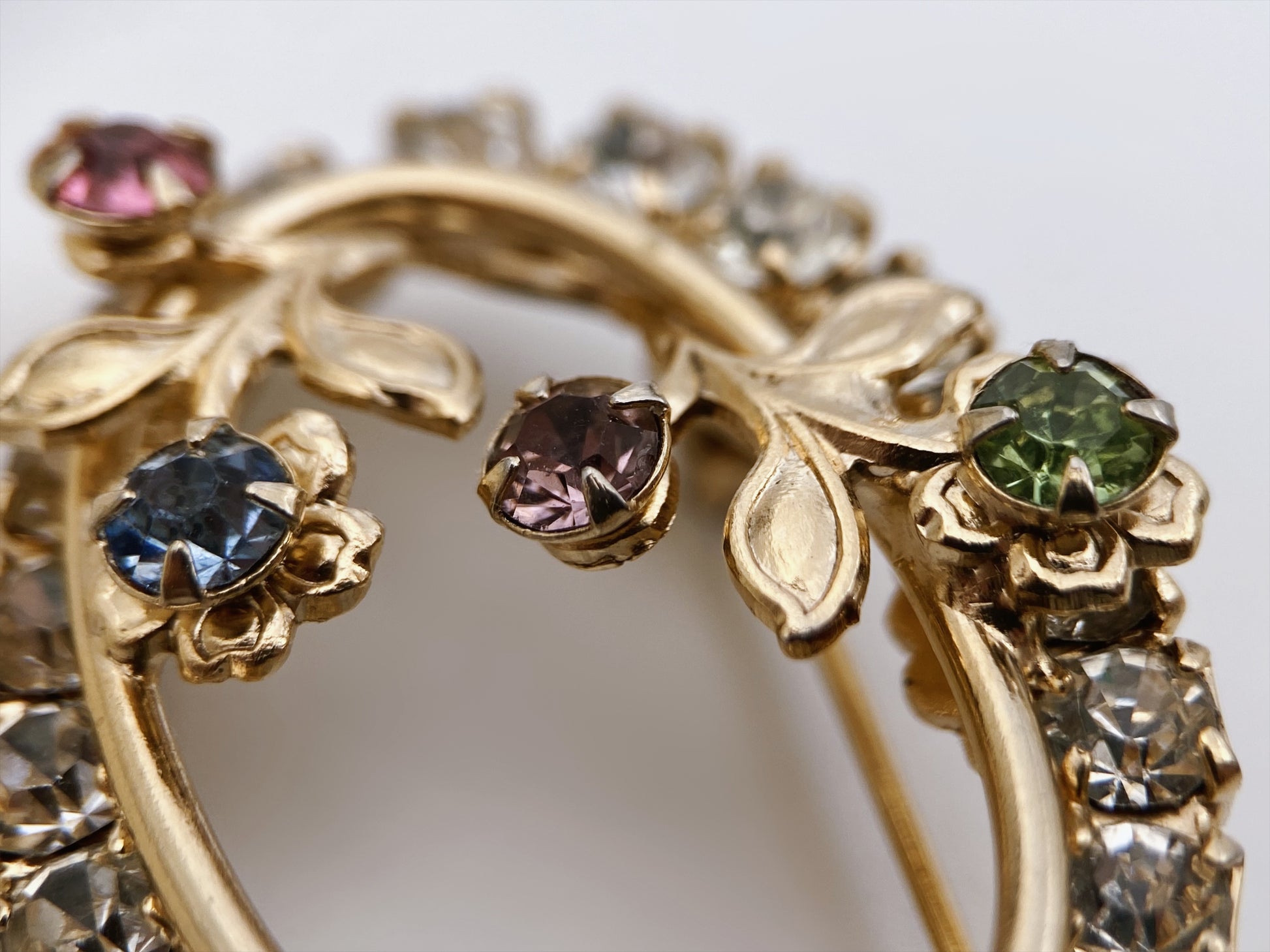 Sudėtis: metalas, kristalai Būklė: labai gera Išmatavimai: 2,7 x 3,7 cm Spalva: aukso, žalia, mėlyna, violetinė, rožinė, balta Žymėjimas: nėra Šalis: JAV Laikotarpis: 1955-1965 metai Rinkos vertė: 15-20 EUR
