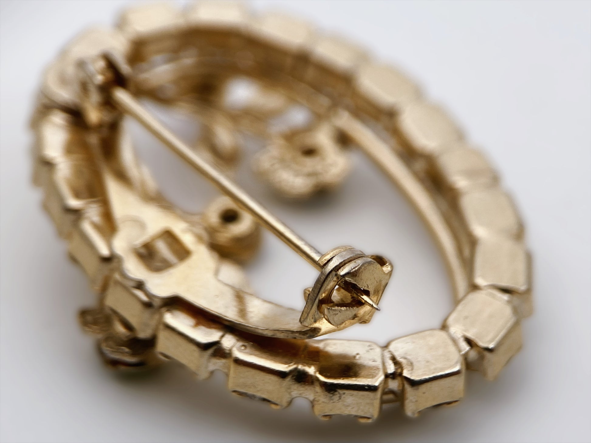 Ovalios formos, lengvo lydinio, aukso spalvos korpusas. Per vidurį – stilizuota vijoklio / šakelės kompozicija su spalvotais kristalais, įstatytais į gėlių formas. Išorinis ovalas aplink visą sagę išdėstytas skaidriais kristalais. Nugarėlėje – klasikinis amerikietiškas suktuko užsegimas. Be žymėjimo, bet pagal konstrukciją, metalą ir akmenukų išdėstymą priskirtina JAV masinei bižuterijai (panašu į Coro / Lisner / Judy Lee / Florenza stilistiką).