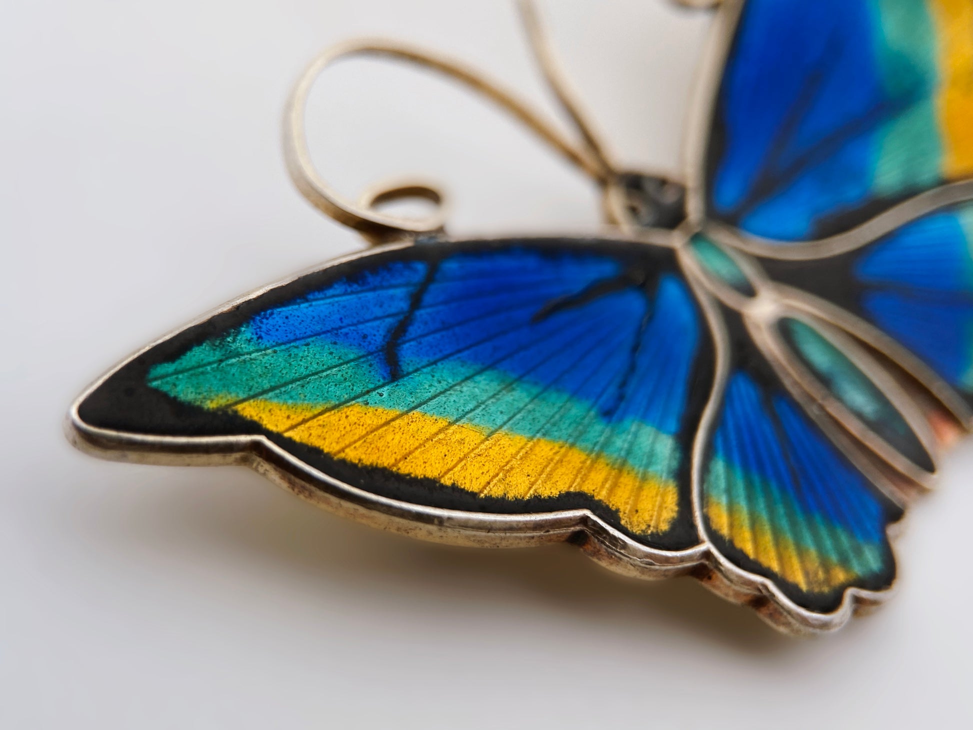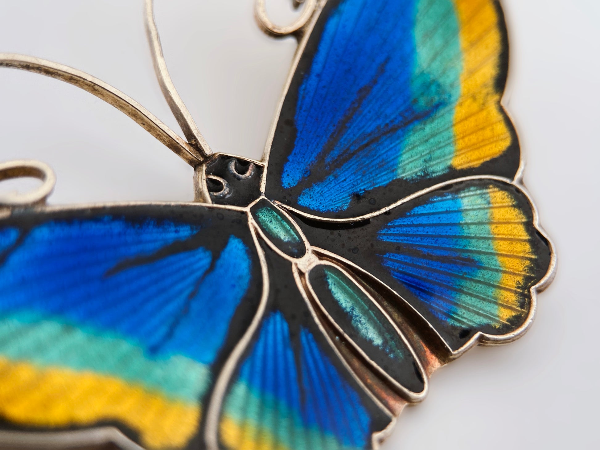 Tai vienas populiariausių ir labiausiai kolekcionuojamų jų modelių – garsieji “guilloché” emalio drugeliai, gaminti nuo ~1950 iki ~1970 m. Guilloché emalis (skaidrus emalis ant graviruoto sidabro – suteikia spindesį ir gylį). Spalvinė gama (mėlyna–žalia–geltona) atitinka retus tropinių drugelių modelius, kurie rinkoje vertinami aukščiausiai.