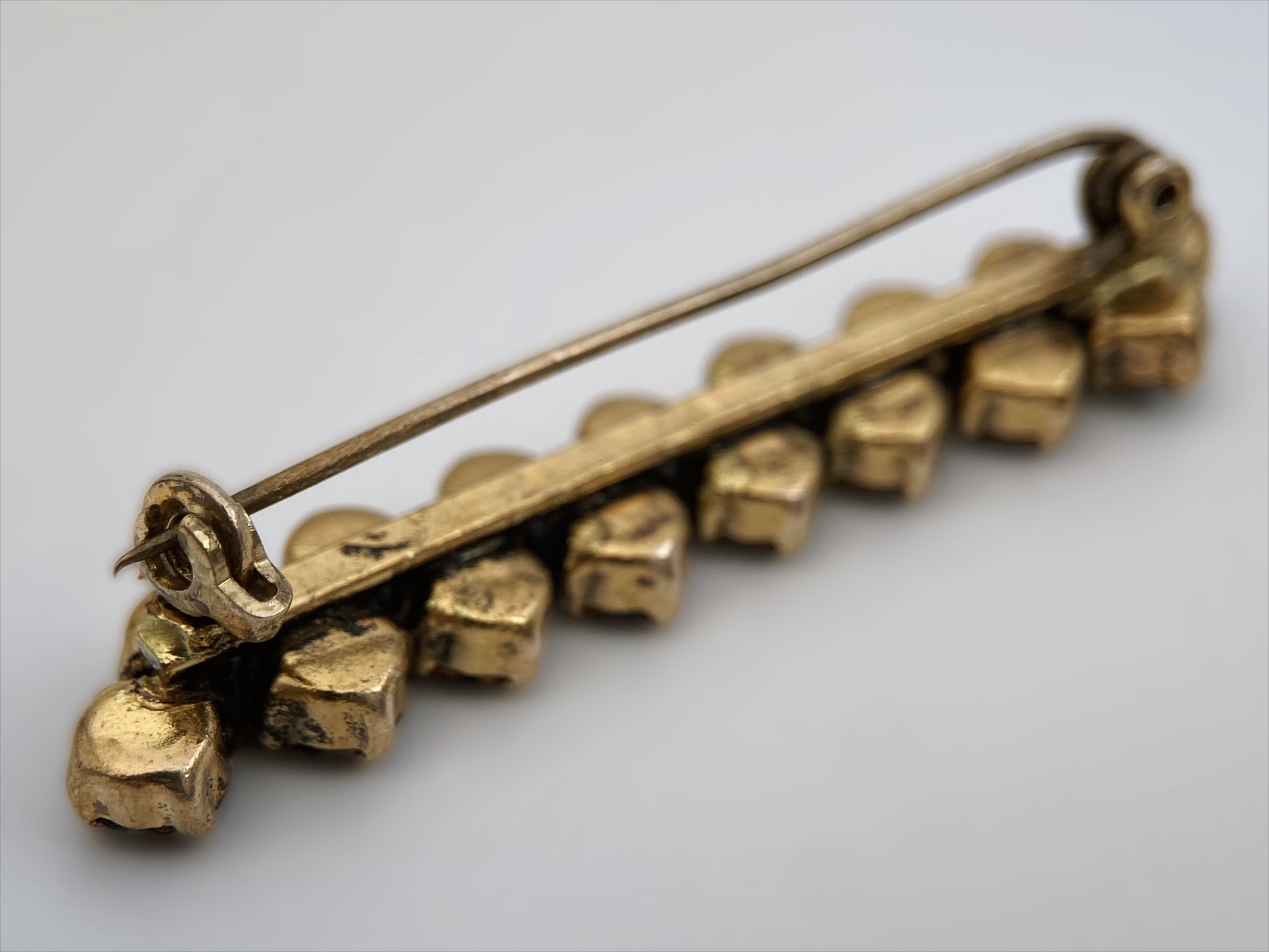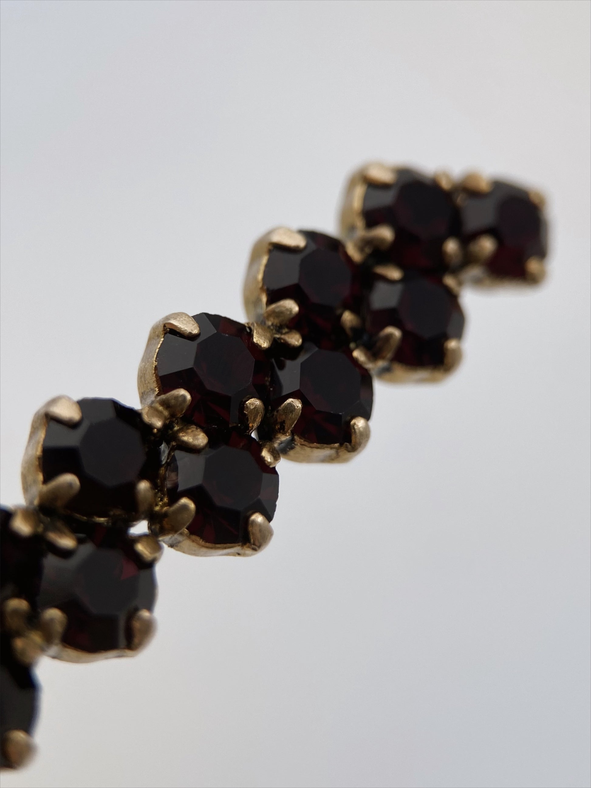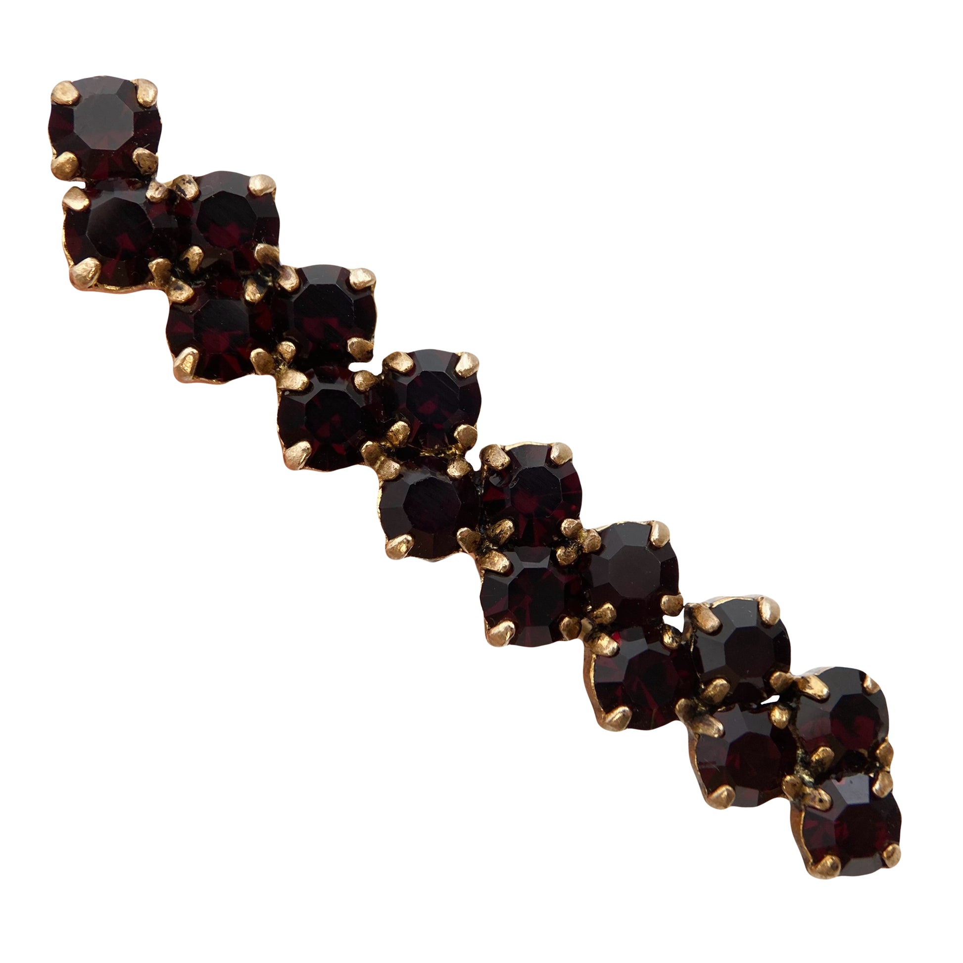 Vintažinė 1950–1970 m. segė su tamsiai bordo spalvos stiklo kristalais, įstatytais aukso spalvos metalo pagrinde. Klasikinis „garnet glass“ stilius, įkvėptas Bohemijos tradicijų. Senovinis “C-clasp” užsegimas, rankiniu būdu lituota adata.
