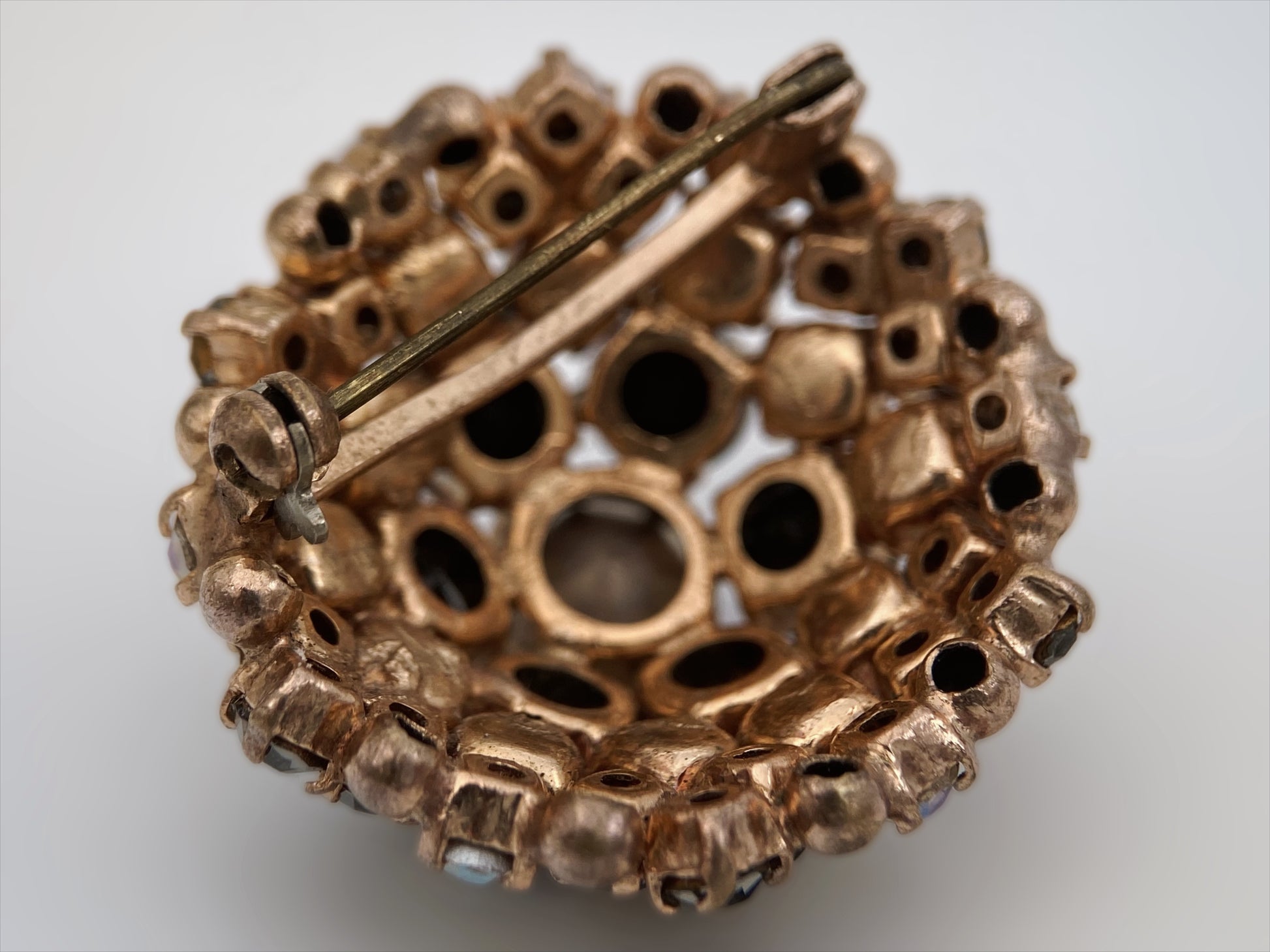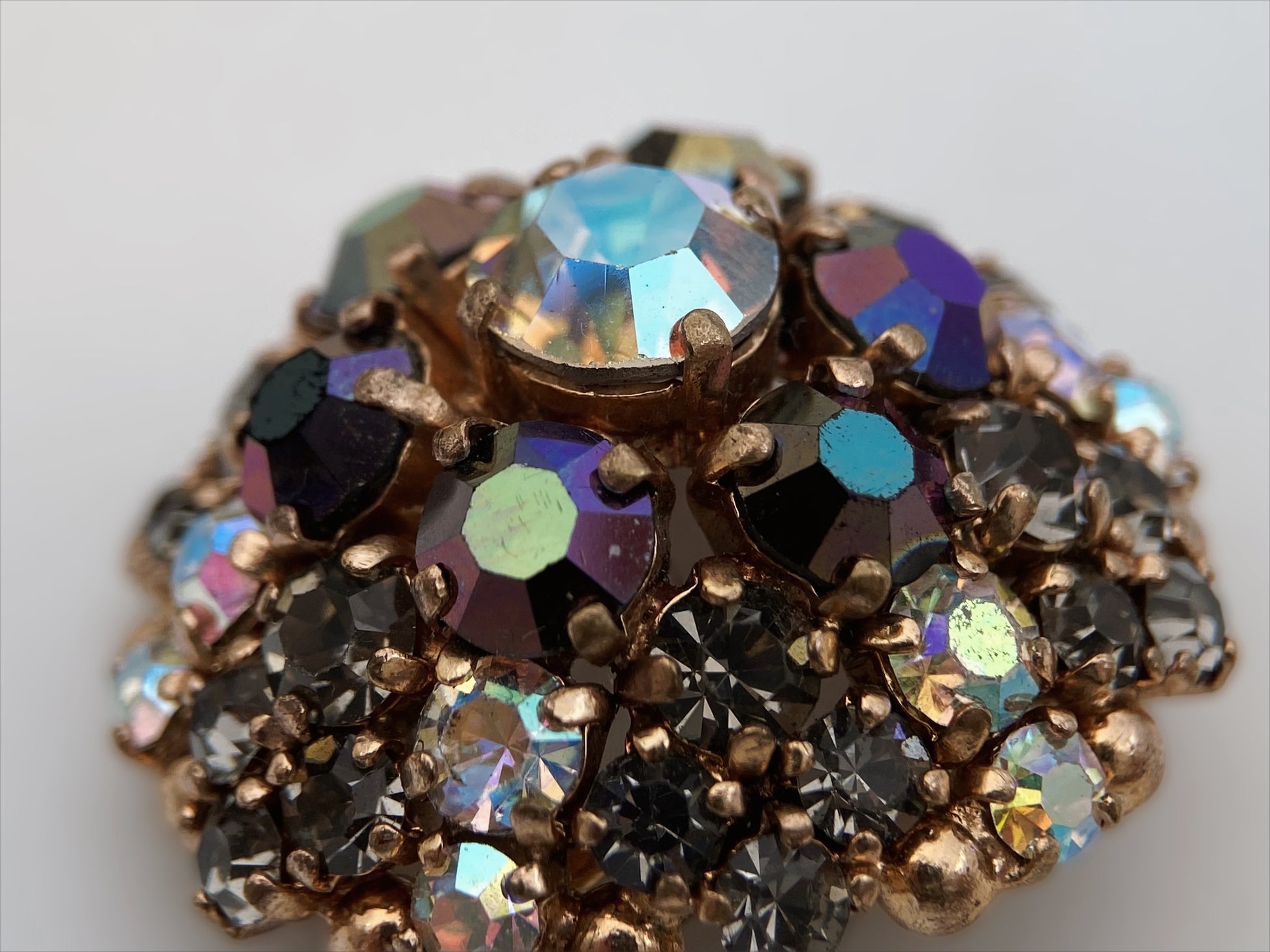 Sudėtis: metalas, Aurora Borealis dengti stiklo kristalai Būklė: labai gera Išmatavimai: 3 cm Spalva: pilka, rausva, skaidri Šalis: Vokietija Žymėjimas: nėra Laikotarpis: 1955-1965 metai Rinkos vertė: 30-40 EUR