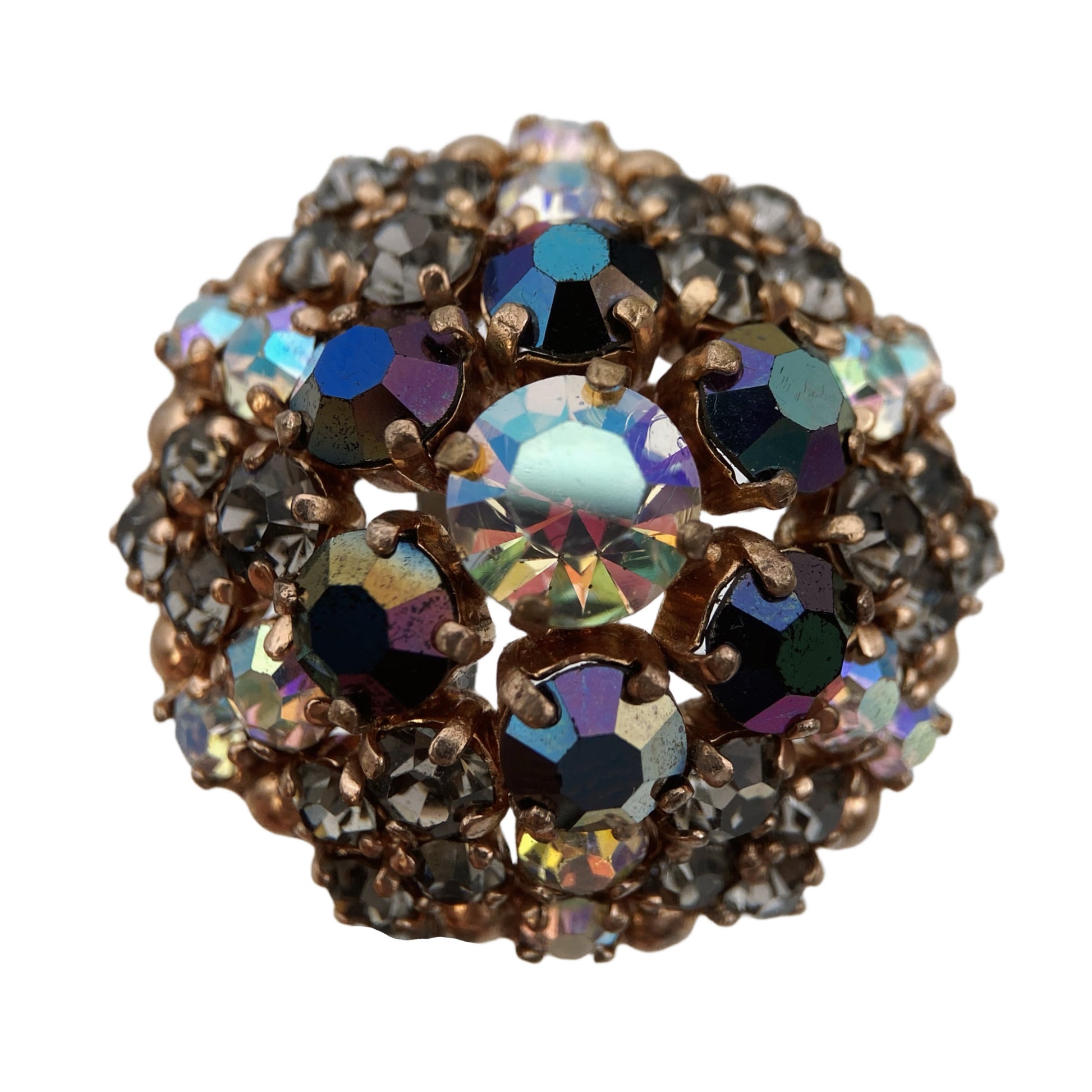 Vintažinė kupolo formos sagė su Aurora Borealis (AB) kristalais. AB danga buvo išrasta Swarovski 1955 m. ir tapo itin populiari 1955–1965 m. Spindinti “mid-century” stiliaus sagė, dekoruota daugiaspalviais AB dangos stiklo kristalais ir grafito atspalvio kristalais. Auksinės spalvos metalo pagrindas, rankiniu būdu tvirtinti akmenys, subtilus kupolo formos dizainas. Puikios būklės, autentiškas XX a. vidurio papuošalas. Visi kristalai presuoti, vienodo pjūvio.