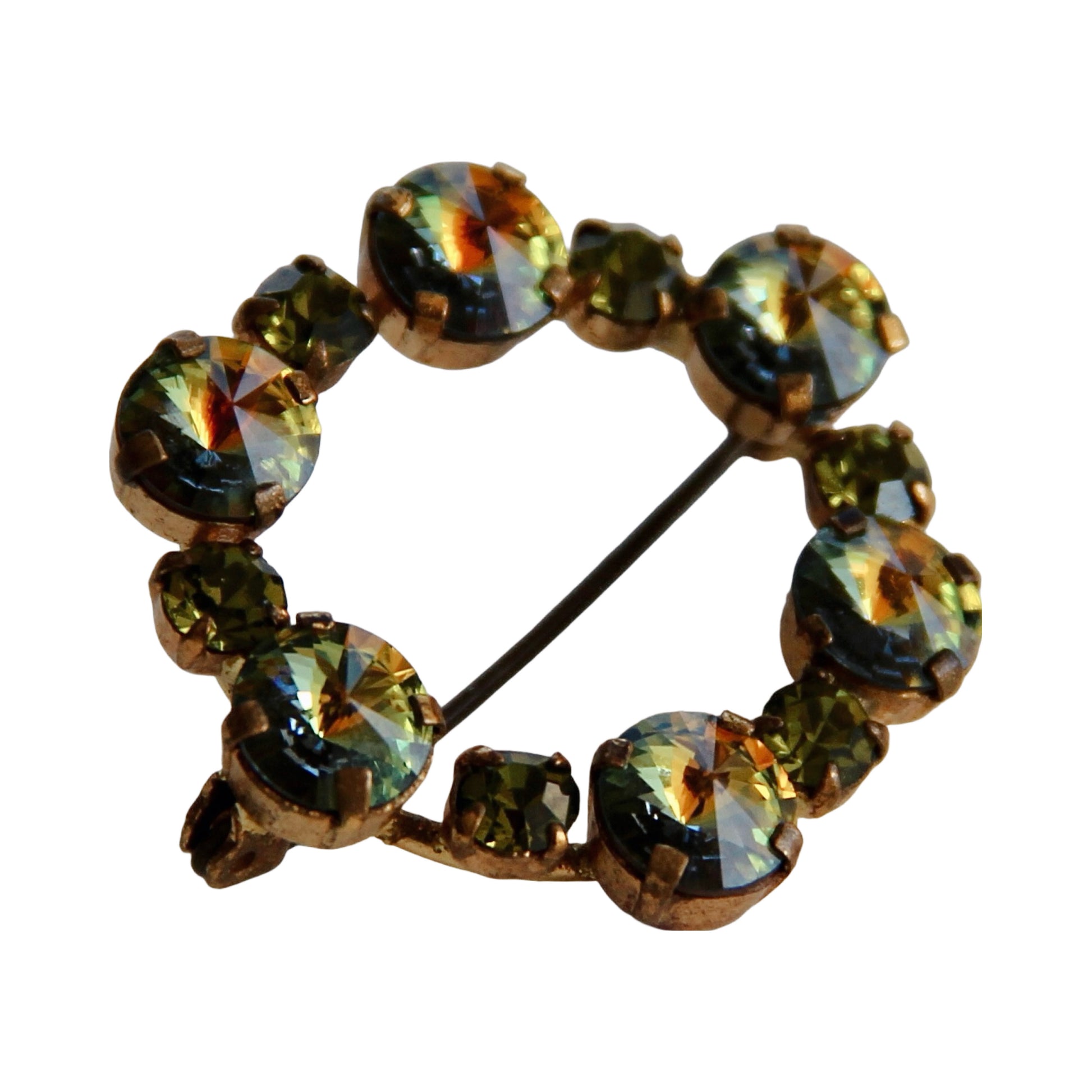 Maža, subtili, žiedinės formos segė, dekoruota žalsvais aurora borealis efekto kristalais. Metalas dengtas aukso spalva, segės užsegimas – su apsauginiu fiksatoriumi, būdingas vidurio XX a. dizainui.