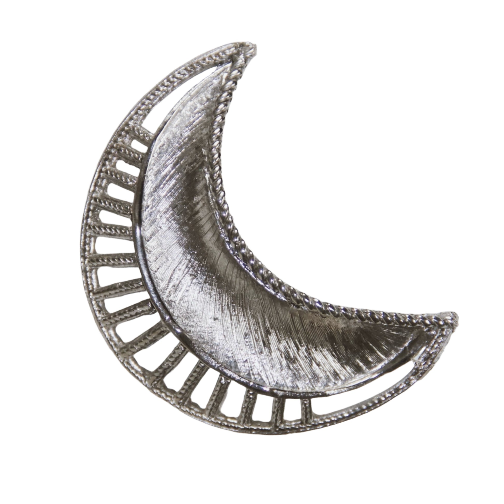 Ši sidabro spalvos segė, vaizduojanti mėnulio formą su ažūriniu kraštu, yra puikus “mid-century modern” stiliaus pavyzdys.