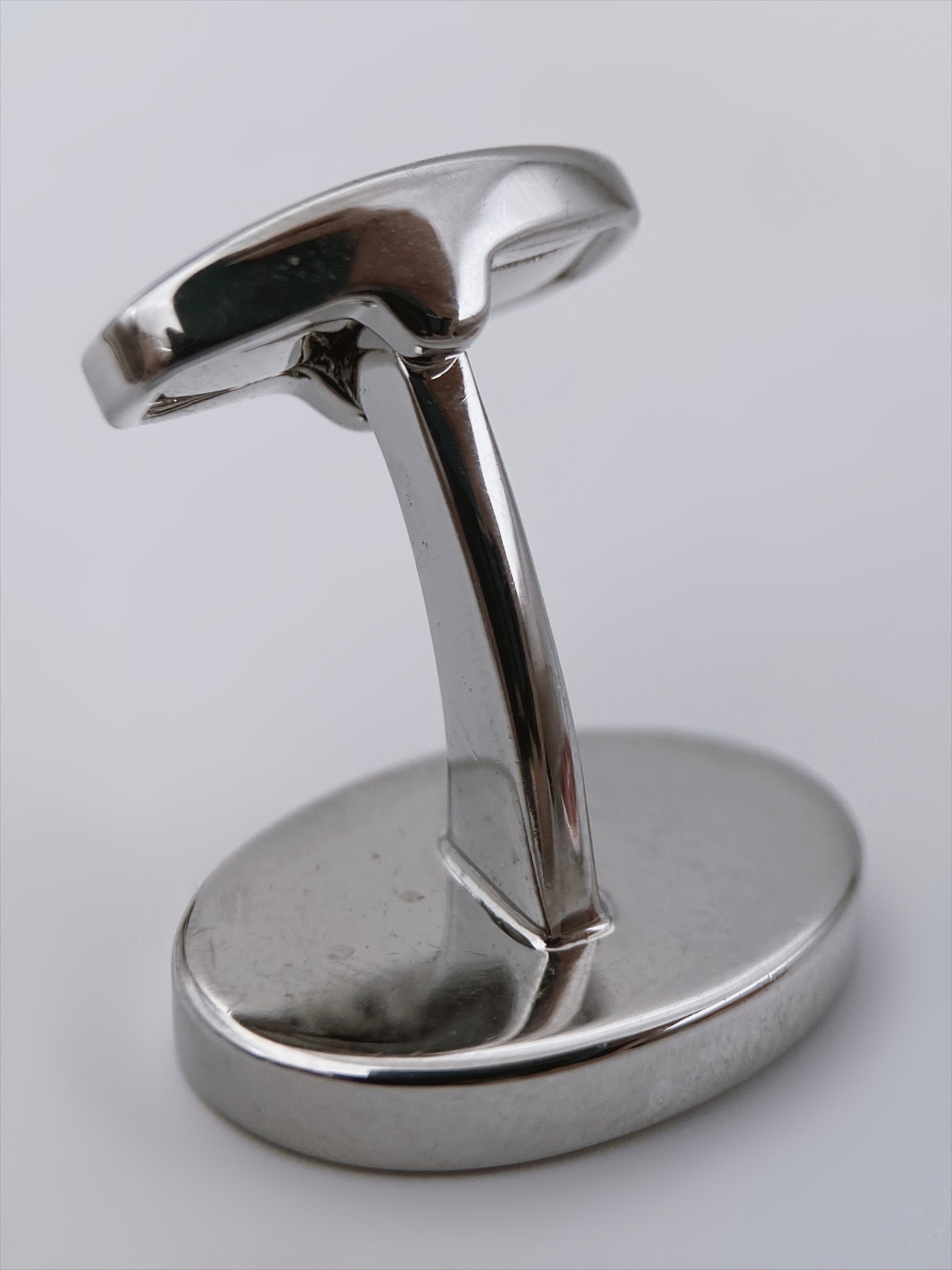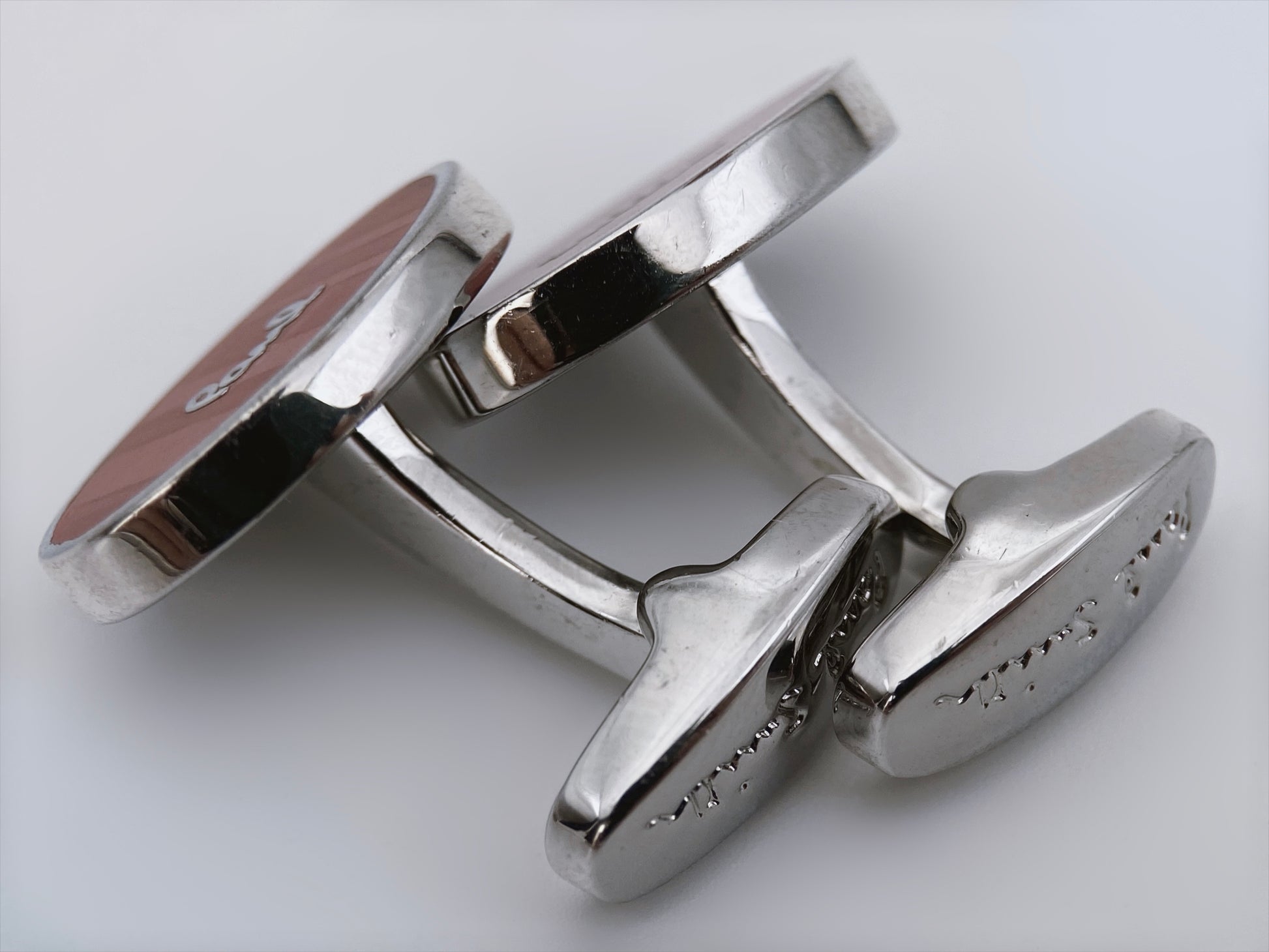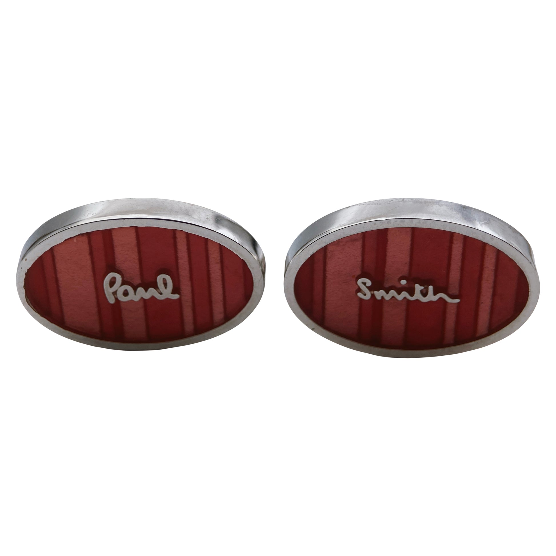 Stilingos ovalo formos sąsagos su raudonu fonu ir subtiliu vertikaliu dryžuotu raštu. Centre – sidabro spalvos įrašas „Paul Smith“ būdingu prekės ženklo ranka rašyto logotipo stiliumi. Pagamintos iš sidabro spalvos metalo lydinio, pasižymi moderniu britišku dizainu, būdingu Paul Smith aksesuarams.