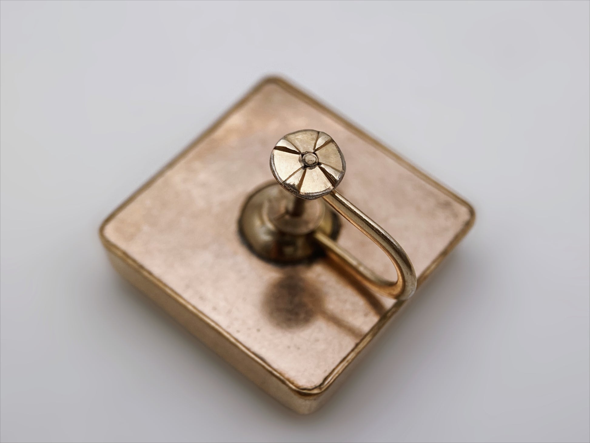 Sudėtis: paauksuotas metalas Būklė: labai gera Išmatavimai: 1,9 x 1,9 cm Spalva: aukso, tamsiai žalia Šalis: JAV Žymėjimas: “1/20 12K GF” Laikotarpis: 1930-1940 metai Rinkos vertė: 40-60 EUR