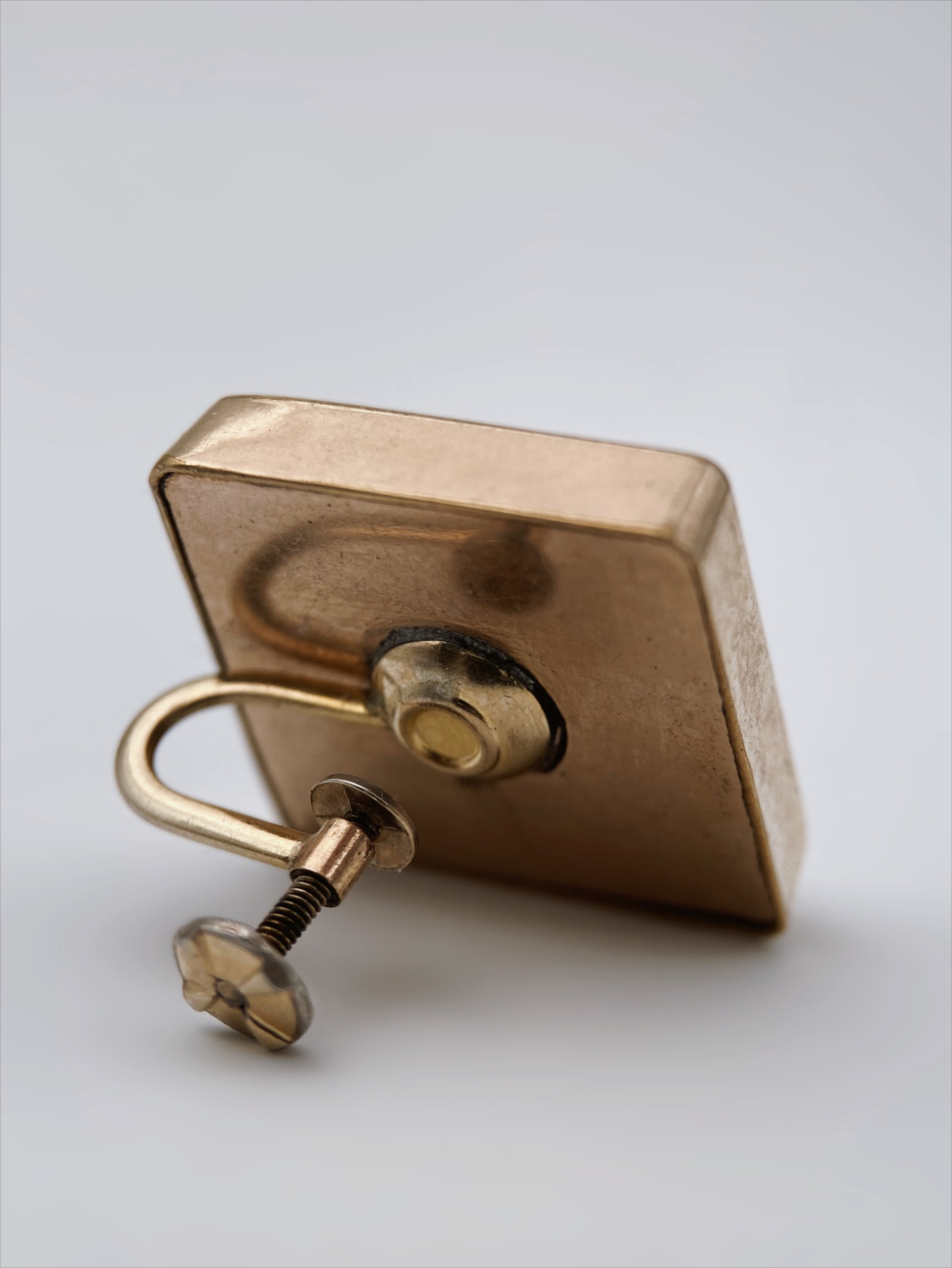 Vintažiniai JAV gamybos sraigtiniai auskarai, 1/20 12K Gold Filled. Stačiakampio formos dizainas su tamsiai žaliu akmeniu. Klasikinis Art Deco / XX a. vidurio stilius. Matomos nežymios dėvėjimo žymės, būdingos vintažiniam papuošalui.