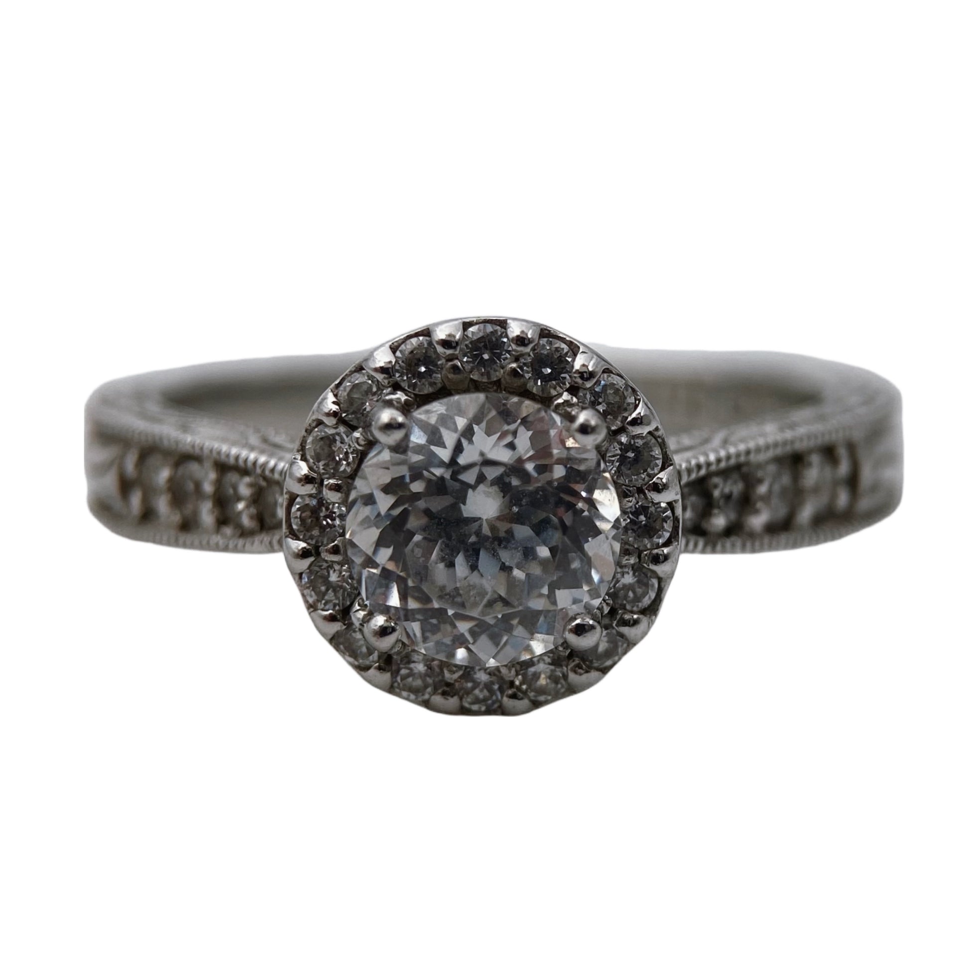 Tai labai gražus ir kruopščiai dekoruotas žiedas. “Tacori” – prestižinis amerikiečių juvelyrikos prekinis ženklas, žinomas dėl išskirtinio meistriškumo ir romantiško, vintažo įkvėpto dizaino. “Cubic zirconia” (CZ) – cirkonis, optiškai labai panašus į deimantą, bet sintetinė medžiaga. „Antique-style halo“ stliaus žiedas – pagrindinis centrinis akmuo su mažesnių akmenukų vainikėliu ir ornamentuotais šonais. Graviruotas ornamentas ir “milgrain” kraštai – tipiški Tacori dizainui, ypač jų „Dantela“ ar „Classic Crescent“ kolekcijose. TACORI – JAV juvelyrikos namai, įkurti 1969 m. Los Andžele. Šiuo metu licencijuota “TACORI” gamyba vykdoma Kinijoje.